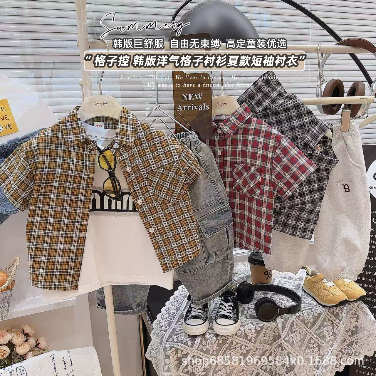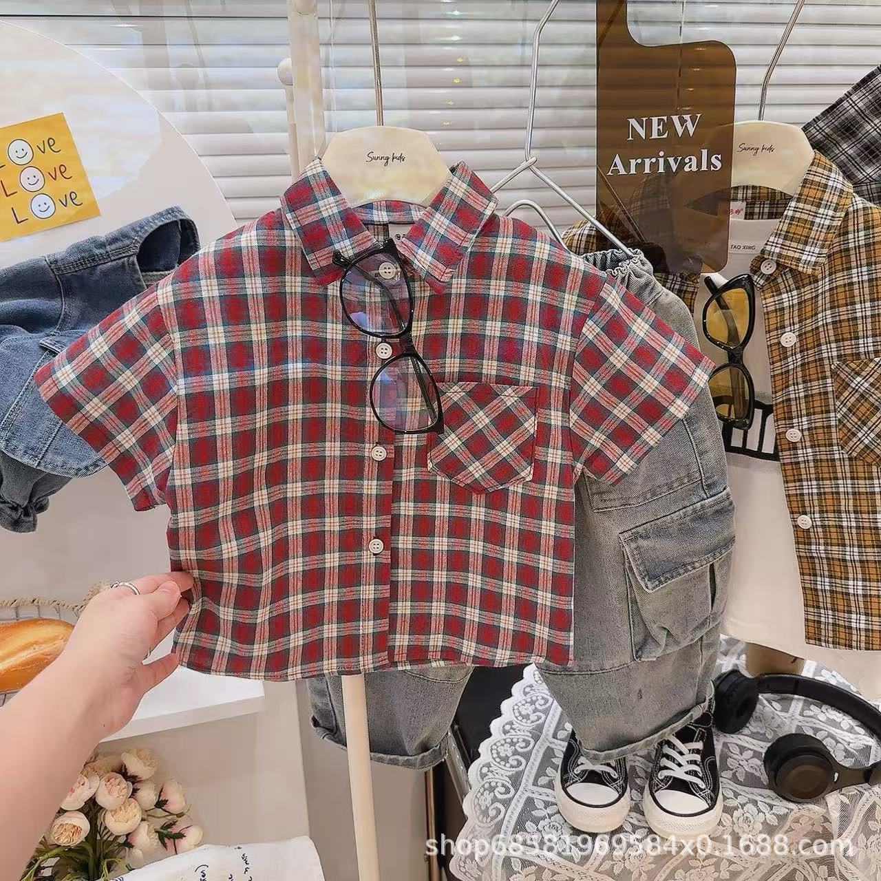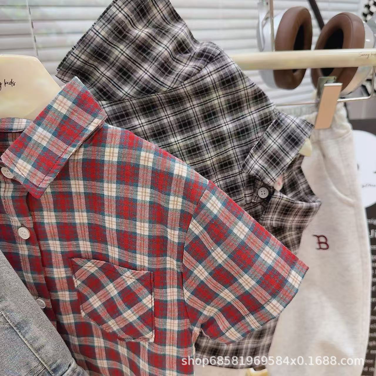 여름 한국식 잘 생긴 거대한 편안한 체크 무늬 컨트롤 한국식 체크 무늬 셔츠 여름 반팔 싱글 셔츠스토어 가기