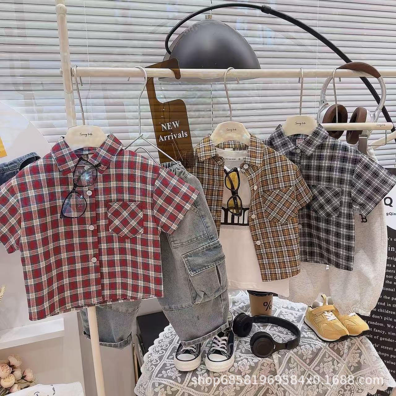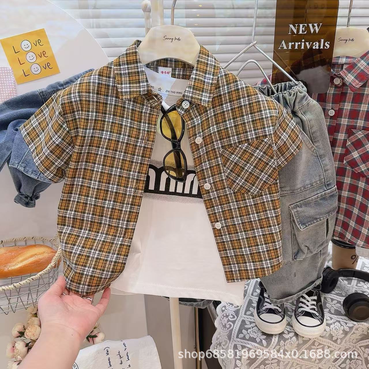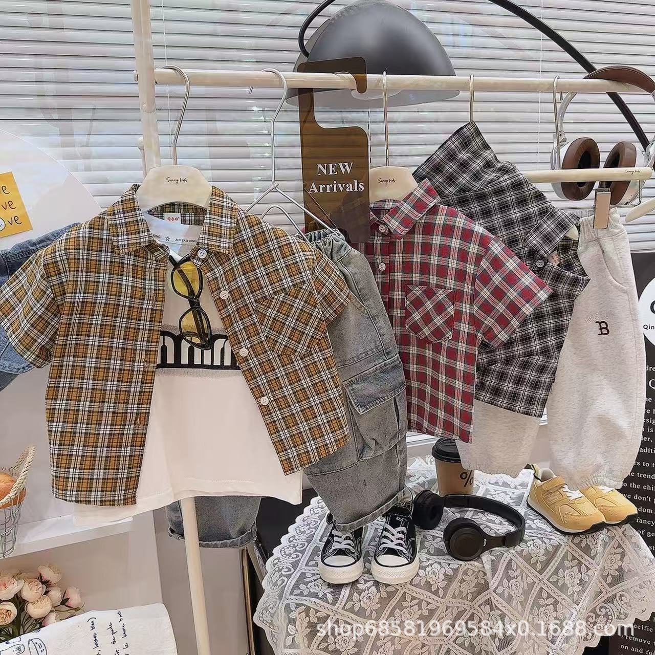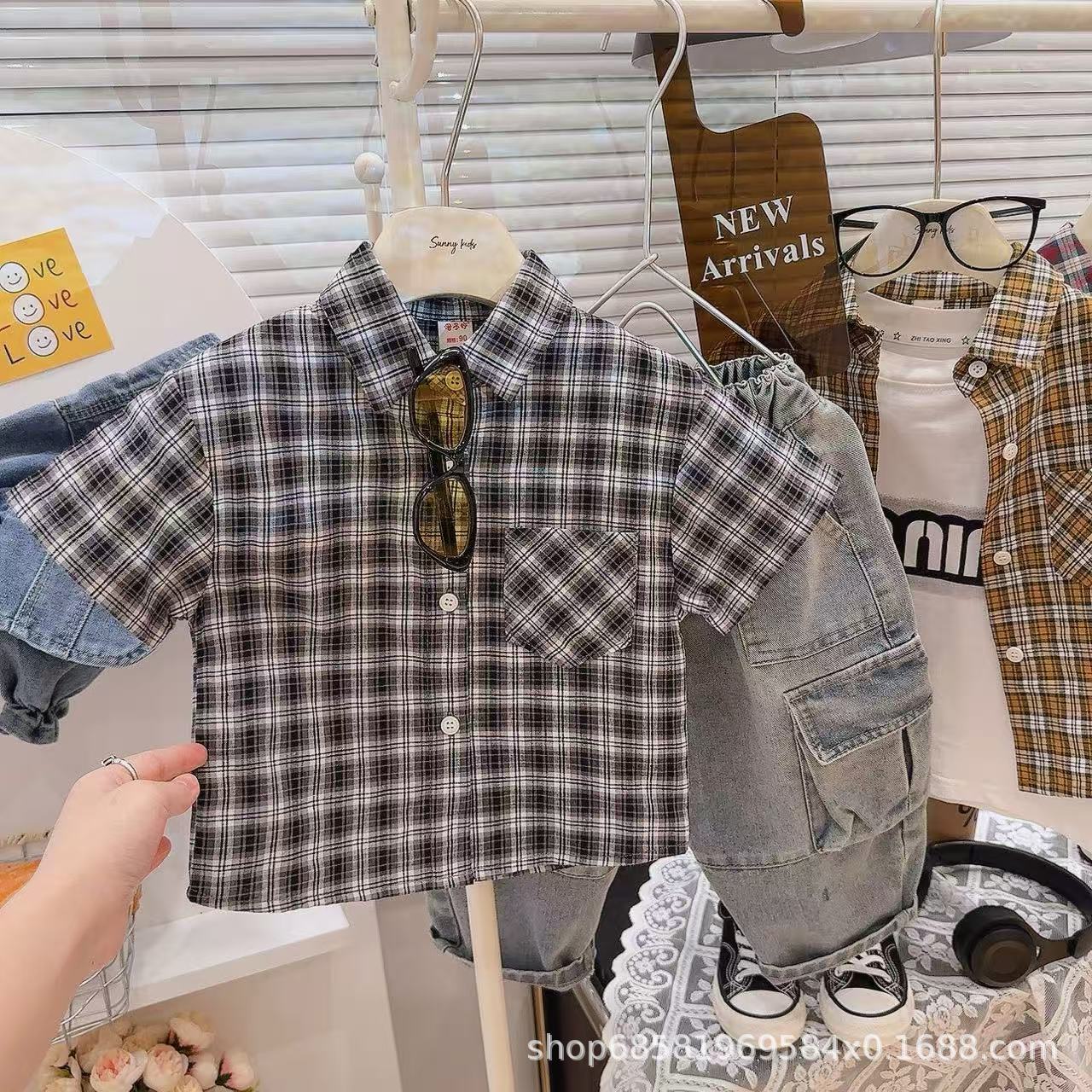 여름 한국식 잘 생긴 거대한 편안한 체크 무늬 컨트롤 한국식 체크 무늬 셔츠 여름 반팔 싱글 셔츠스토어 가기