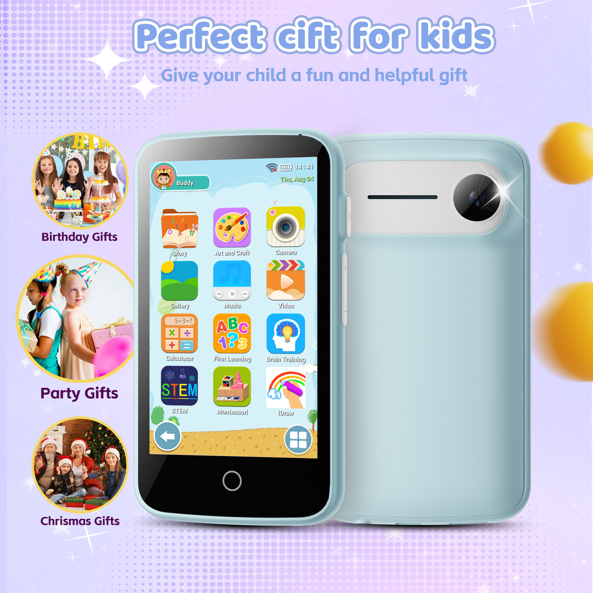 高清护眼大屏,内置200+益智小游戏、故事等,后置500W高清摄像头,小朋友随时拍照、摄像。