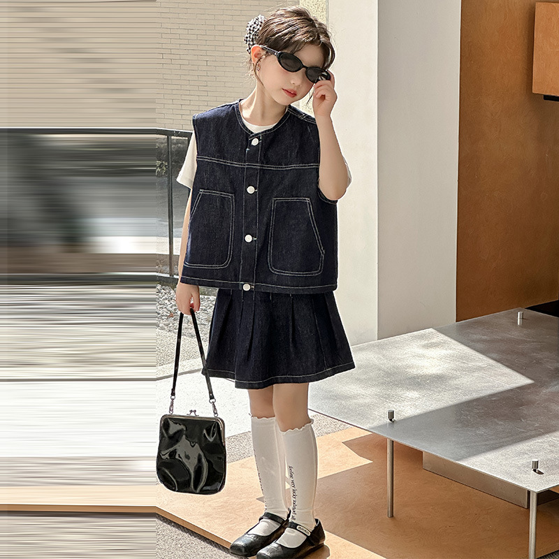 소녀 원피스 여름 2025 새로운 어린이 서양식 데님 조끼 3 피스 세트 소녀 여름 데님 스커트