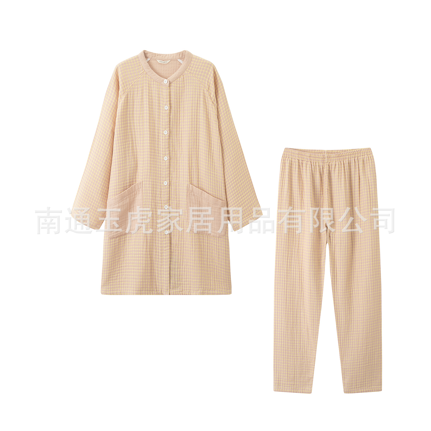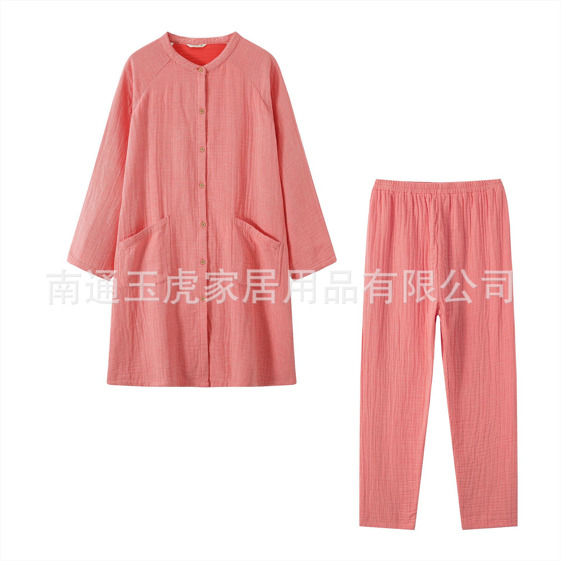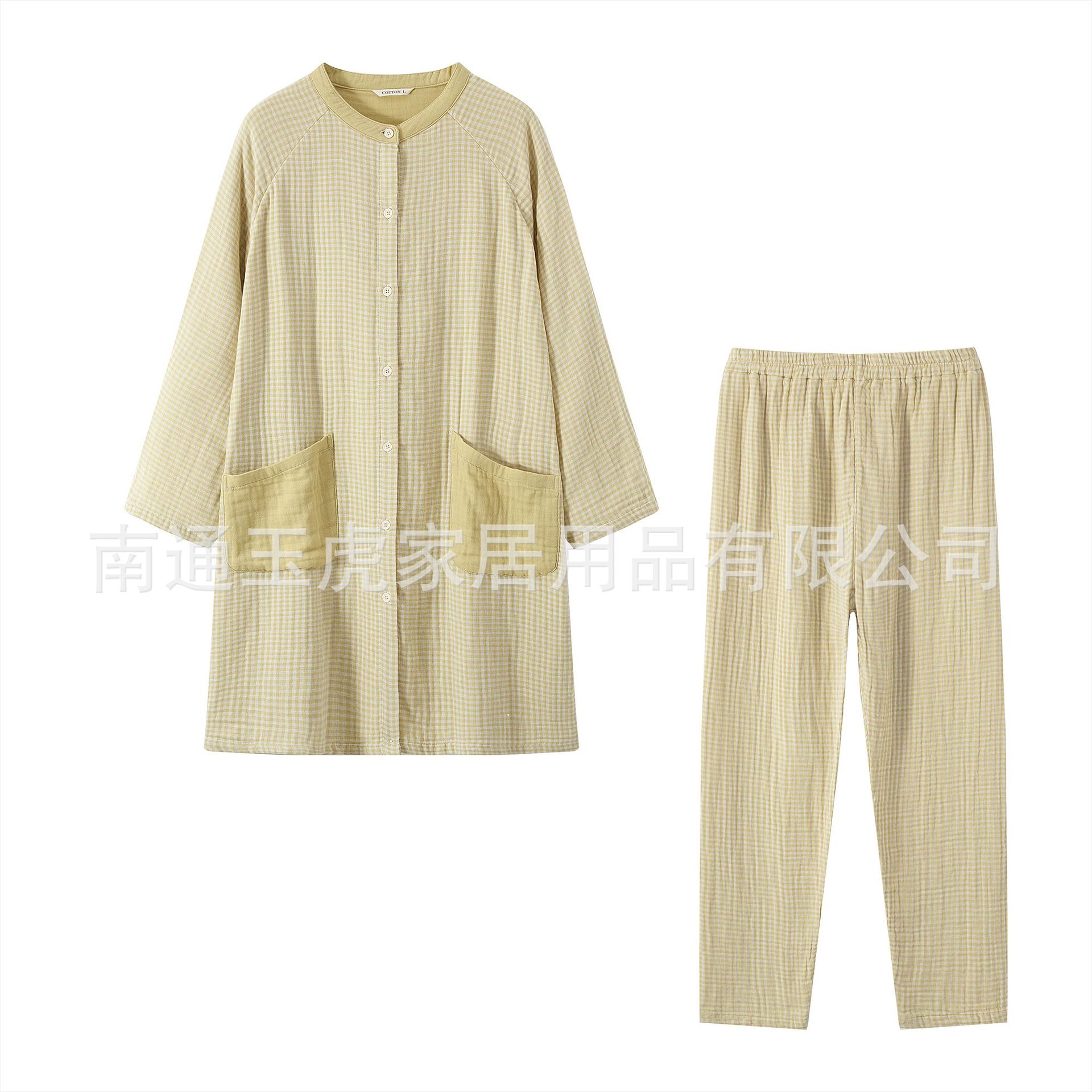 순수 코튼 일본식 순수 코튼 원사 염색 4 겹 원사 잠옷 여성 순수 코튼 원사 긴팔 홈웨어 작은 격자 무늬 바지 정장스토어 가기
