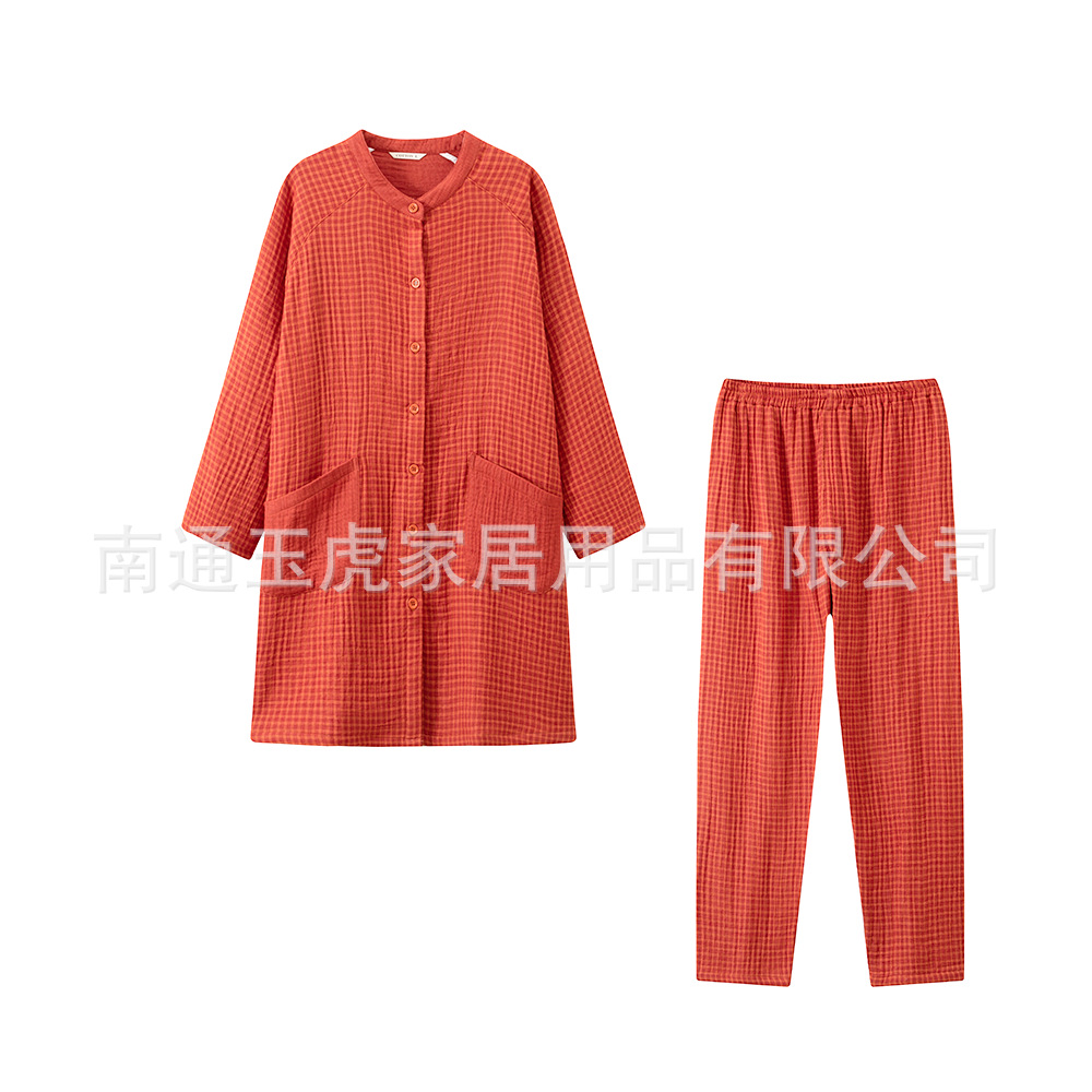 순수 코튼 일본식 순수 코튼 원사 염색 4 겹 원사 잠옷 여성 순수 코튼 원사 긴팔 홈웨어 작은 격자 무늬 바지 정장