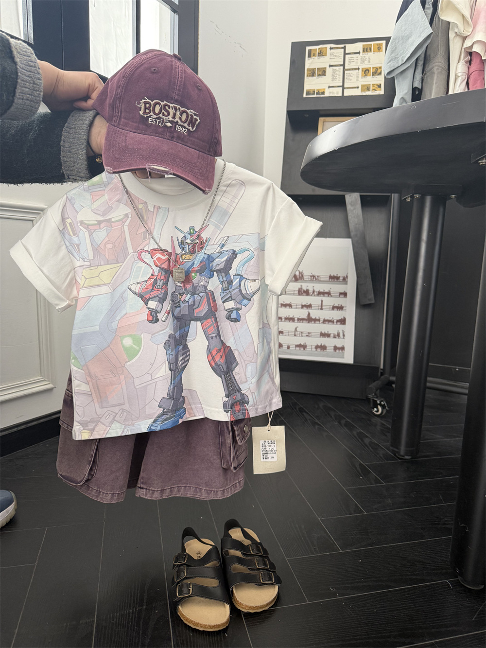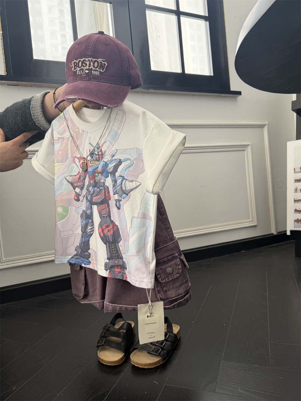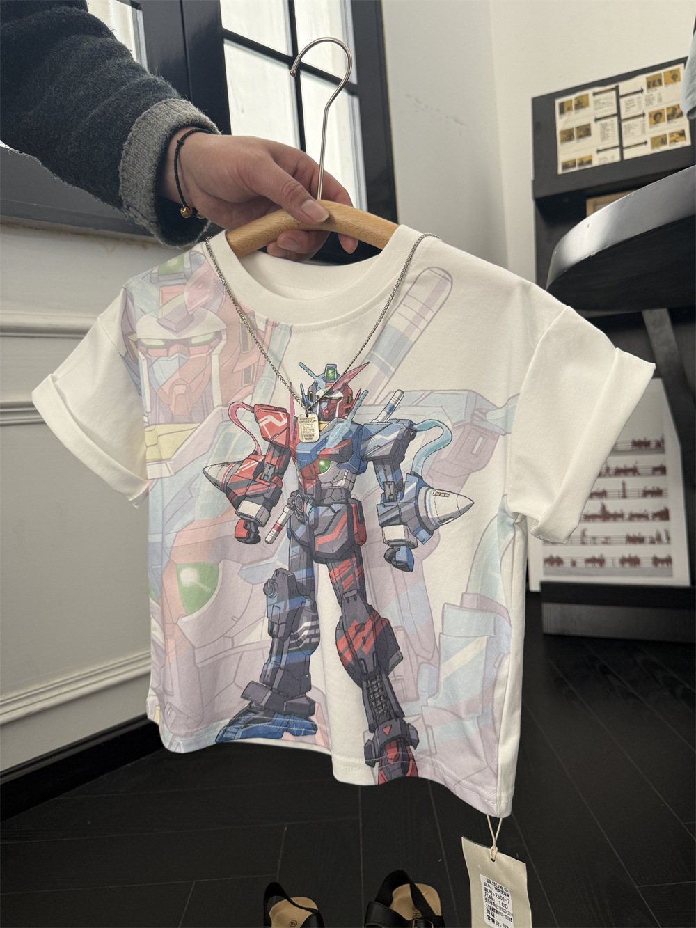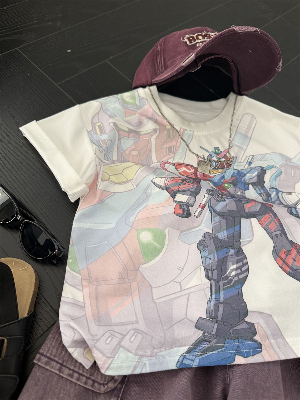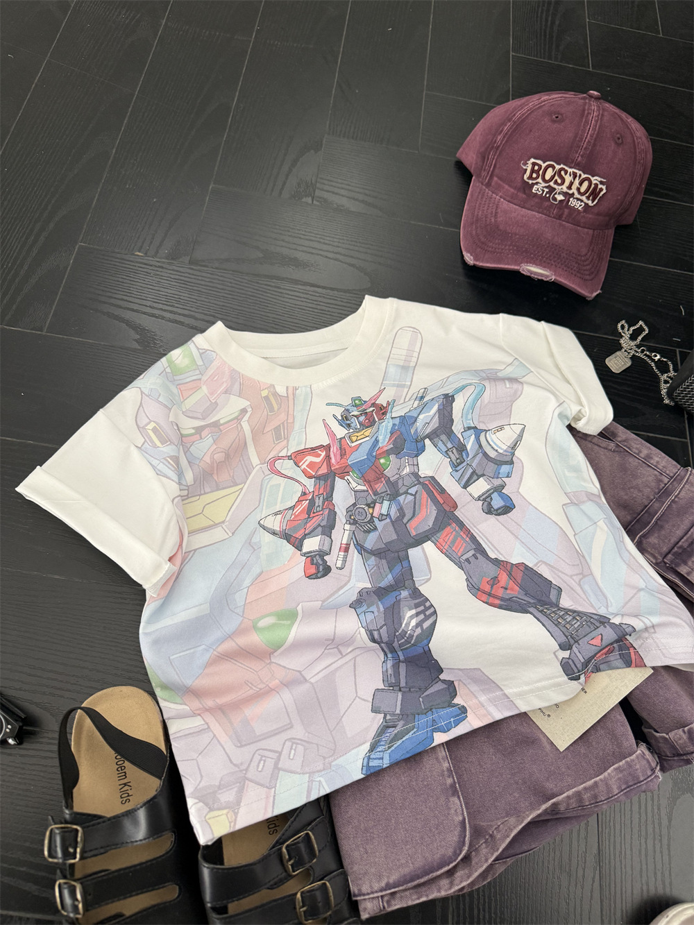 남자들의 여름 비 감각 인쇄 로봇 반팔 티셔츠 어린이 애니메이션 모바일 군인 간다 크루 넥 반소매 조수