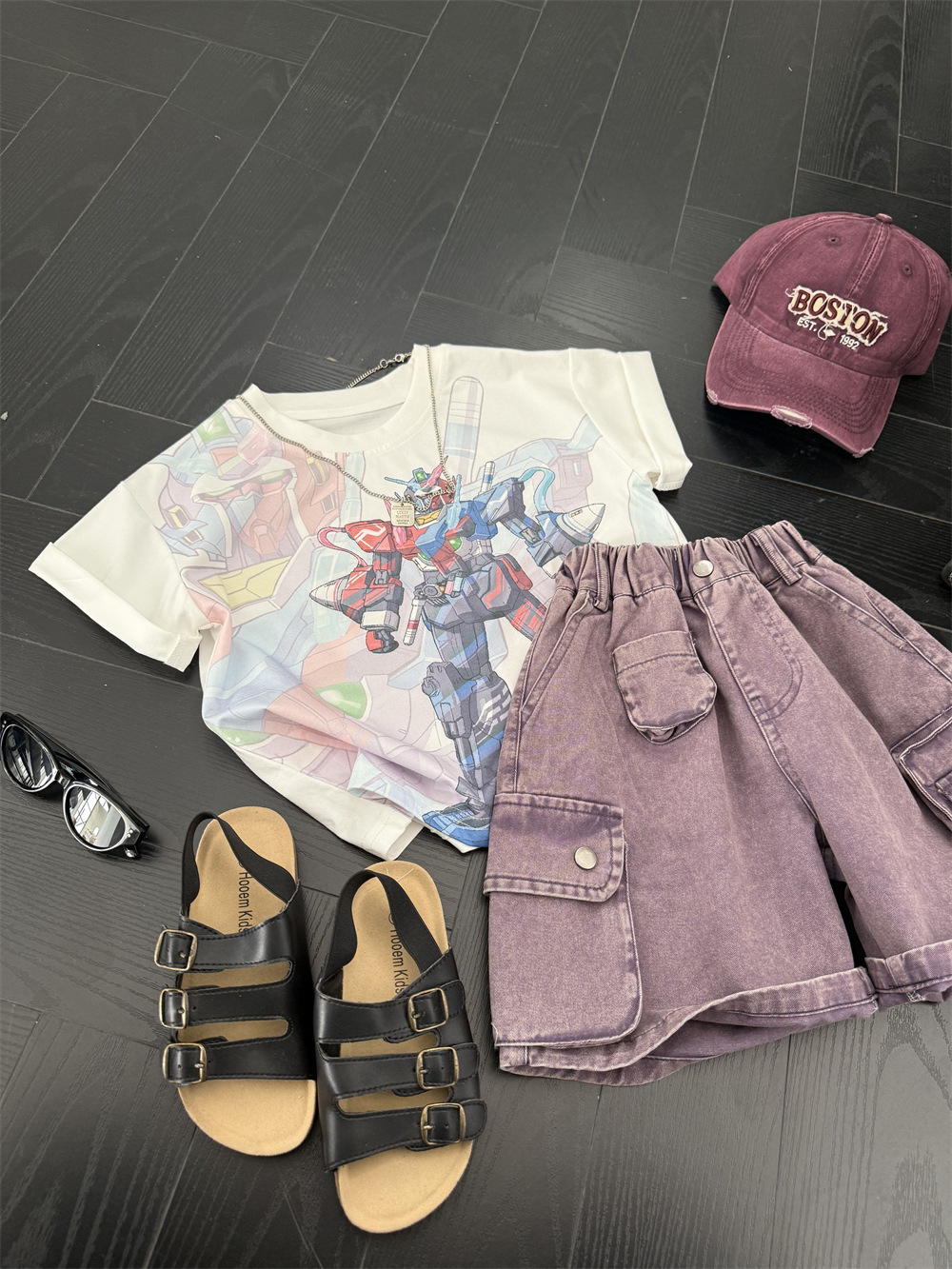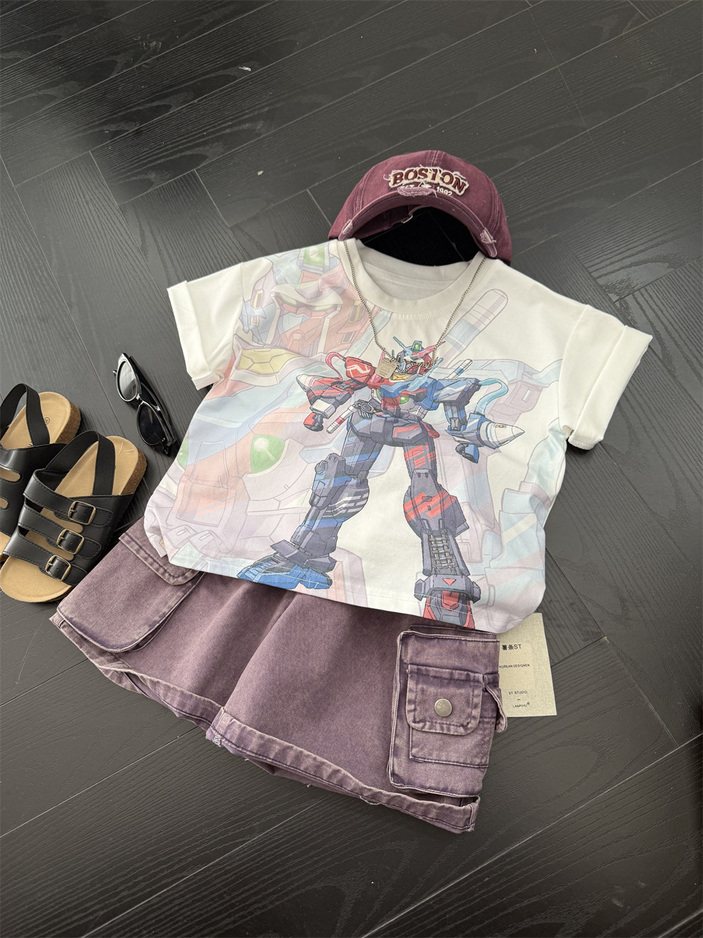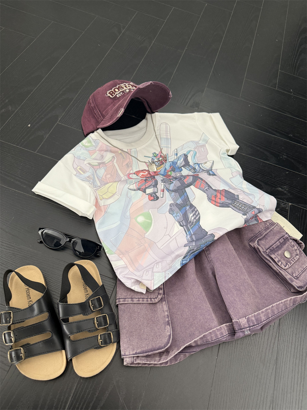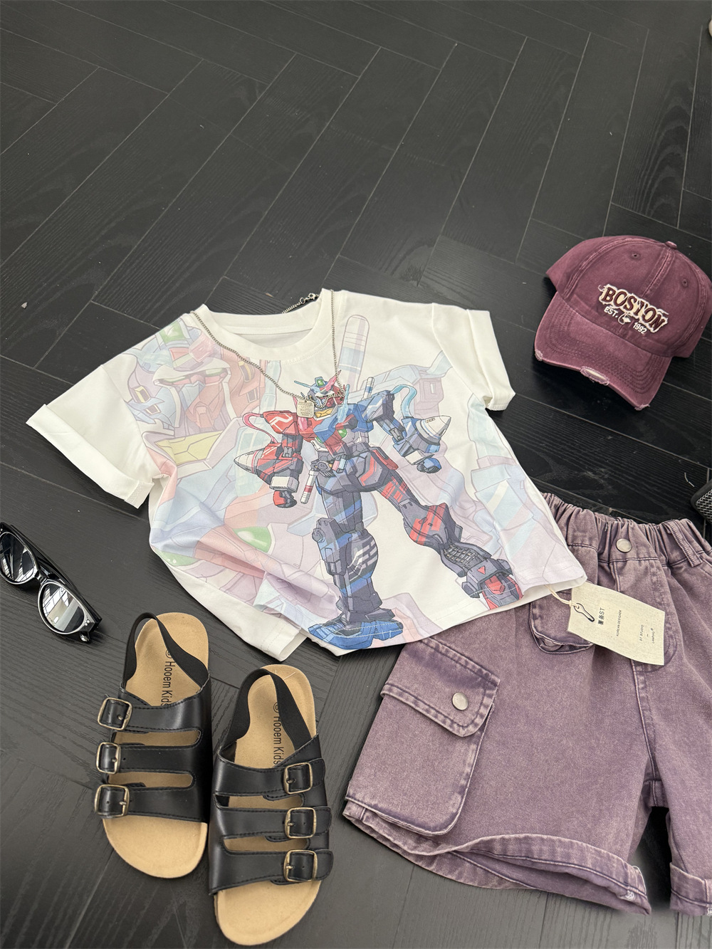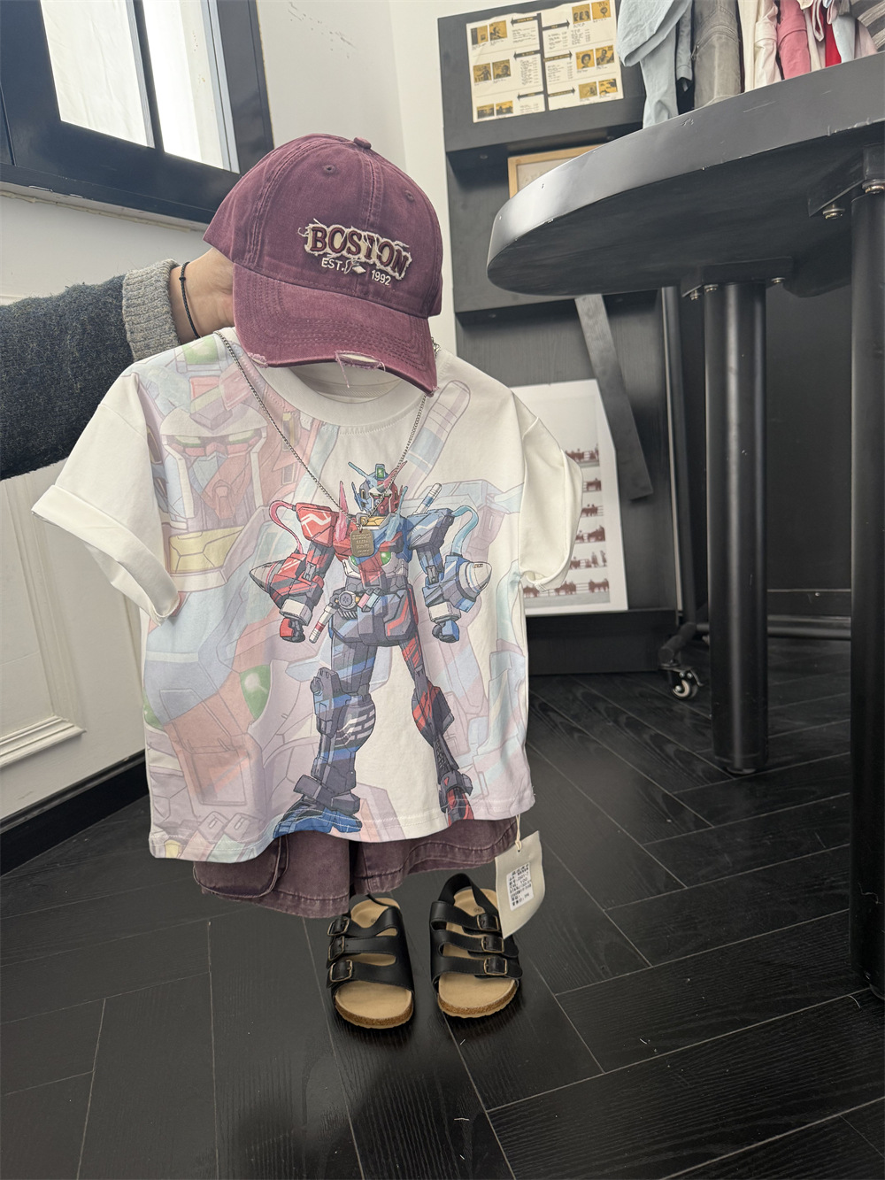 남자들의 여름 비 감각 인쇄 로봇 반팔 티셔츠 어린이 애니메이션 모바일 군인 간다 크루 넥 반소매 조수