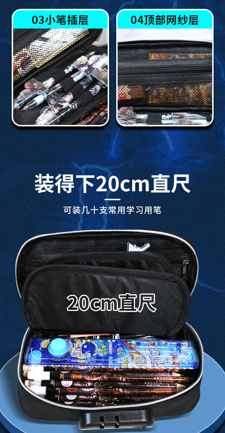 도매 검은 신화 조합 잠금 펜 케이스 소년 휴대용 4 층 문구 케이스 초등 및 중등 학생을위한 내강성 연필 케이스