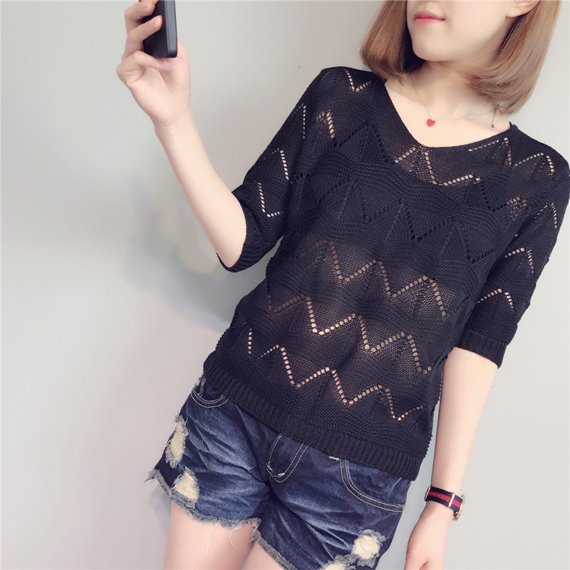 여름 중공 니트웨어 여성용 칼라 느슨한 단색 반팔 셔츠 대학 스타일 학생 얇은 풀오버 짧은 블라우스