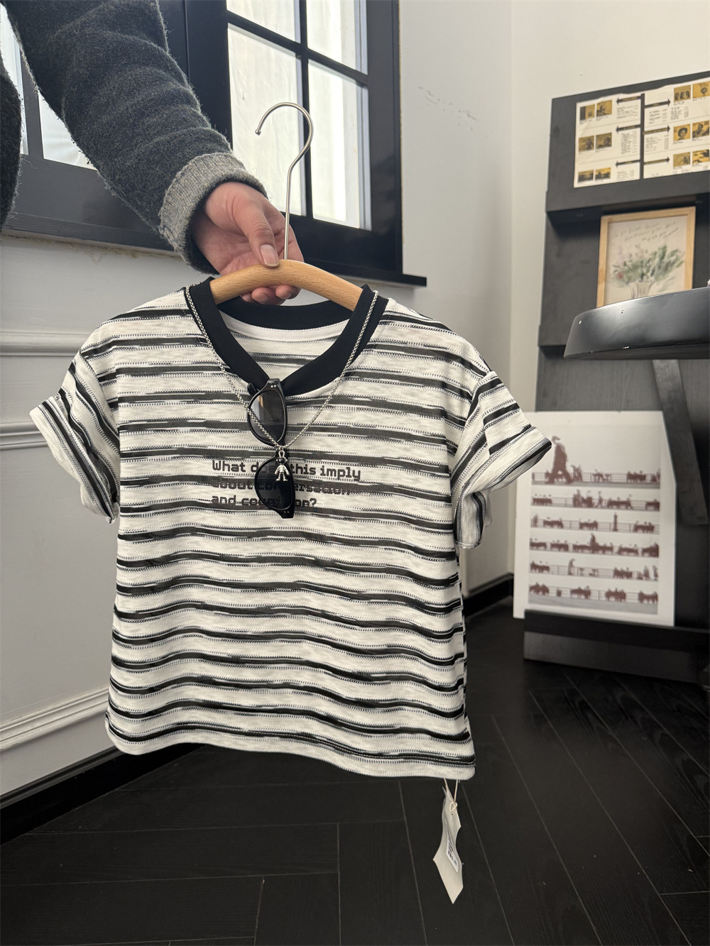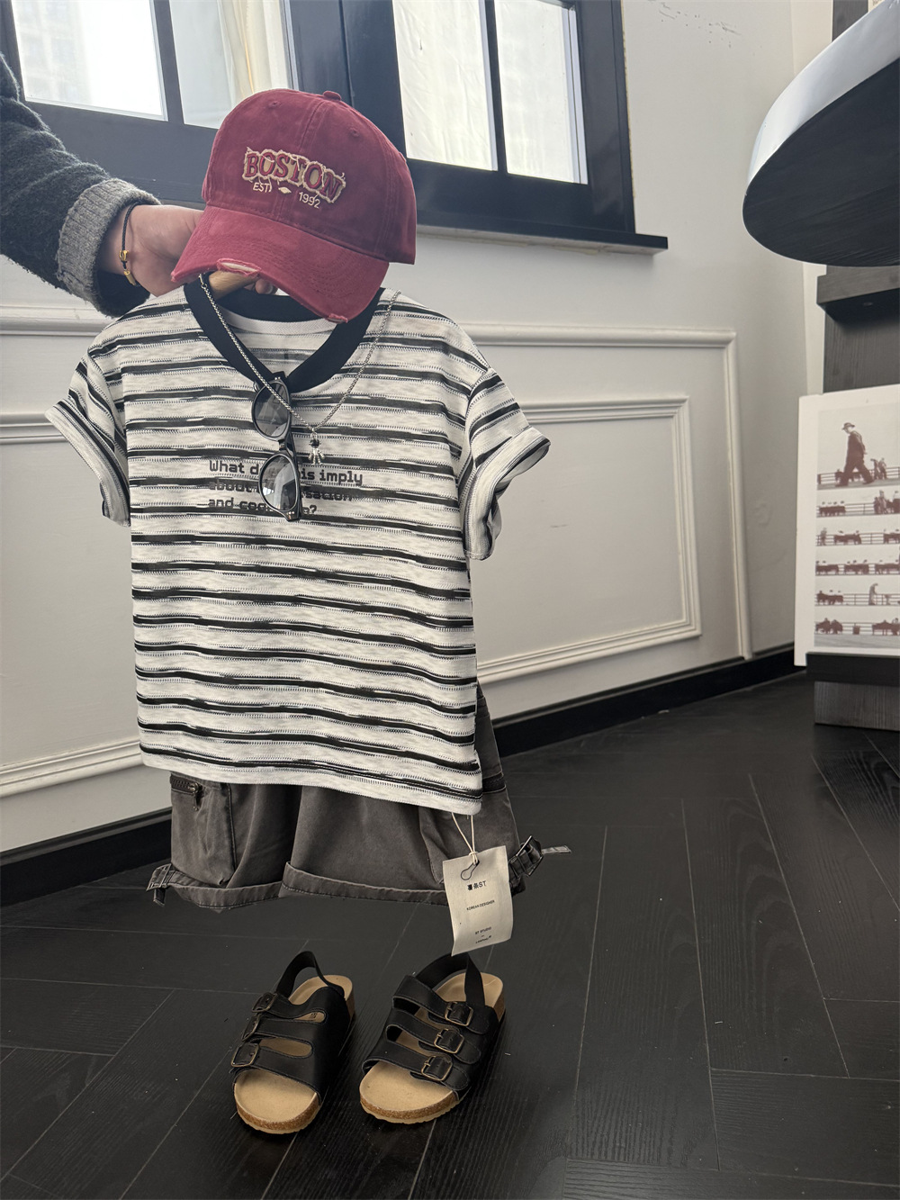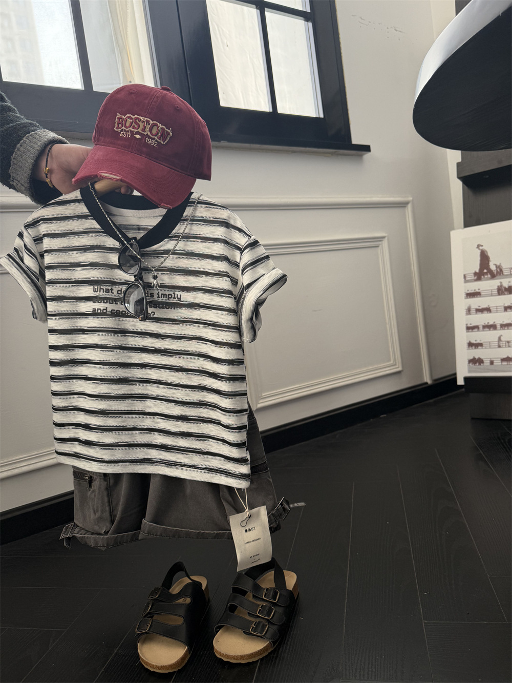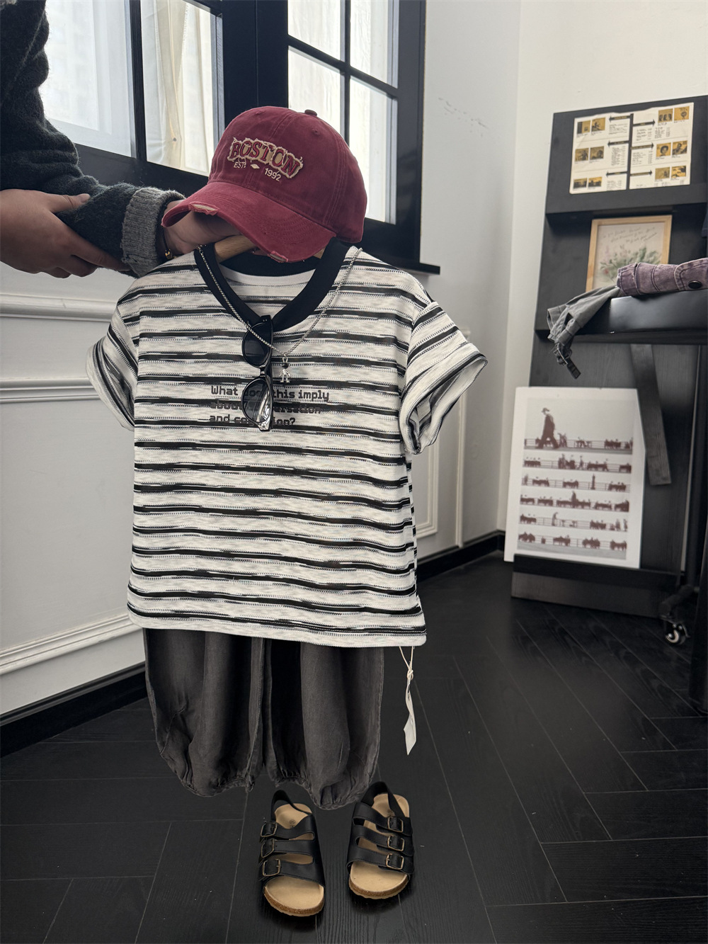 아동복 2025 미국식 어린이 흑백 줄무늬 반팔 티셔츠 부드러운 대나무 느슨한 반팔 편지스토어 가기