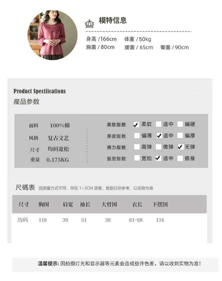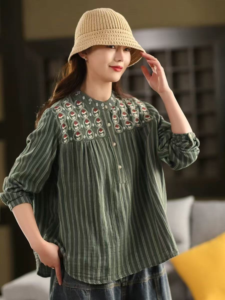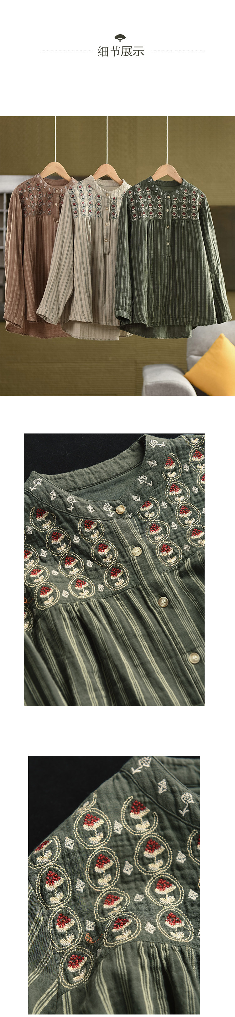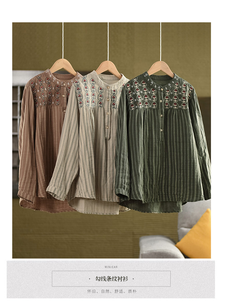 봄 새로운 빈티지 무거운 자수 스트라이프 코튼 셔츠 여성 스탠드 칼라 긴팔 셔츠 상단 23411