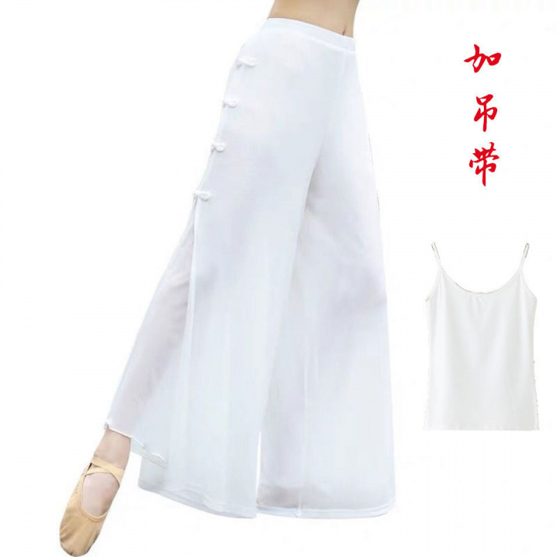 봄과 여름 더블 레이어 클래식 댄스 세트 여성 우아한 훈련 세트 라임 휴가 옷 현대 민속 댄스 메쉬 넓은 다리 바지
