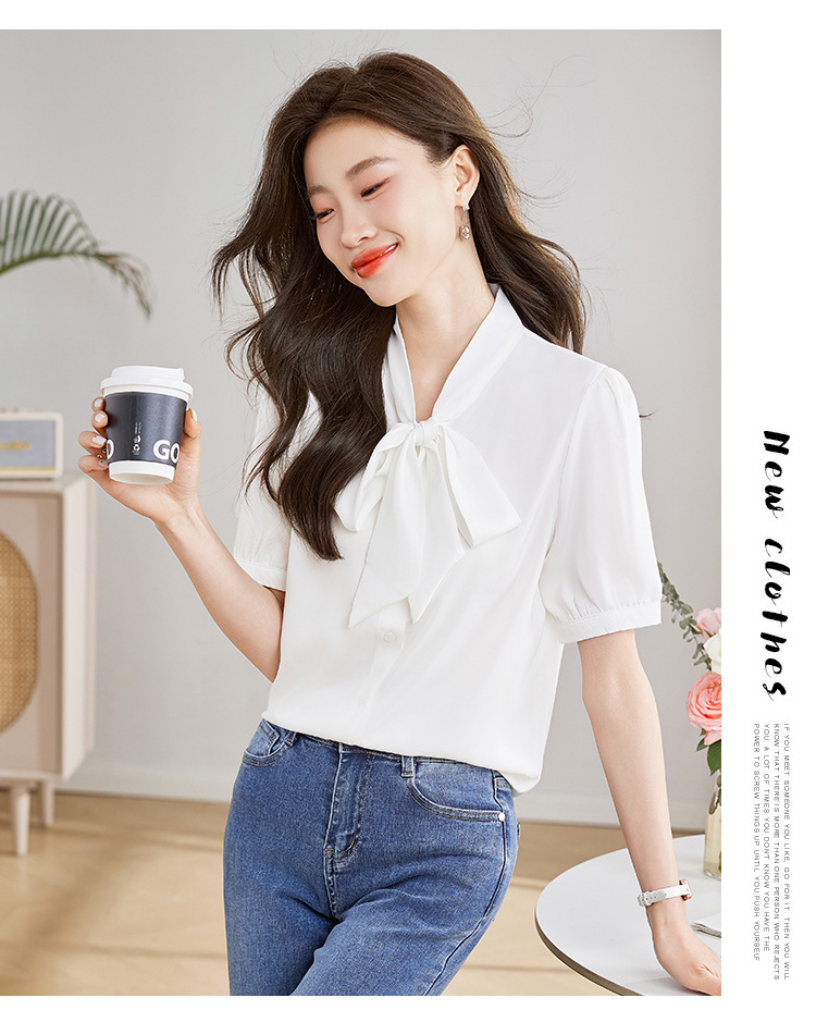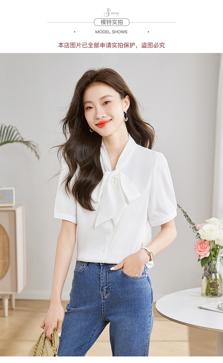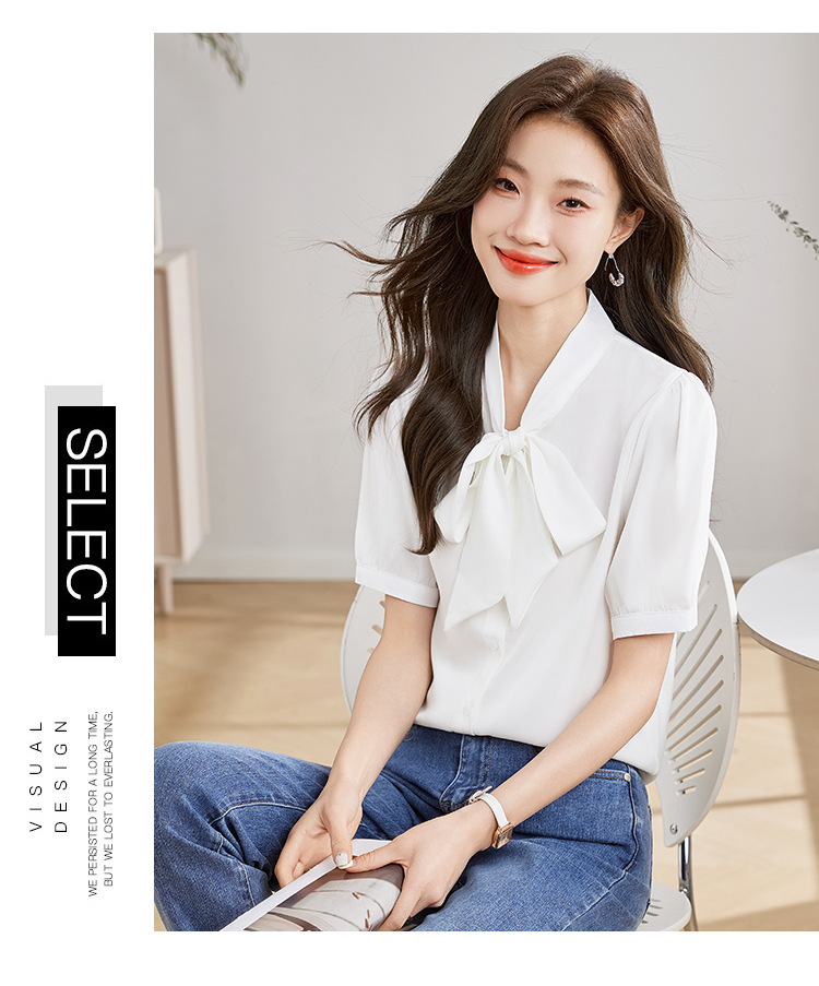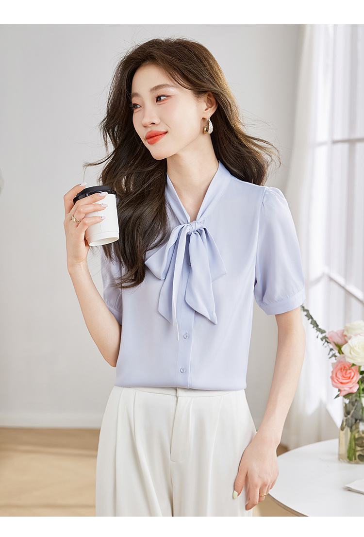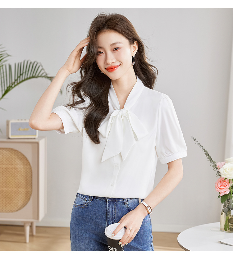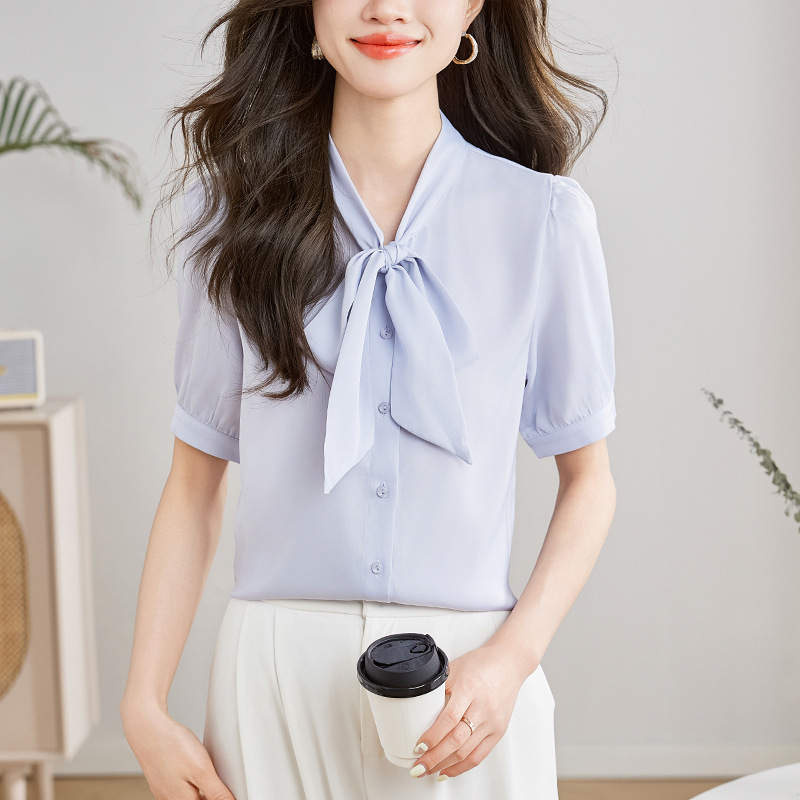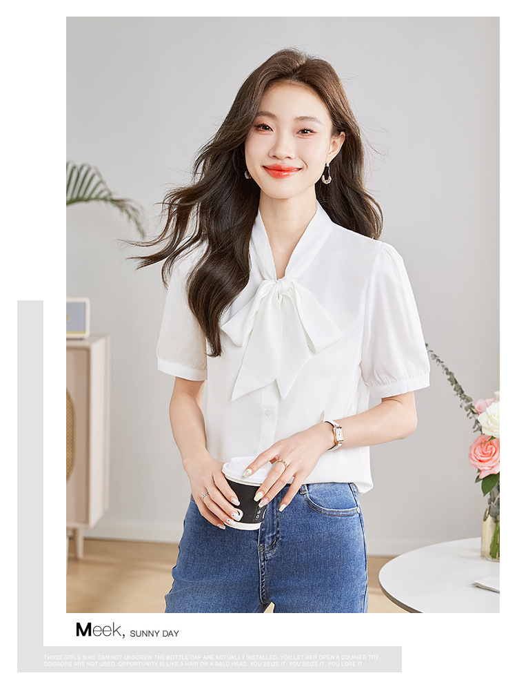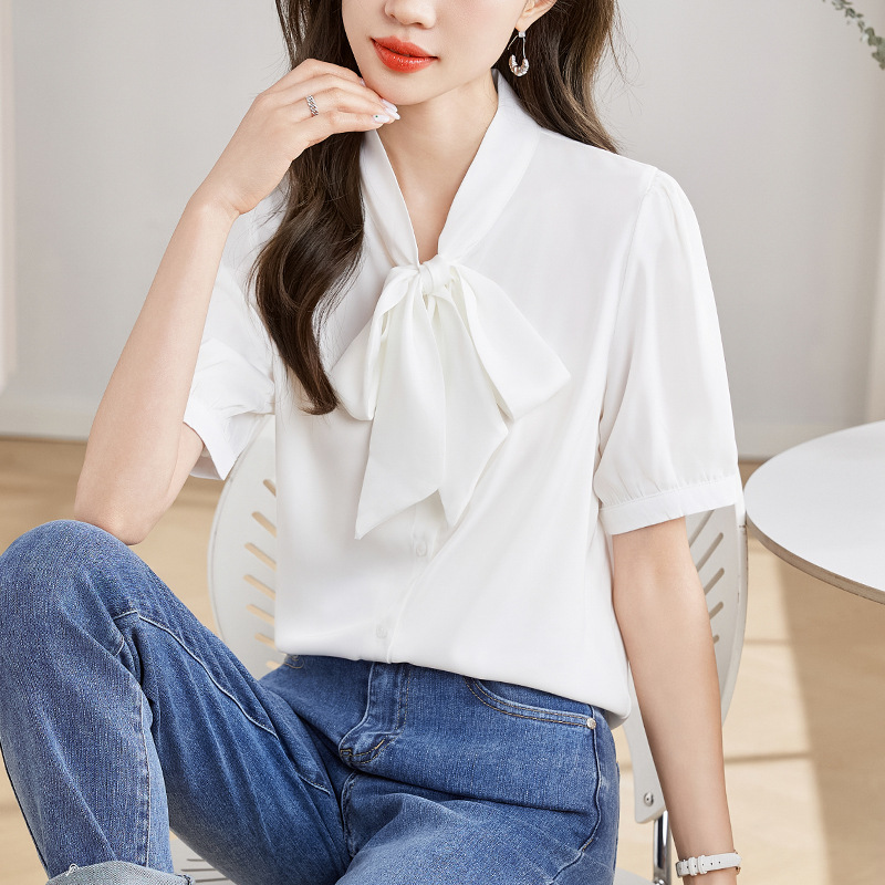 화이트 새틴 리본 셔츠 여성 반팔 여름 디자인 센스 니쉬 홍콩 스타일 통근 프로 탑 올 매치 레이스 업스토어 가기