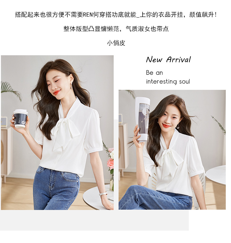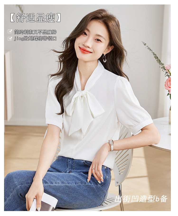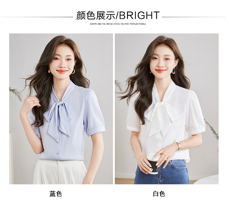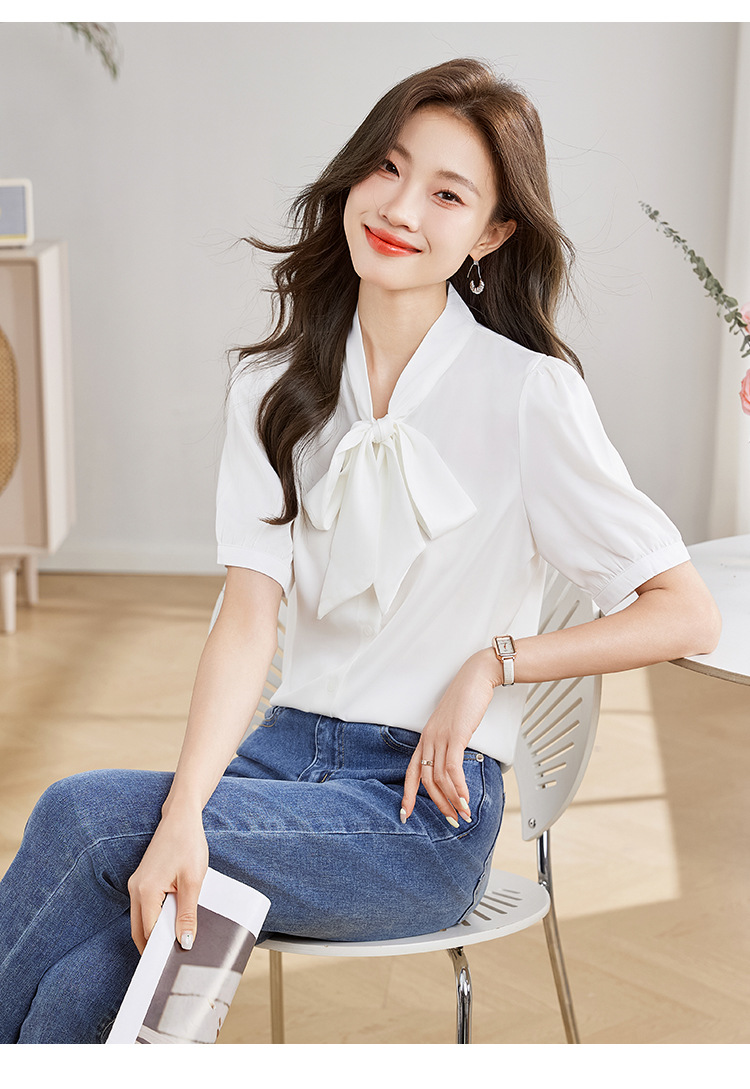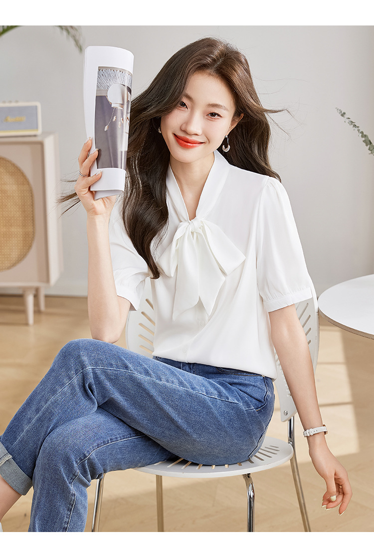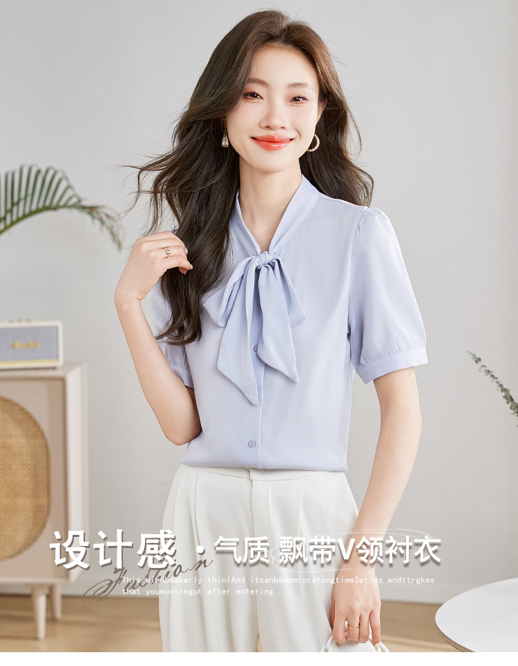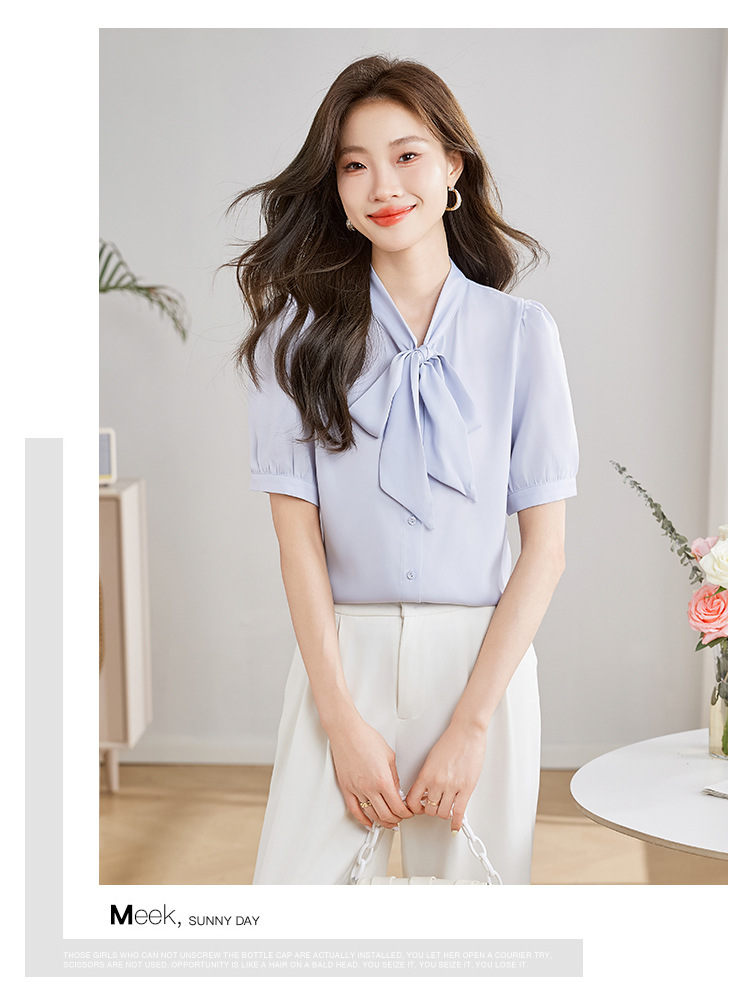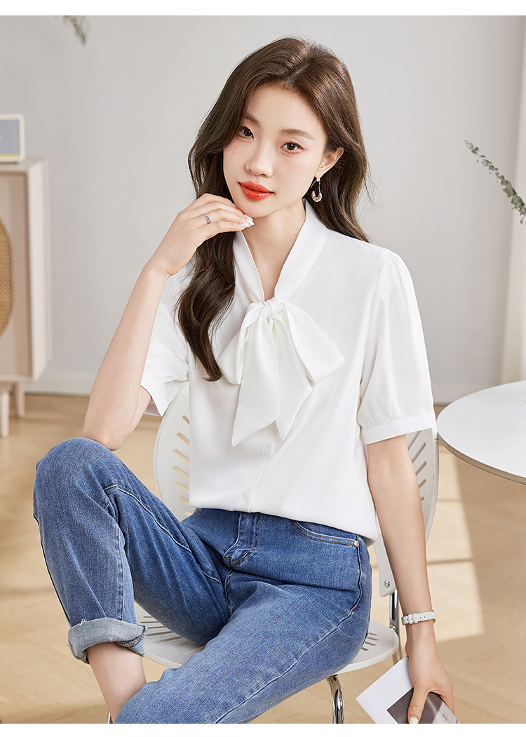 화이트 새틴 리본 셔츠 여성 반팔 여름 디자인 센스 니쉬 홍콩 스타일 통근 프로 탑 올 매치 레이스 업스토어 가기