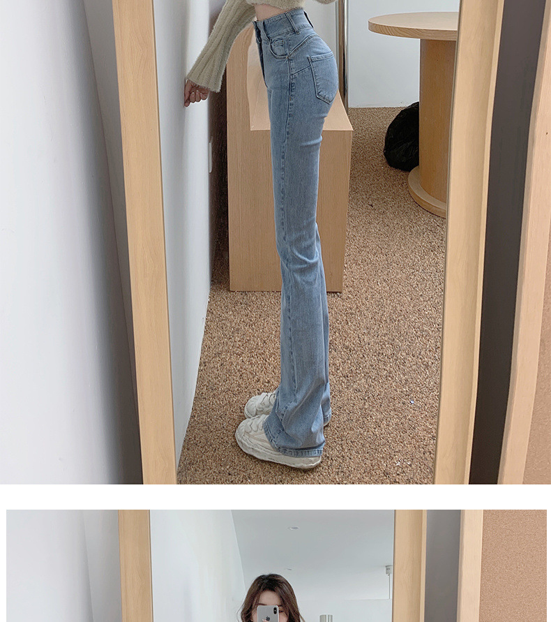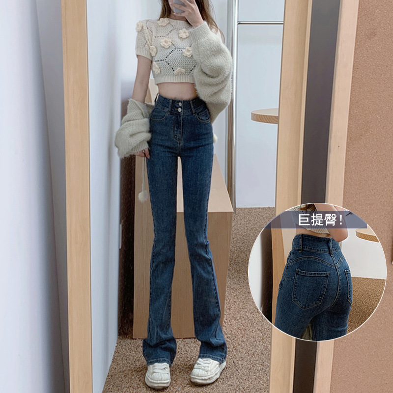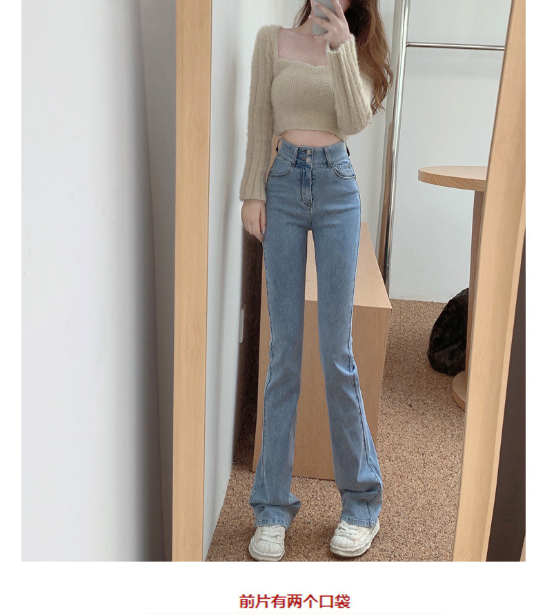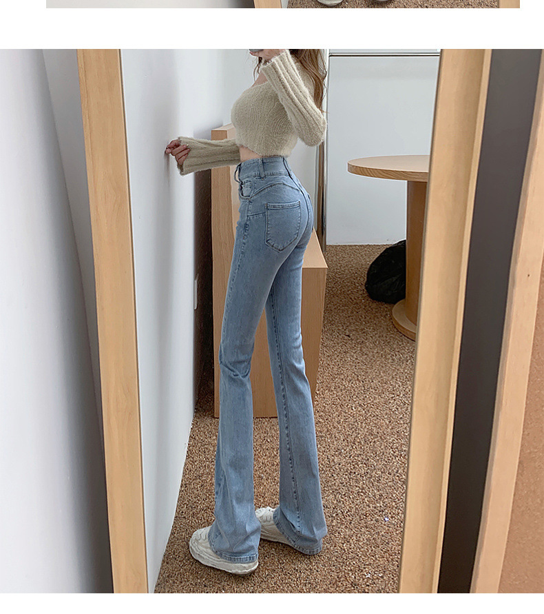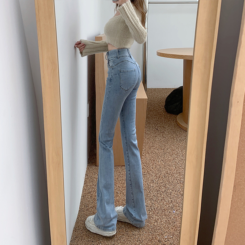 라이트 블루 마이크로 플레어 진 여성용 봄 2024 새로운 하이 허리 복숭아 엉덩이 슬림 말굽 넓은 다리 바지스토어 가기