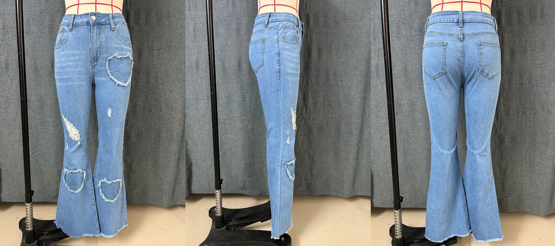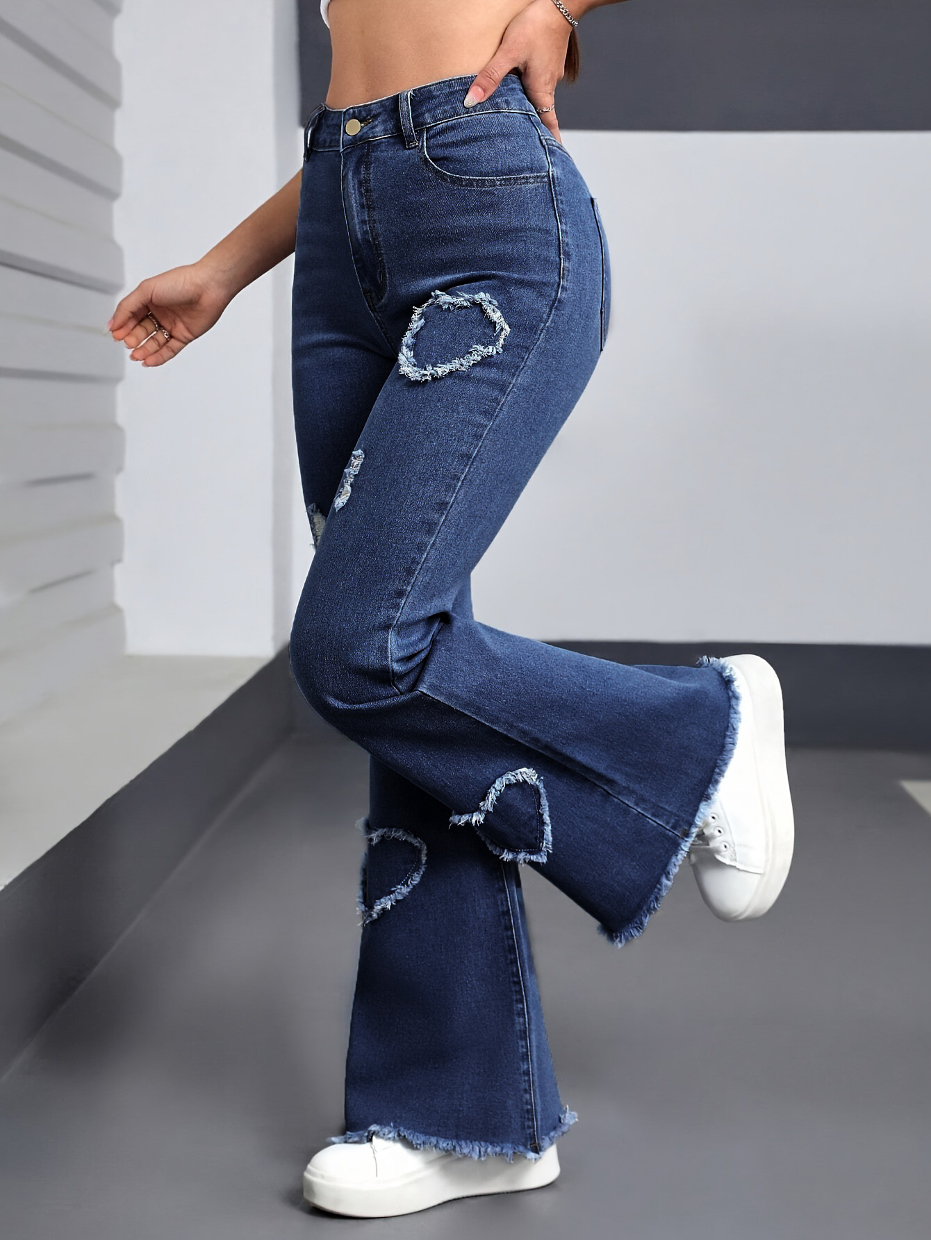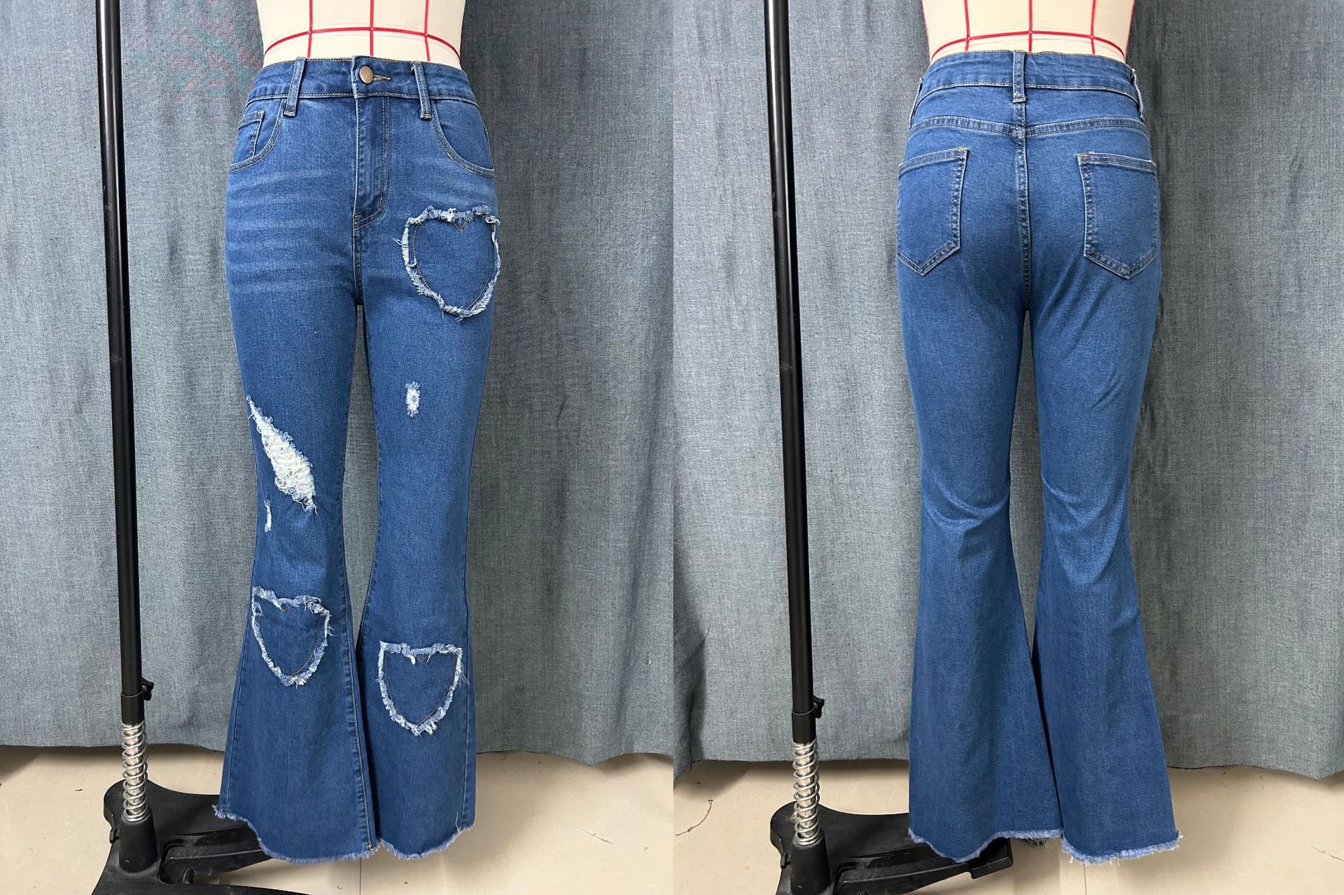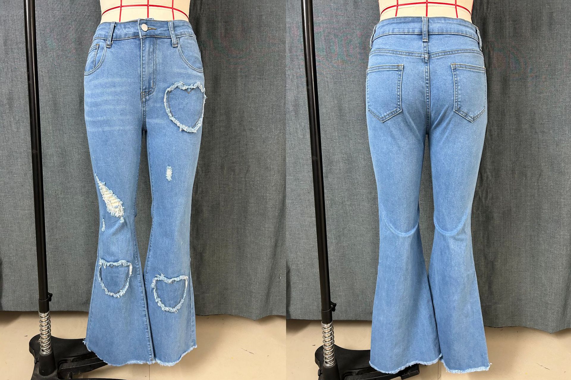 여성용 크로스보더 라이트 블루 데님 팬츠, 다용도 플레어 트림, 패셔너블하고 캐주얼한 하트 모양 디자인, 2025년형 데미지 플레어 팬츠, 신축성 있음스토어 가기
