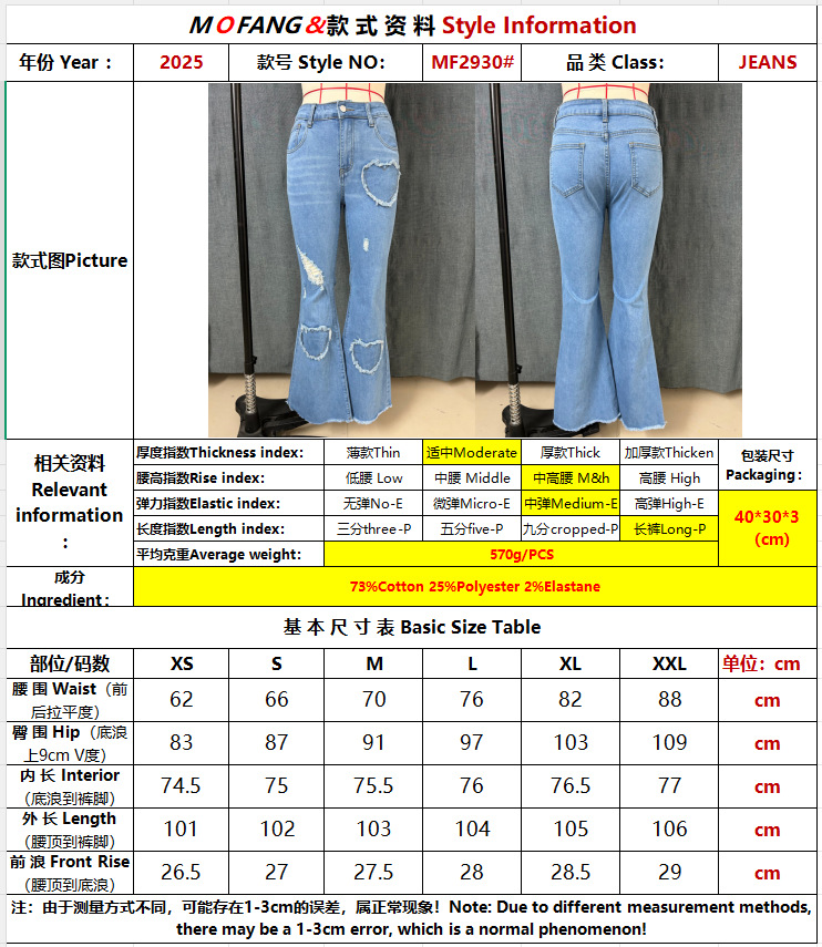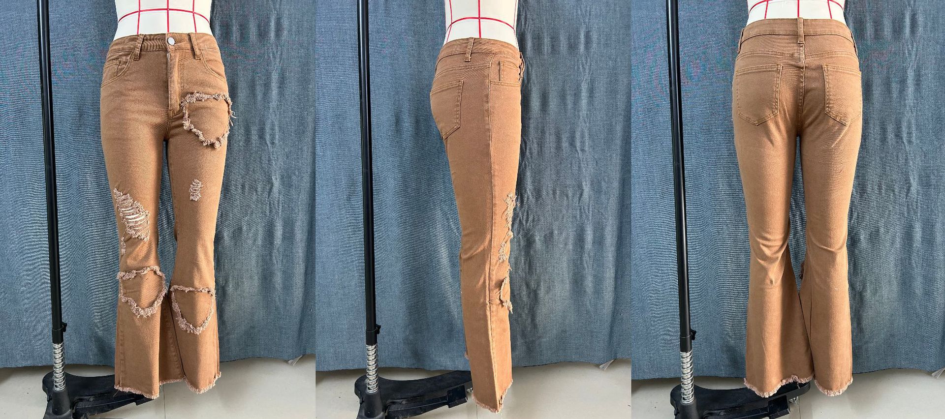 여성용 크로스보더 라이트 블루 데님 팬츠, 다용도 플레어 트림, 패셔너블하고 캐주얼한 하트 모양 디자인, 2025년형 데미지 플레어 팬츠, 신축성 있음
