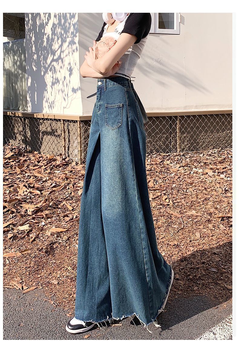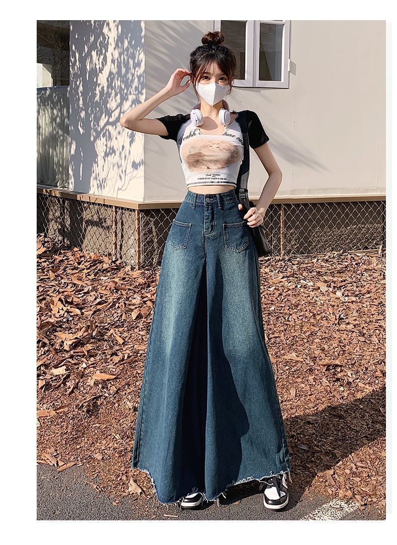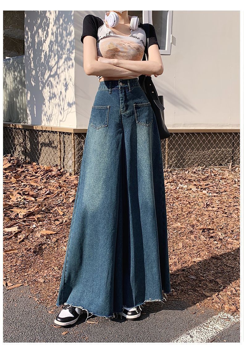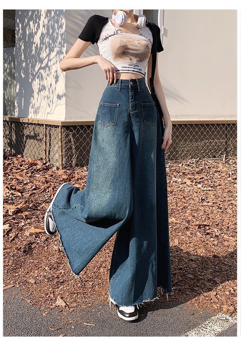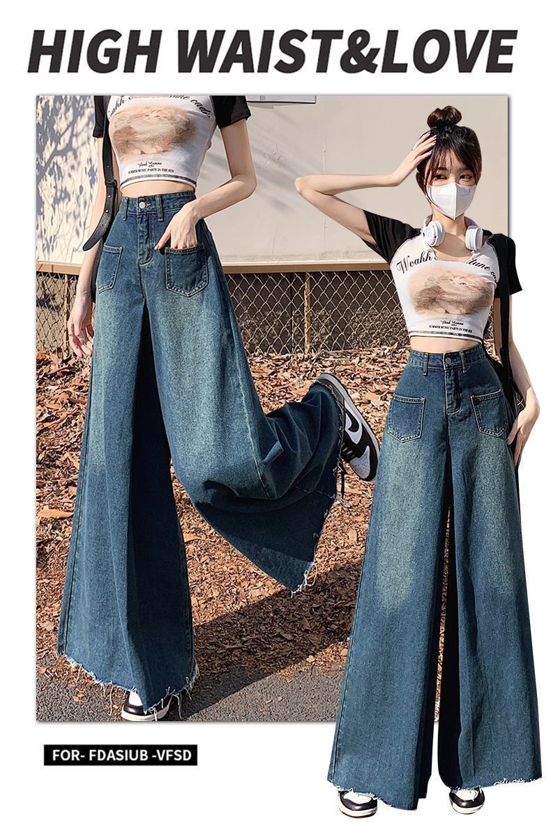 빈티지 넓은 다리 데님 바지 원피스 여성의 봄과 가을 새로운 홍콩 스타일의 높은 허리 아첨하는 디자인 감각 큰 플레어 바지스토어 가기