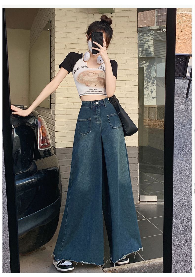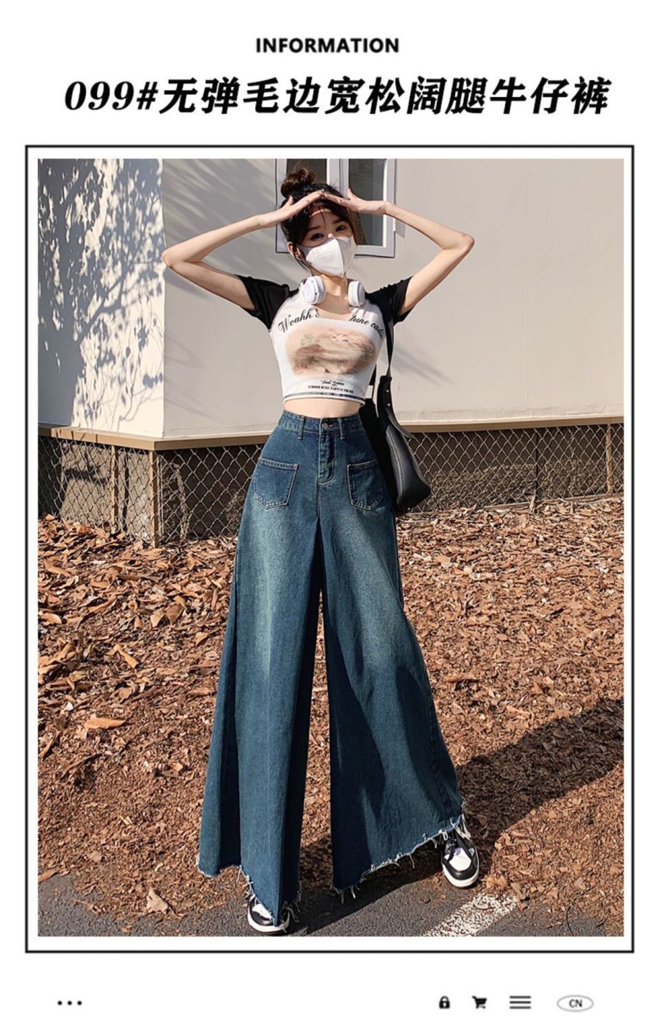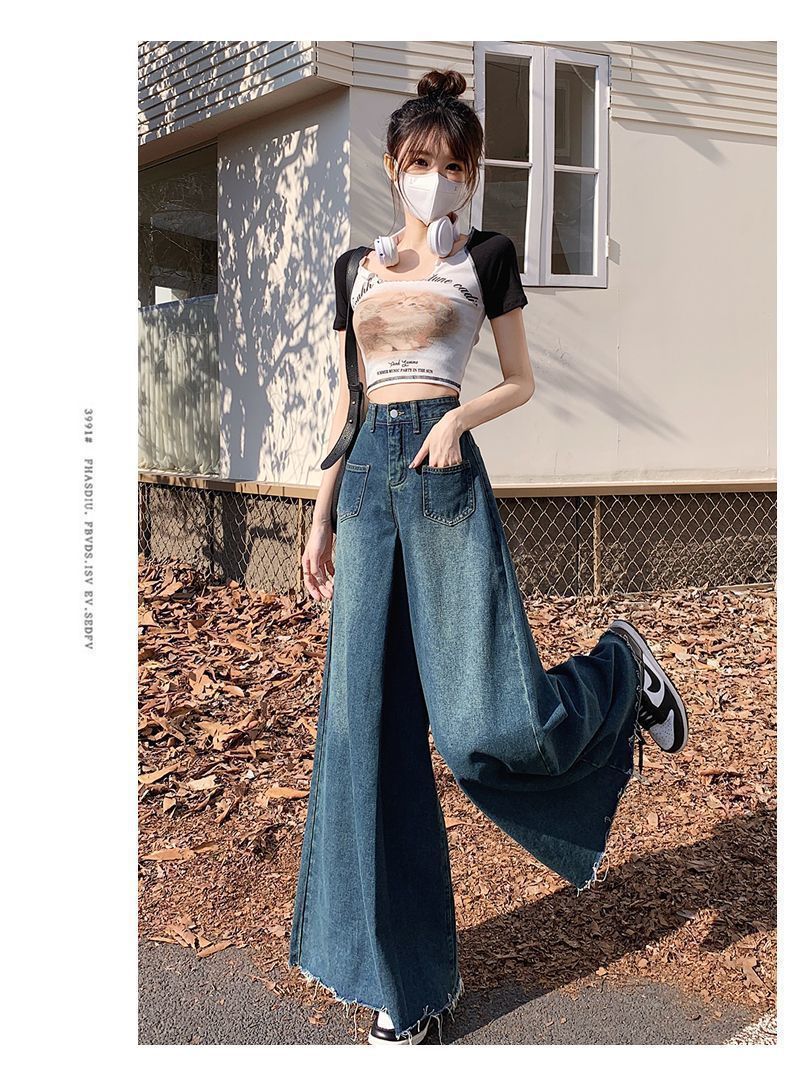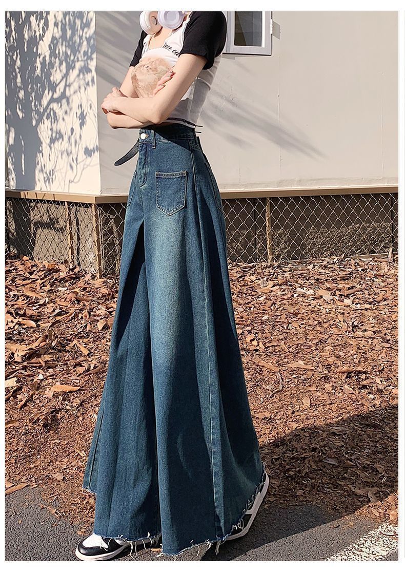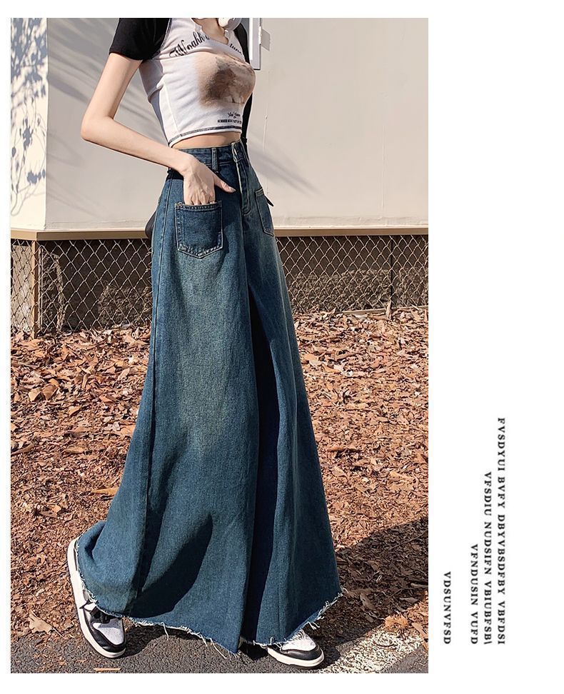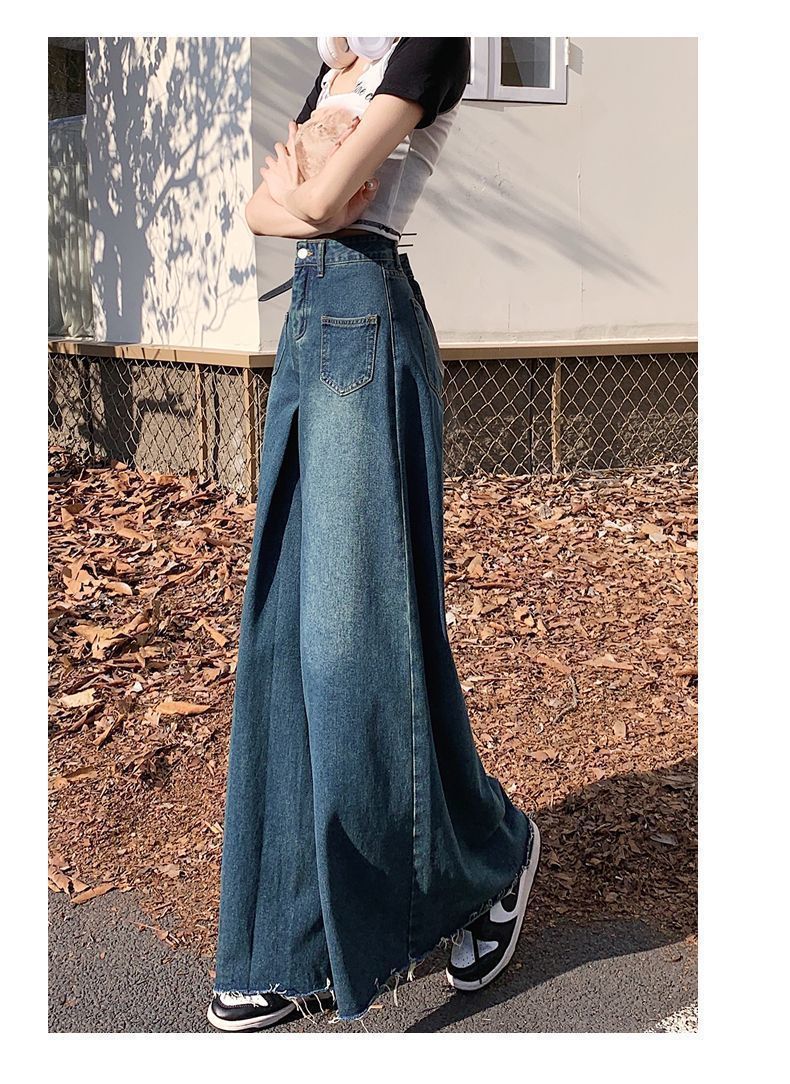 빈티지 넓은 다리 데님 바지 원피스 여성의 봄과 가을 새로운 홍콩 스타일의 높은 허리 아첨하는 디자인 감각 큰 플레어 바지스토어 가기