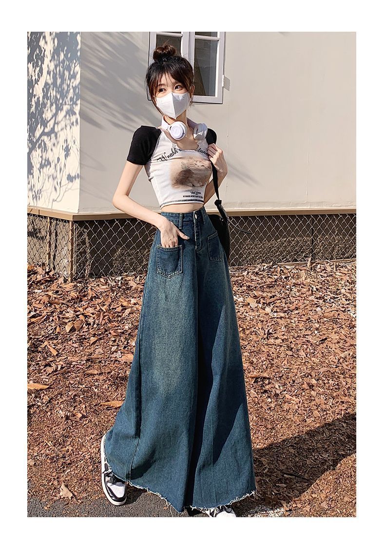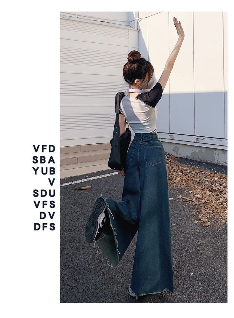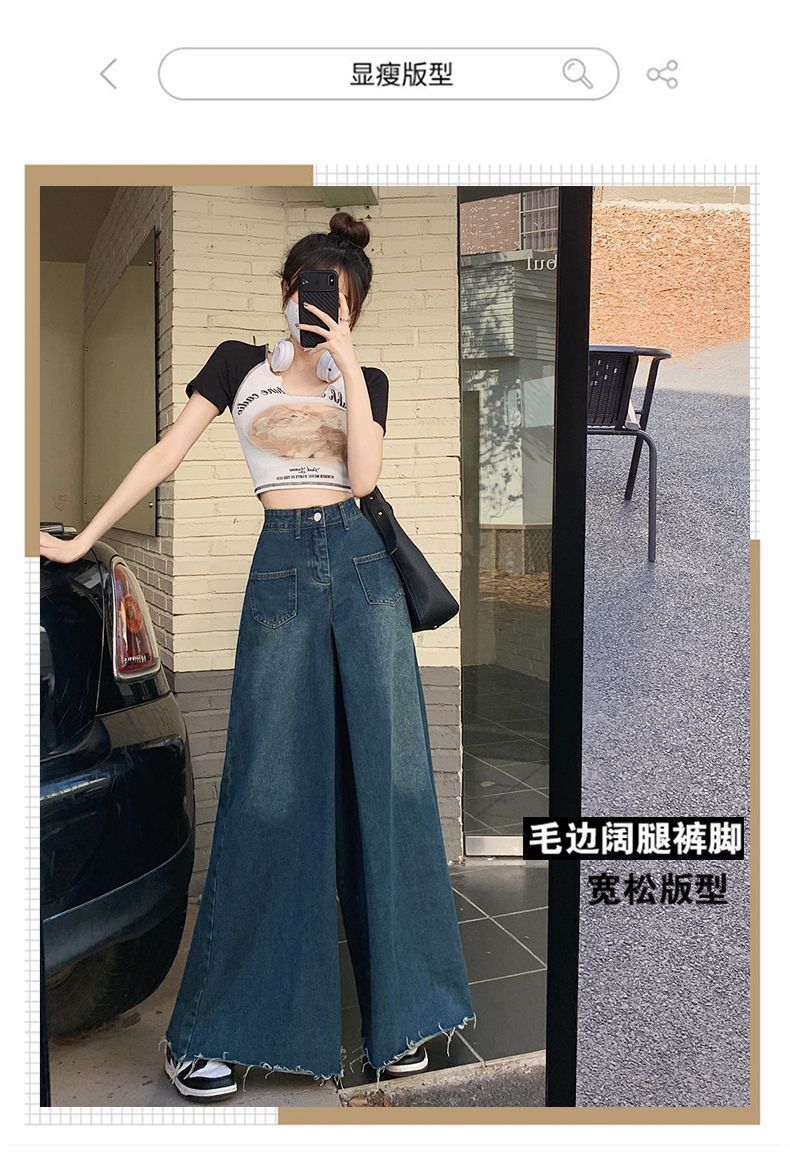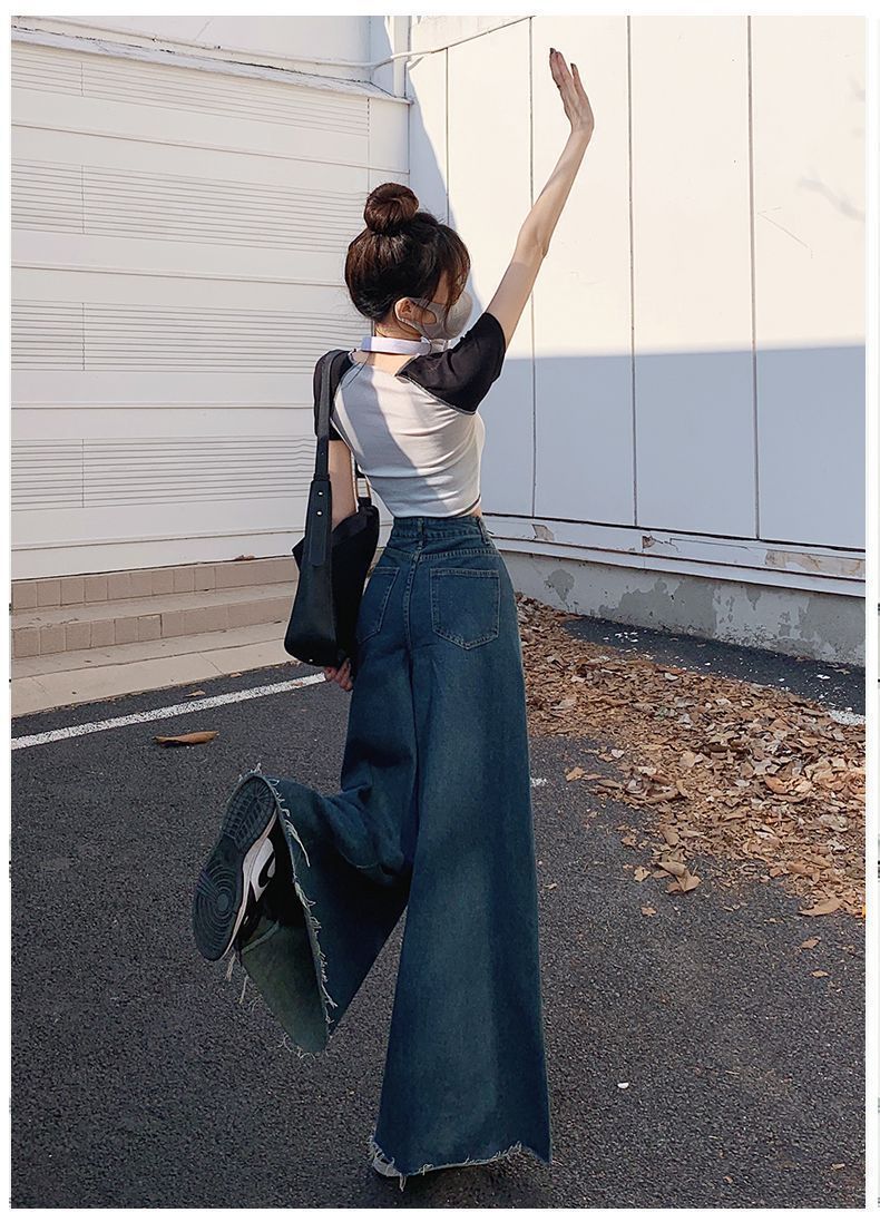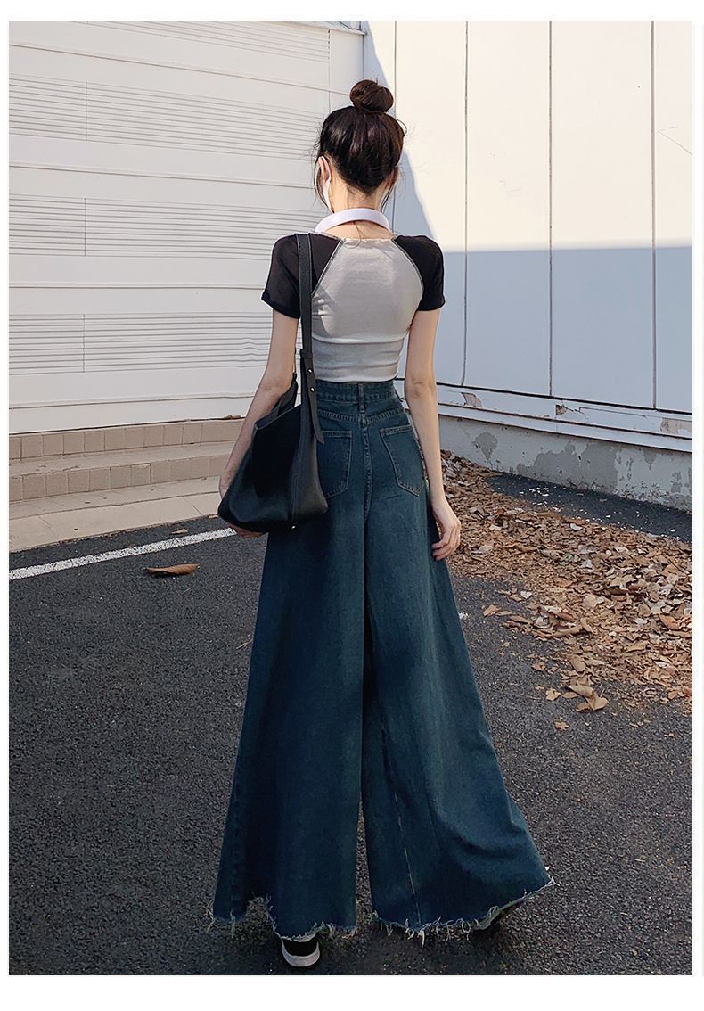빈티지 넓은 다리 데님 바지 원피스 여성의 봄과 가을 새로운 홍콩 스타일의 높은 허리 아첨하는 디자인 감각 큰 플레어 바지스토어 가기