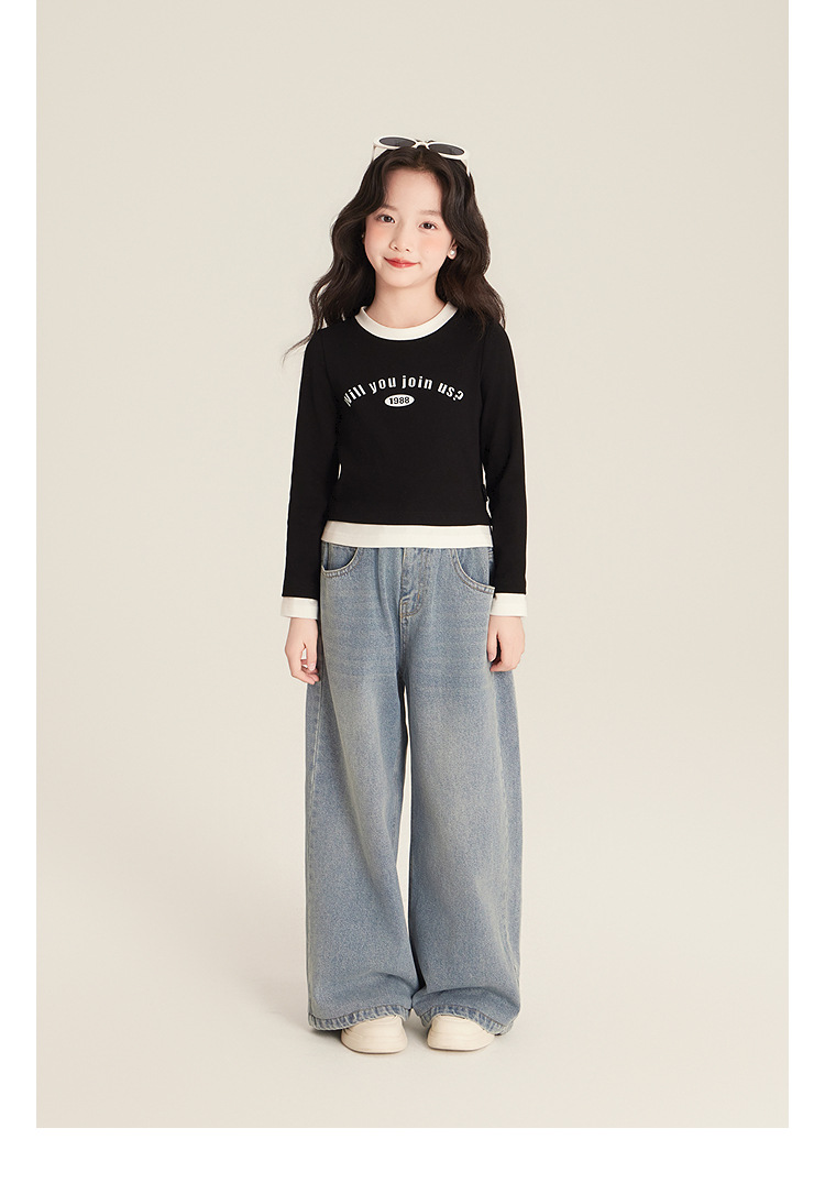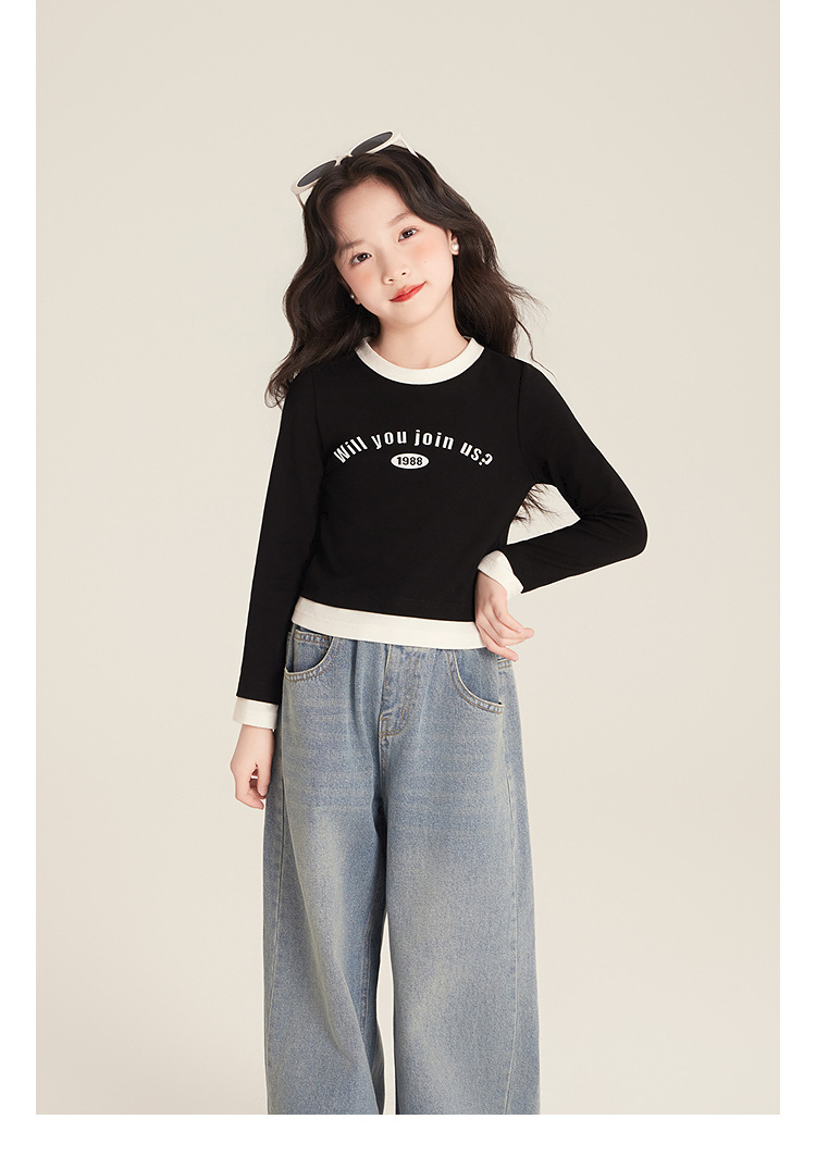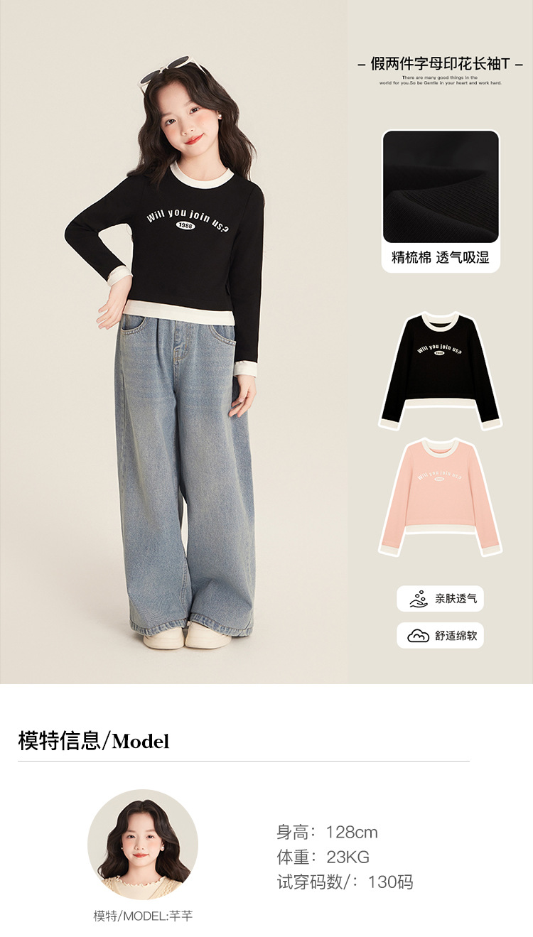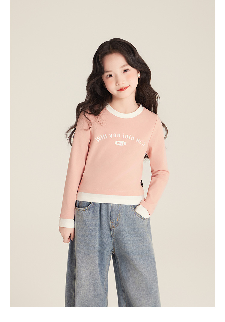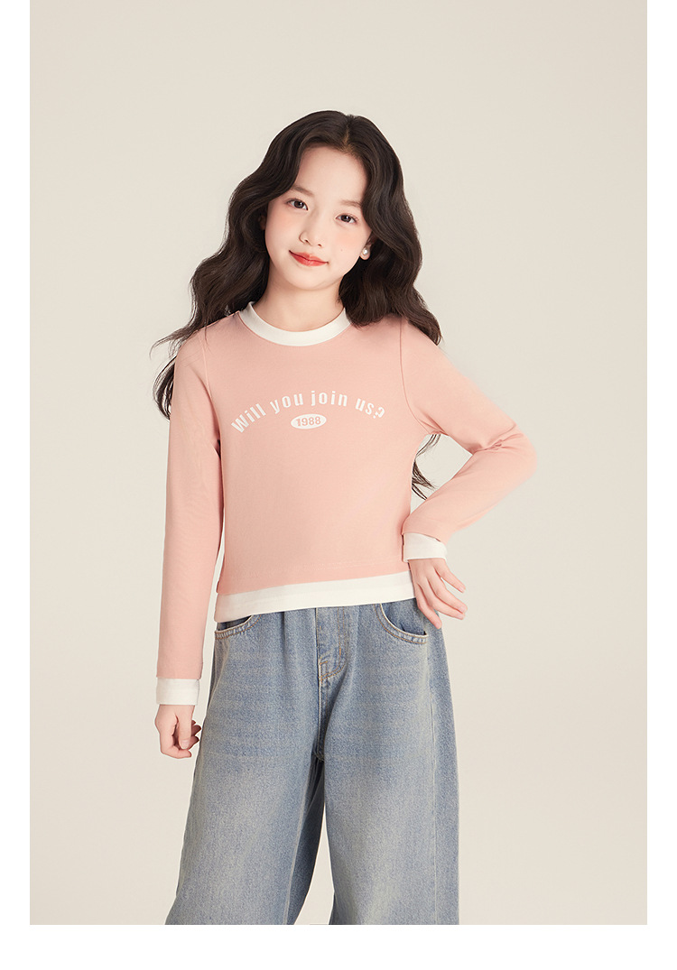 Amybaby Girl's Top Spring 2025 새로운 디자인 센스 콘트라스트 컬러 크루 넥 가짜 2 피스 스티칭 올 매치 탑