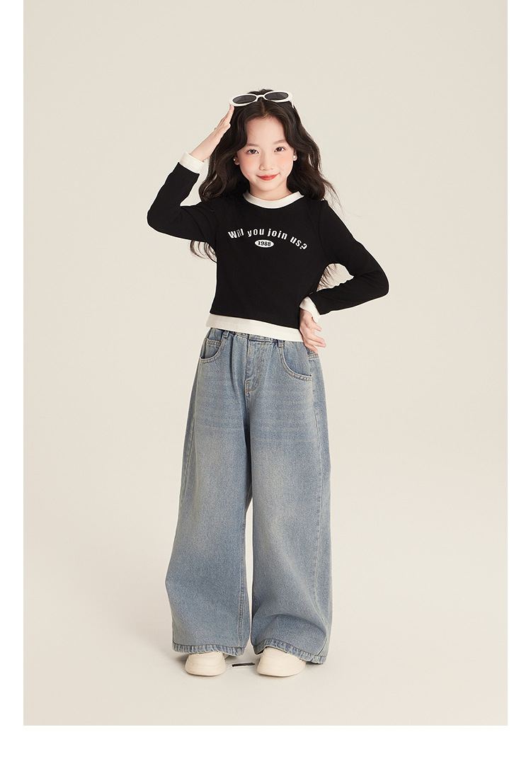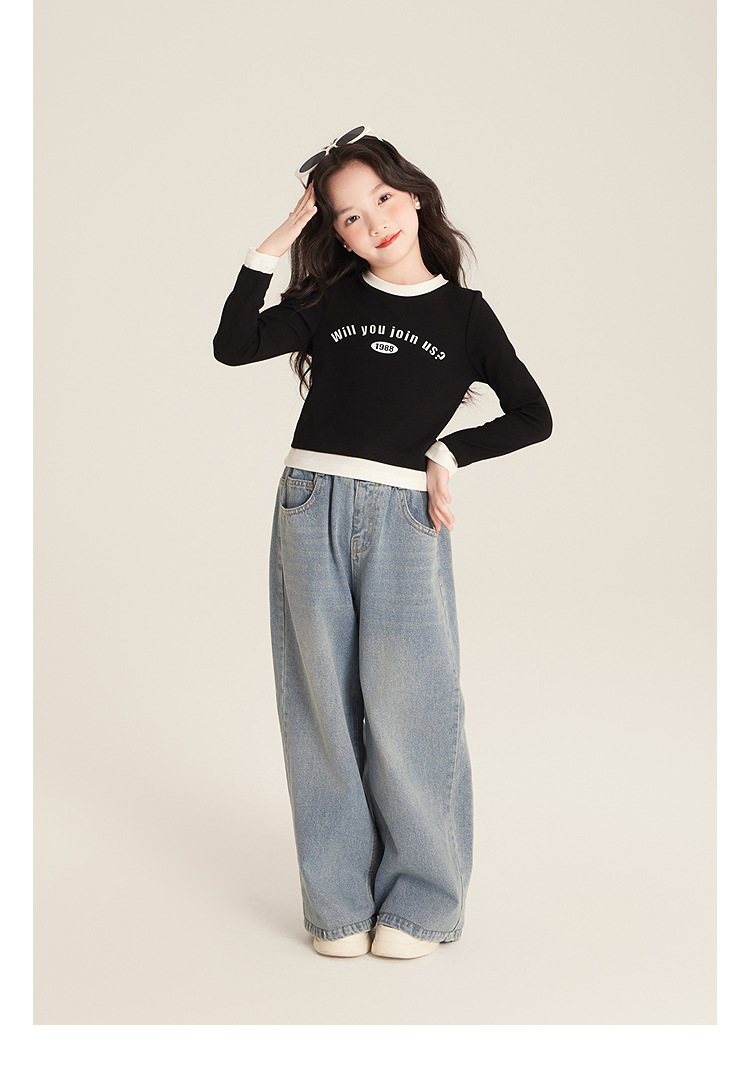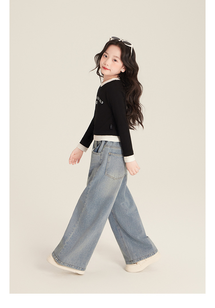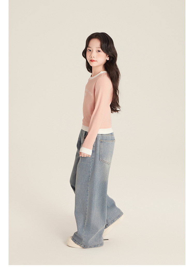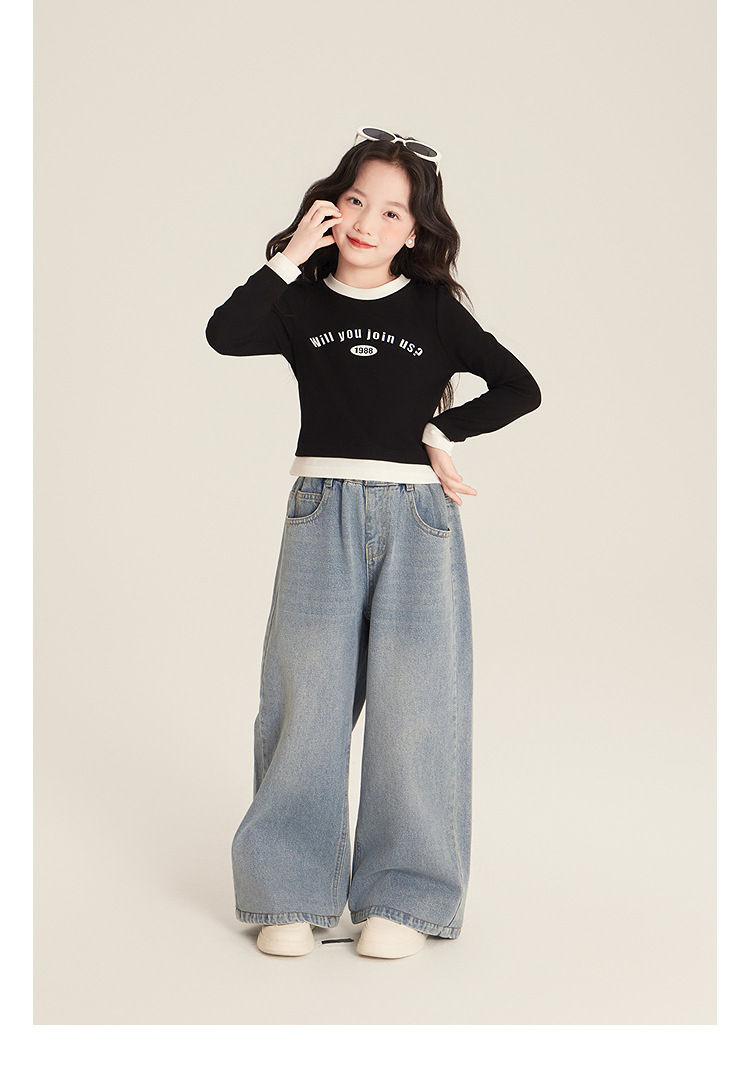 Amybaby Girl's Top Spring 2025 새로운 디자인 센스 콘트라스트 컬러 크루 넥 가짜 2 피스 스티칭 올 매치 탑