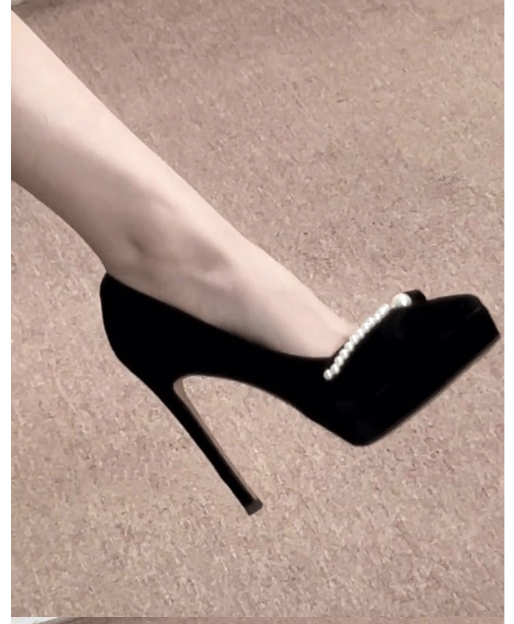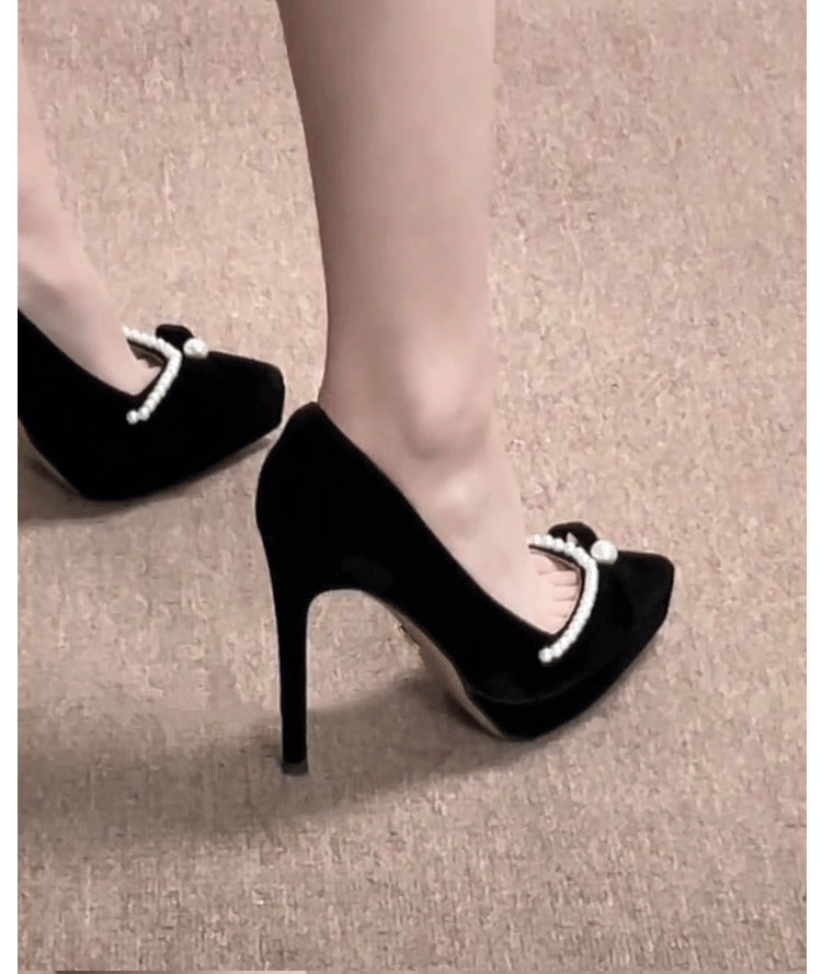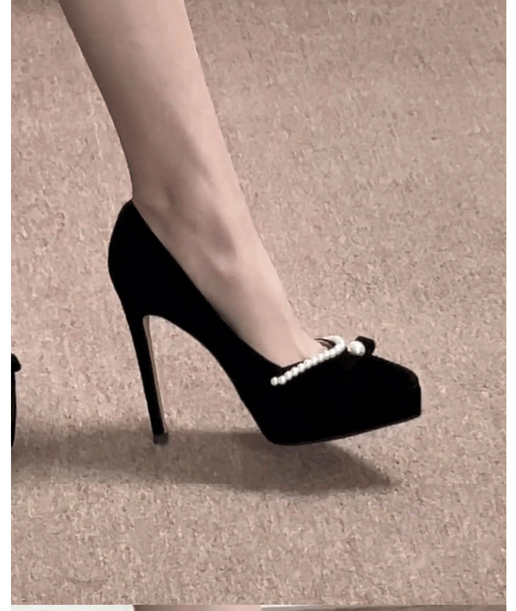 원피스 신발 메인 원사 웨딩 신발 여성용 블랙 새틴 활 진주 요정 스타일 신부 신발 고급 뒤꿈치 하이힐 신부 신발
