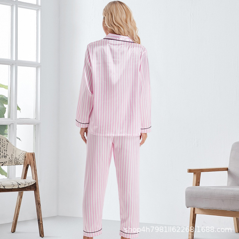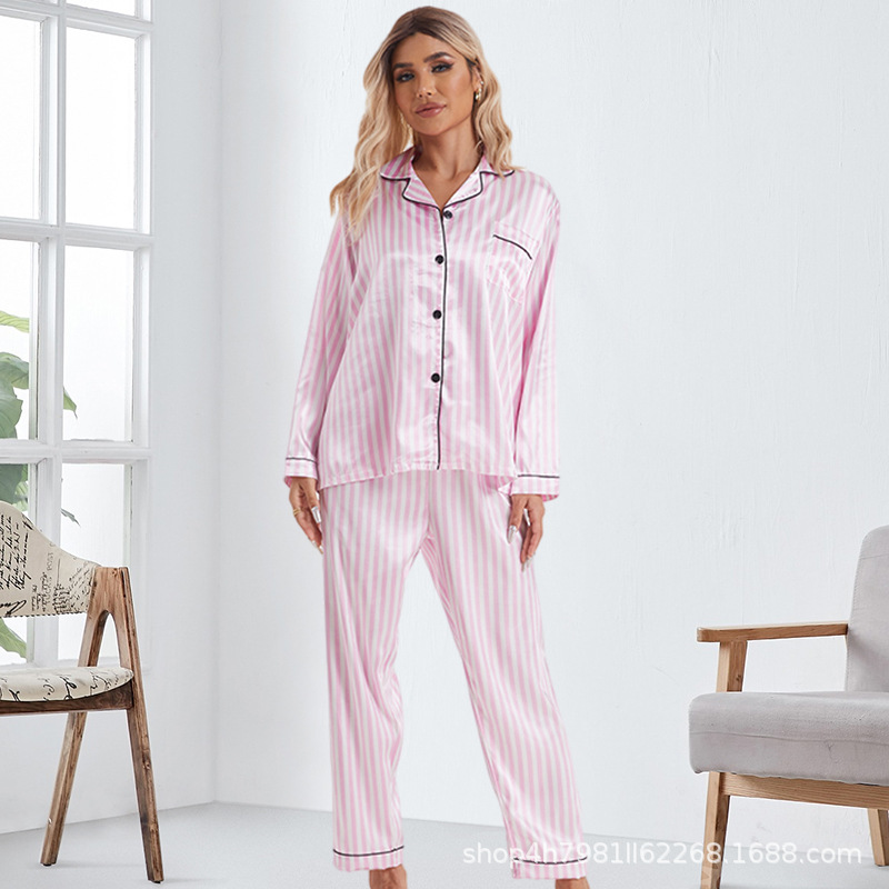 대외 무역 숙녀 줄무늬 분홍색과 흰색 얼음 실크 카디건 대형 지방 가정 의류 유럽과 미국 스타일의 소스 잠옷 세트 새로운 스타일스토어 가기