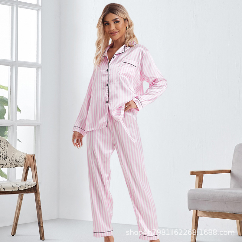 대외 무역 숙녀 줄무늬 분홍색과 흰색 얼음 실크 카디건 대형 지방 가정 의류 유럽과 미국 스타일의 소스 잠옷 세트 새로운 스타일