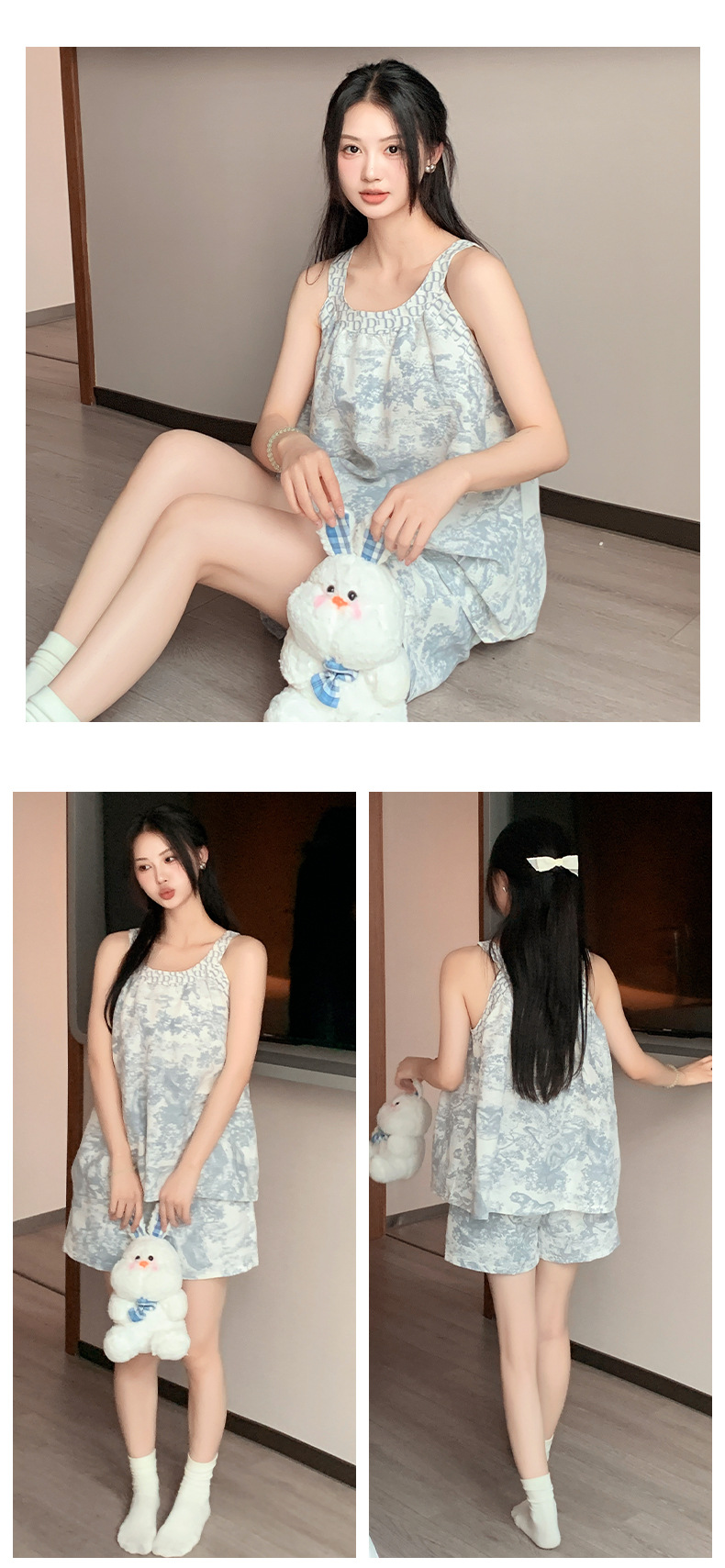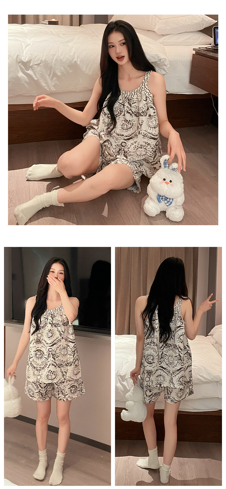 가슴 패드가 달린 잠옷 여자 여름 컬러 블록 슬링 세트 민소매 조끼 플러스 사이즈 반바지 얇은 홈 옷을 입고스토어 가기