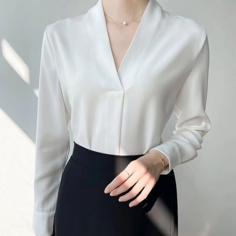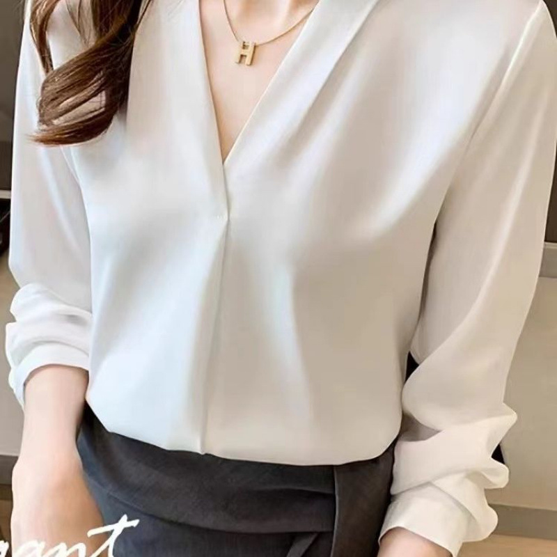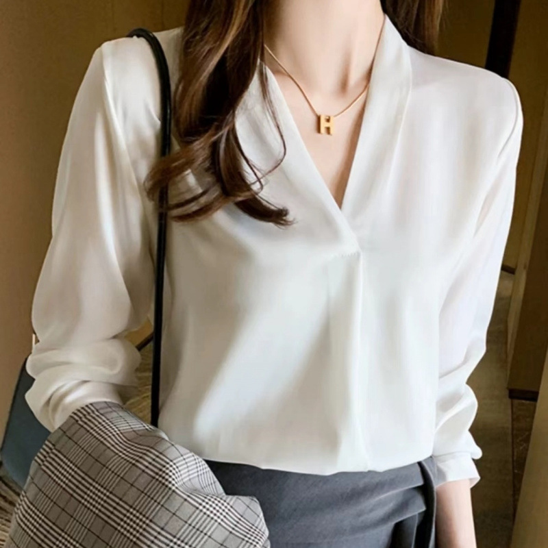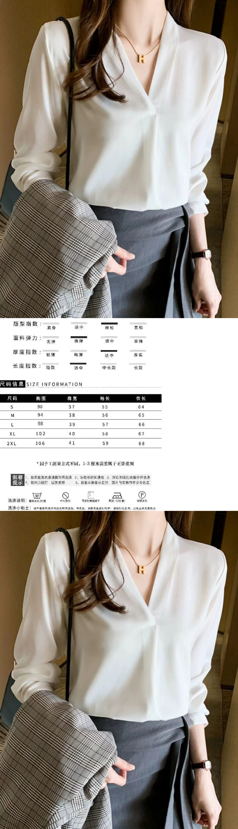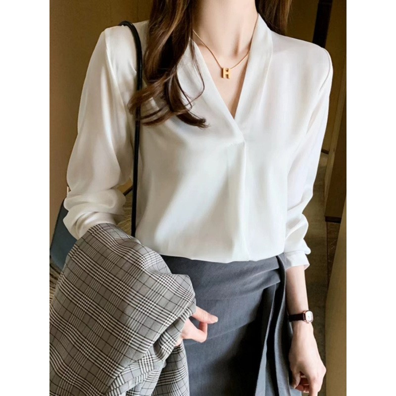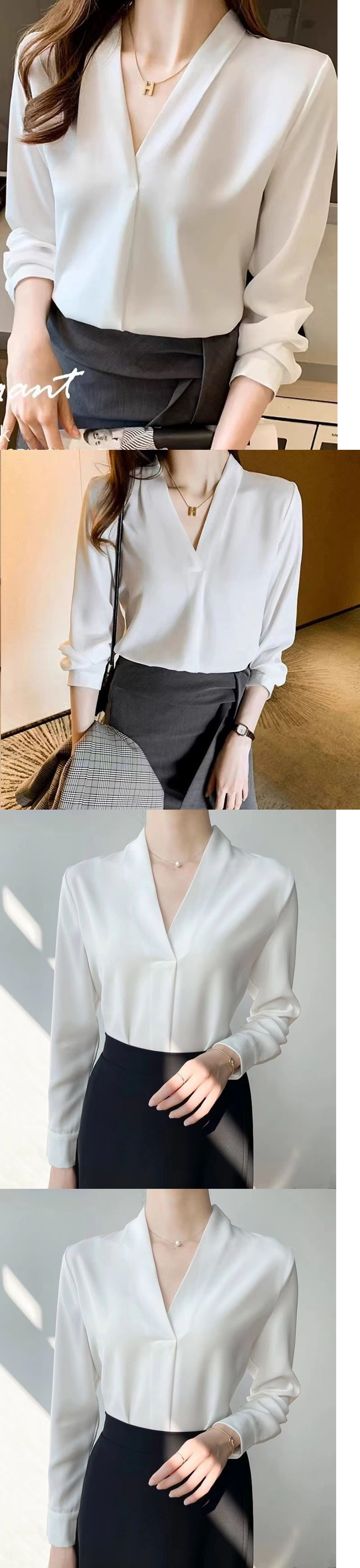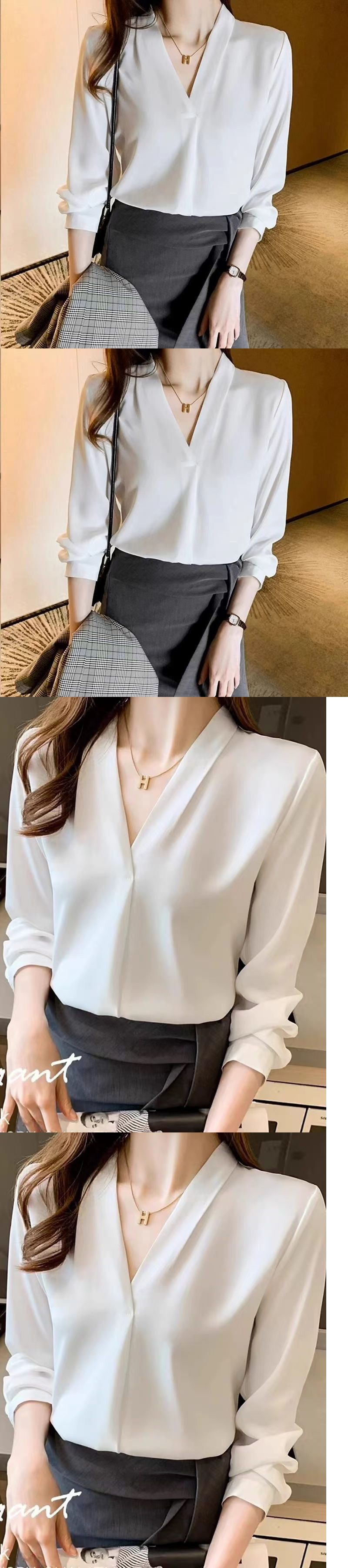 브이넥 셔츠 여성용 봄 여름 가을 패션 긴 소매 서양식 통근 전문 프랑스 스타일 톱 워크 의류 아이보리 패션