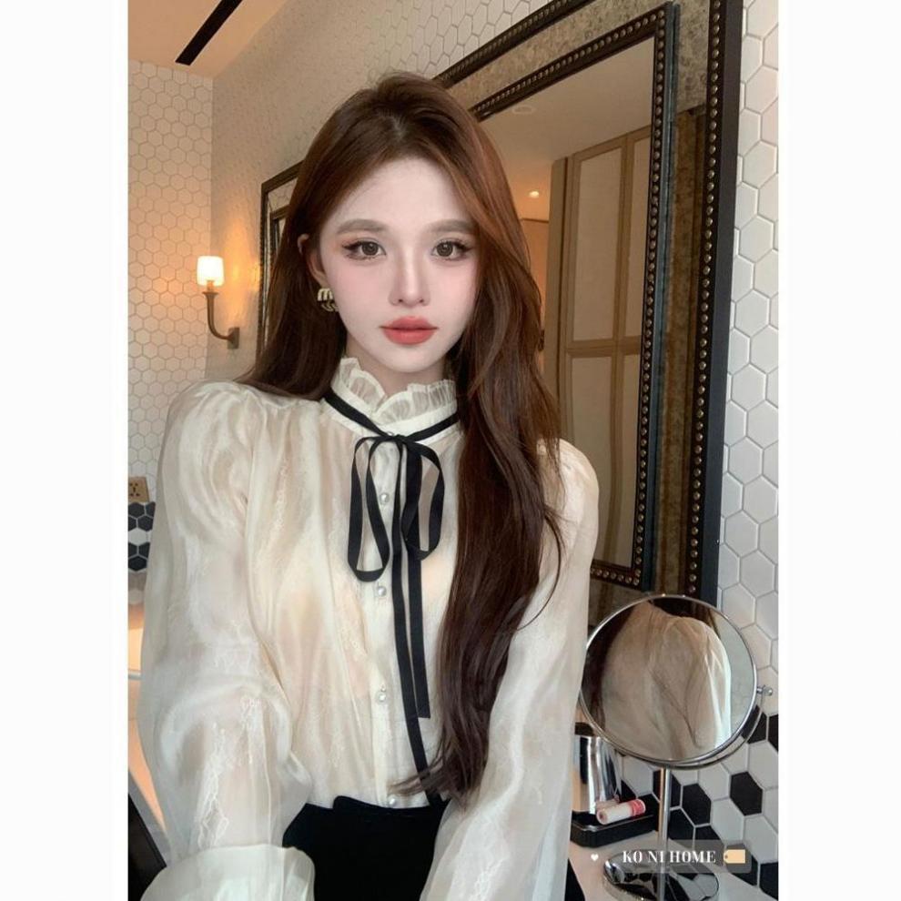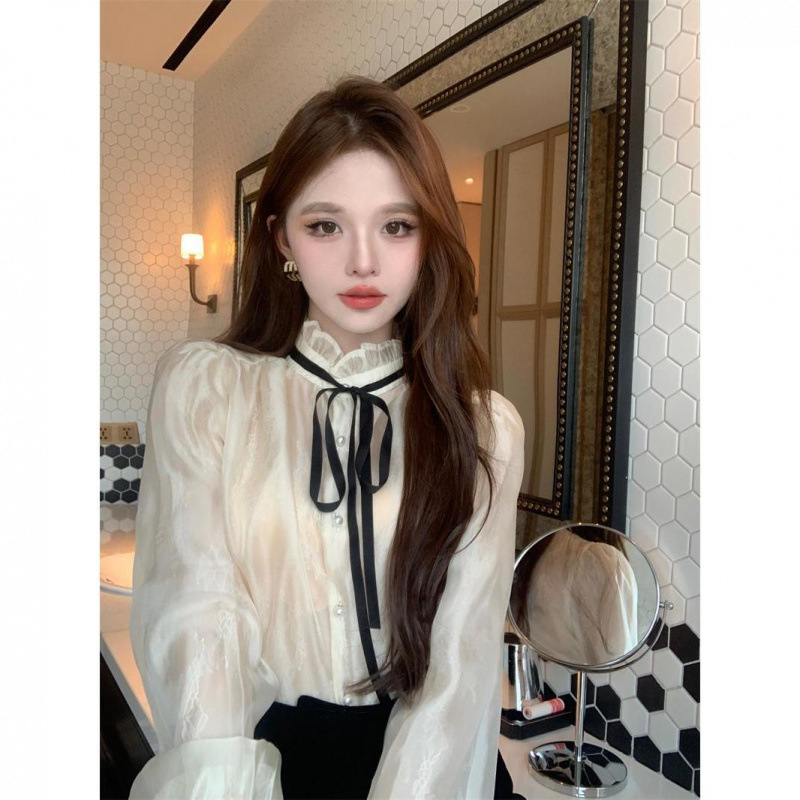 시폰 셔츠 여성 프랑스 스타일 레이디 스타일 칼라 스트랩 긴 소매 셔츠 여성의 가을 새로운 궁전 스타일 셔츠 탑스토어 가기