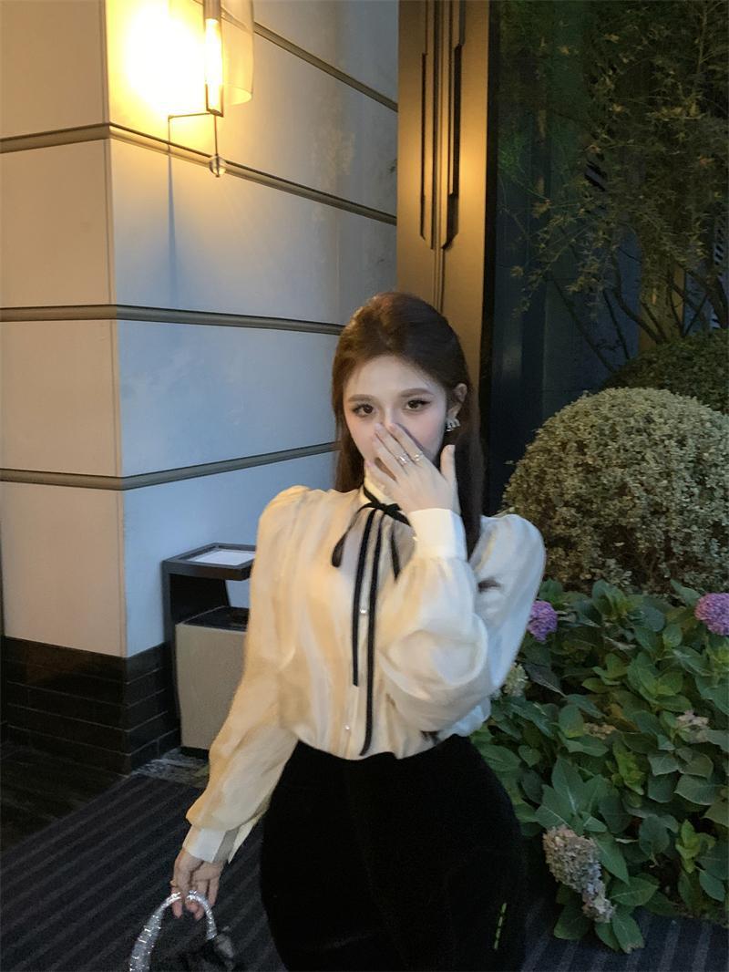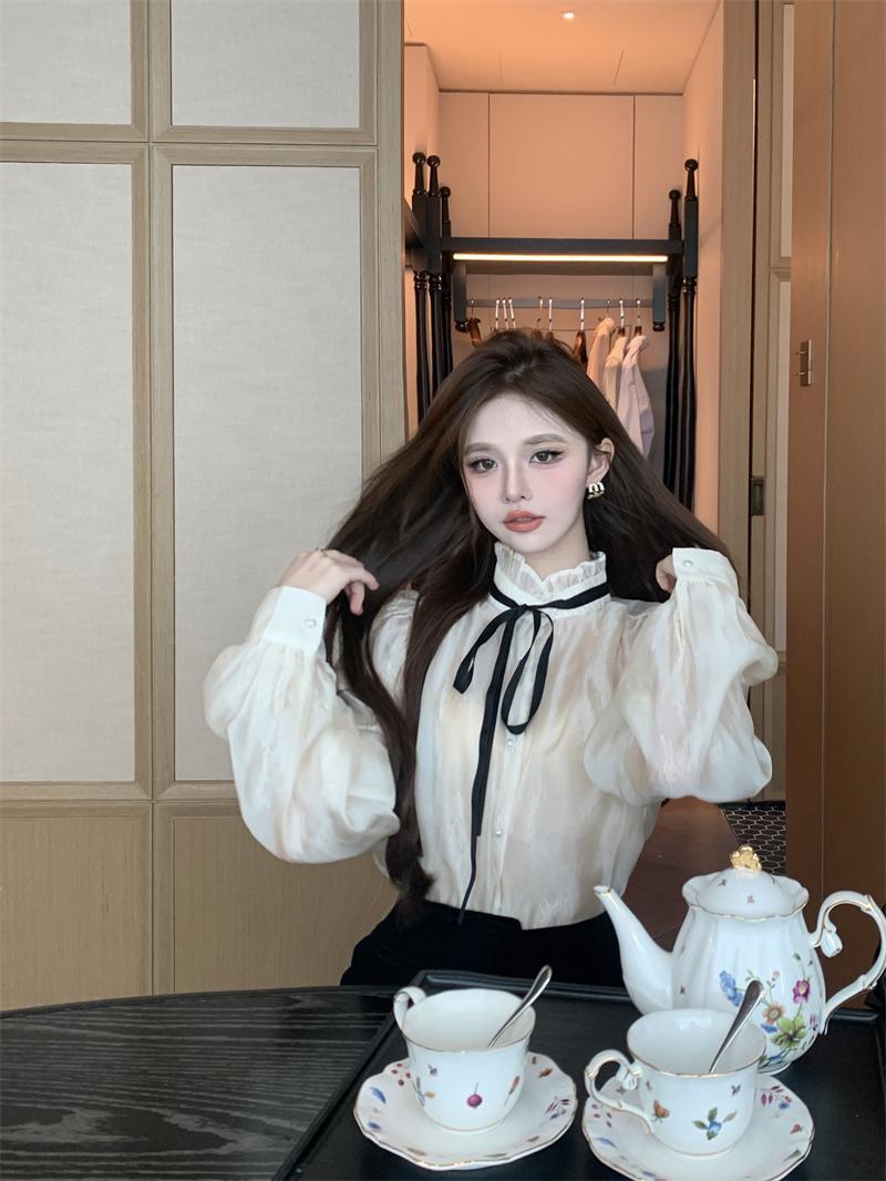 시폰 셔츠 여성 프랑스 스타일 레이디 스타일 칼라 스트랩 긴 소매 셔츠 여성의 가을 새로운 궁전 스타일 셔츠 탑