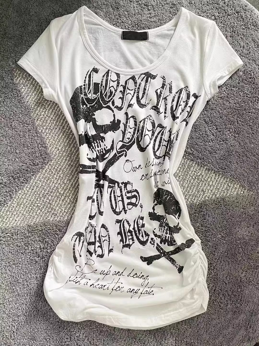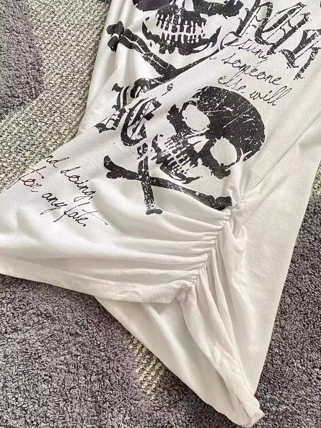 2025 새로운 틈새 슬림 핏 슬리밍 아메리칸 스타일 반팔 세련된 블랙 스컬 탑 올 매치 티셔츠 트렌디 인 여성