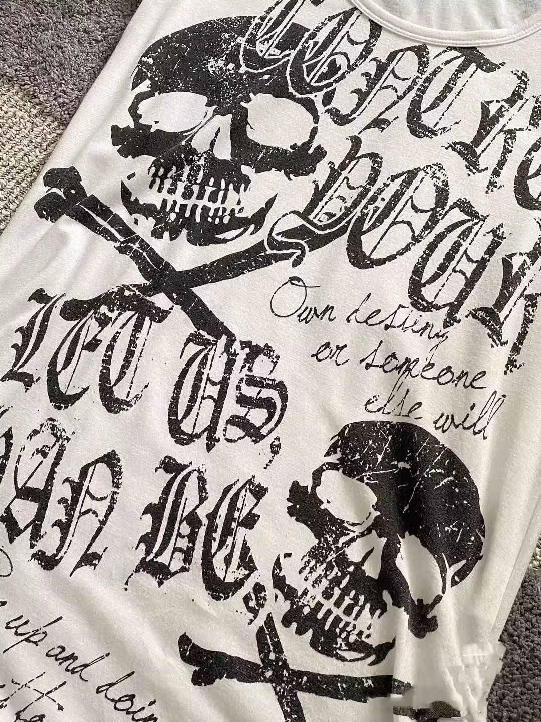 2025 새로운 틈새 슬림 핏 슬리밍 아메리칸 스타일 반팔 세련된 블랙 스컬 탑 올 매치 티셔츠 트렌디 인 여성스토어 가기