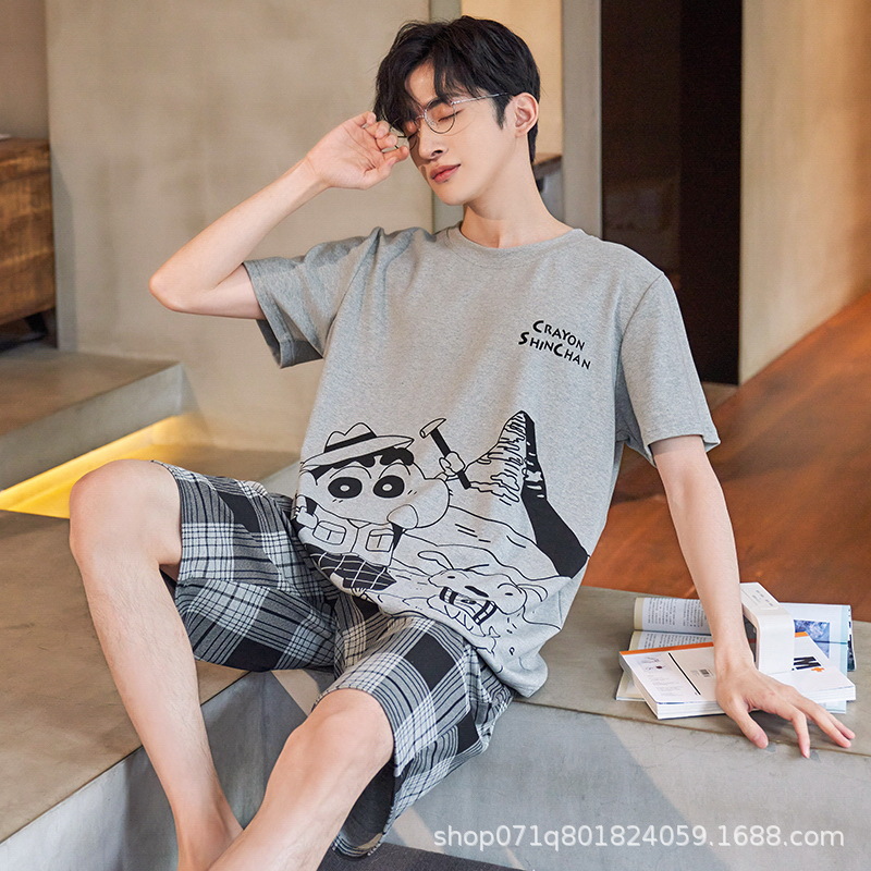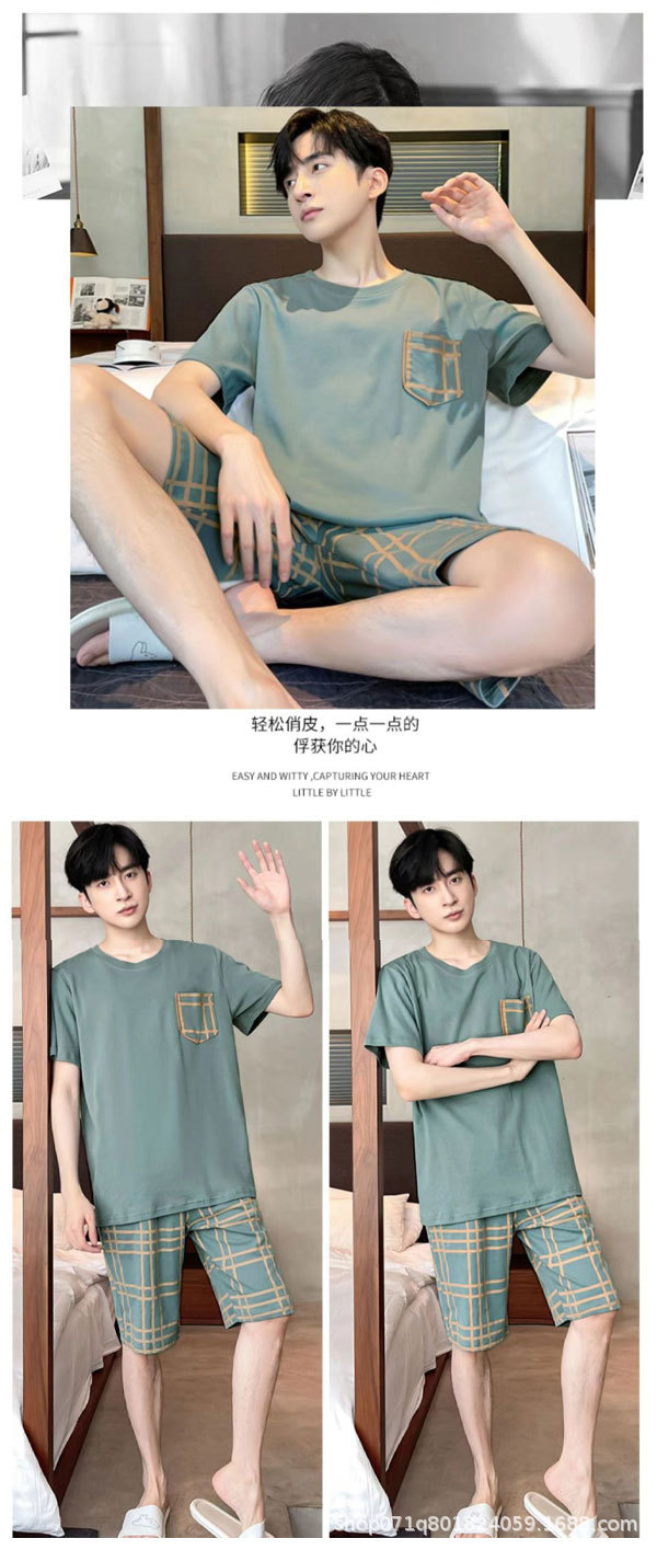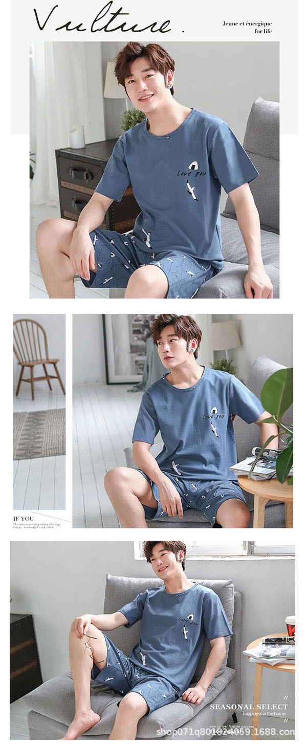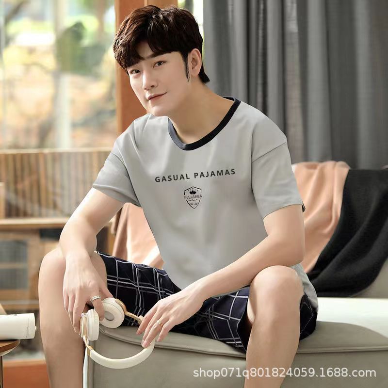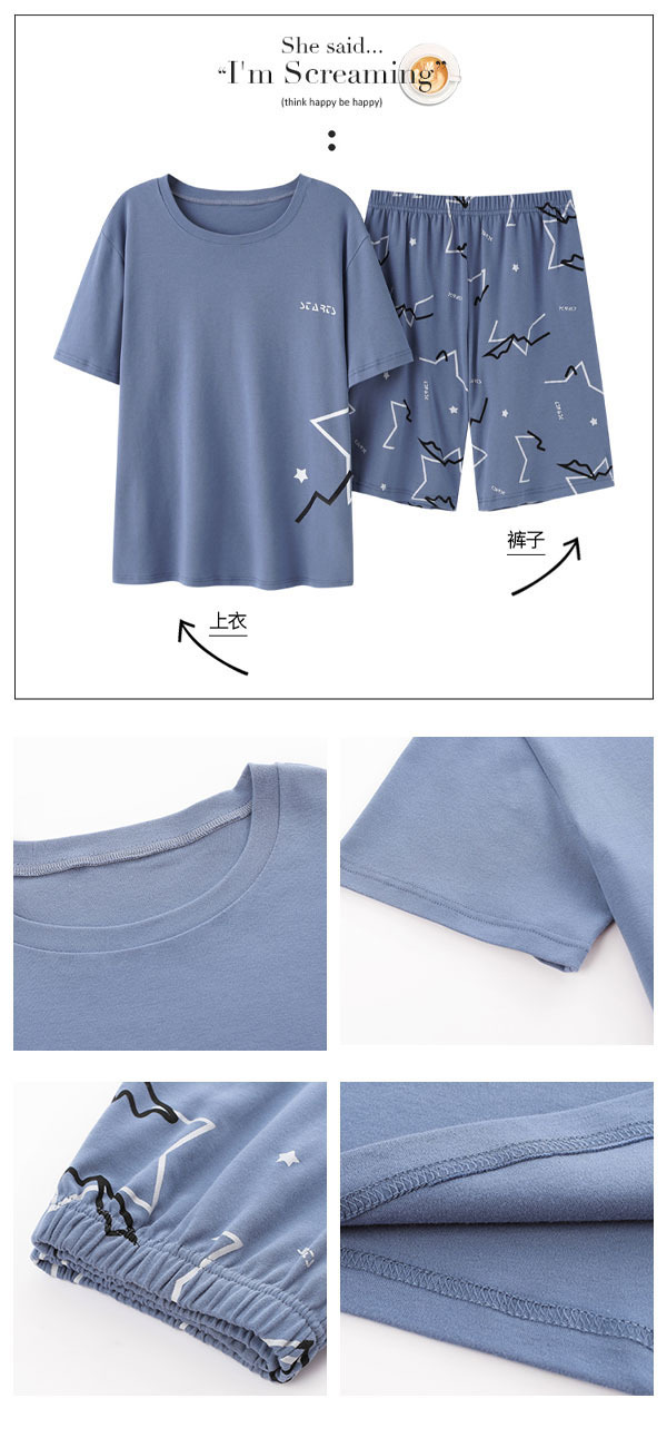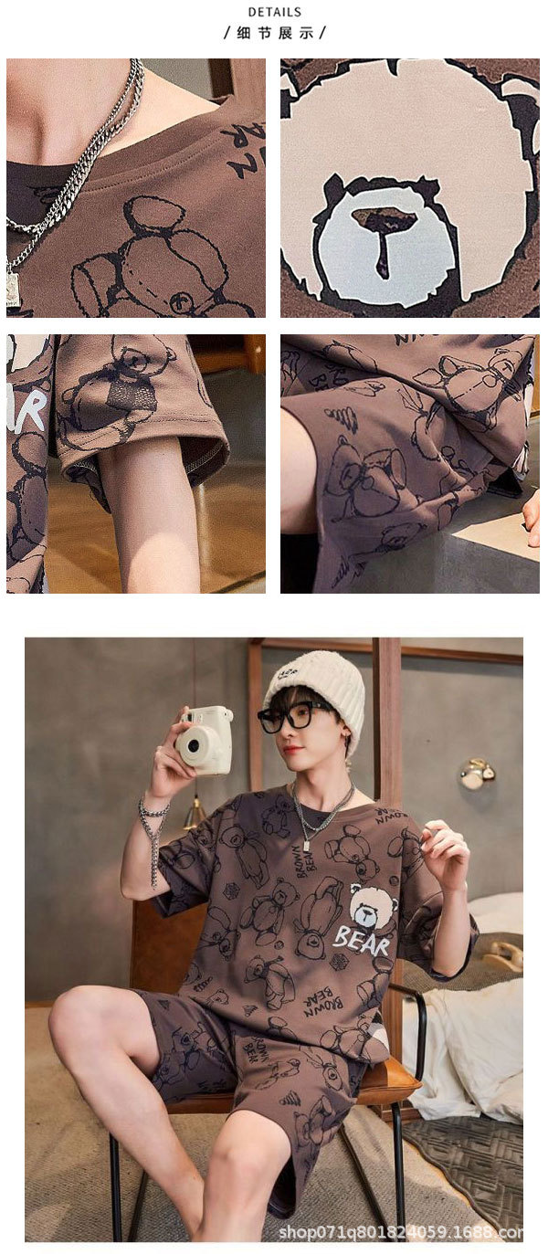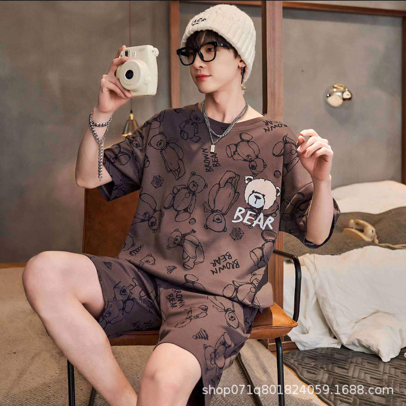 여름 한국 스타일 만화 남자 잠옷 간단한 느슨한 짧은 소매 반바지 얇은 잠옷 세트 집 옷스토어 가기