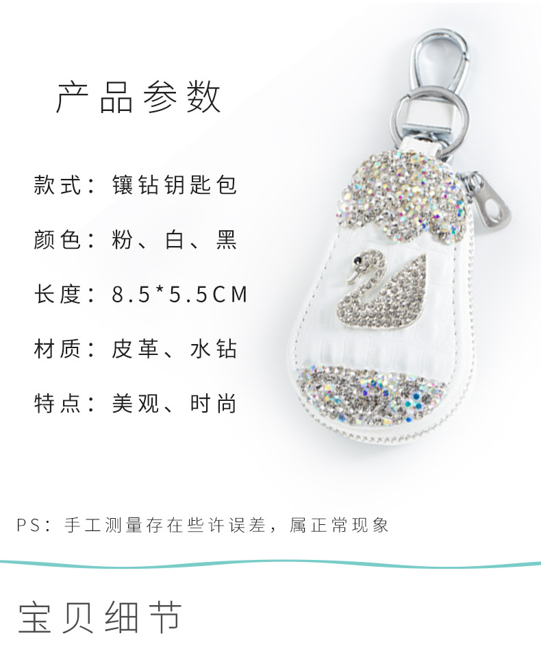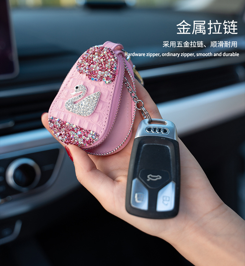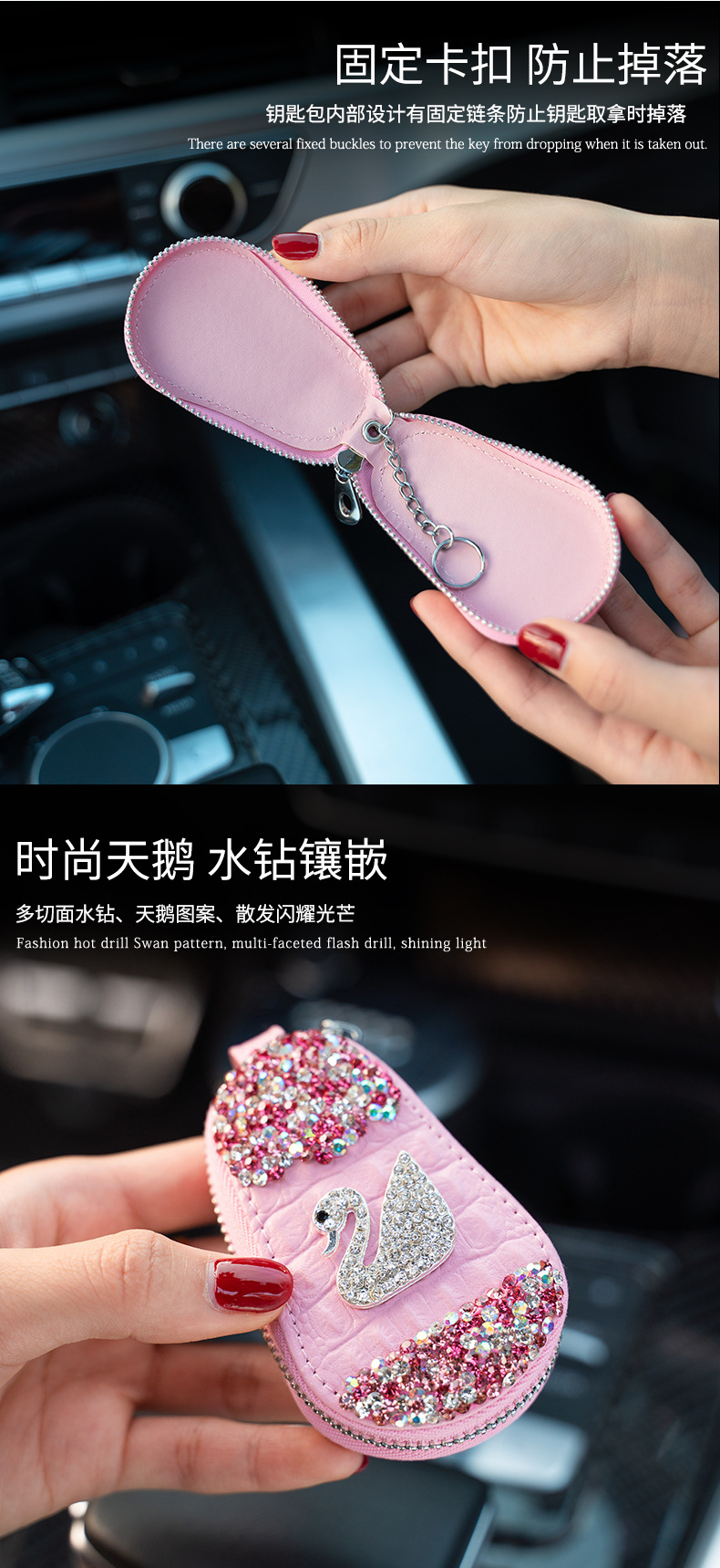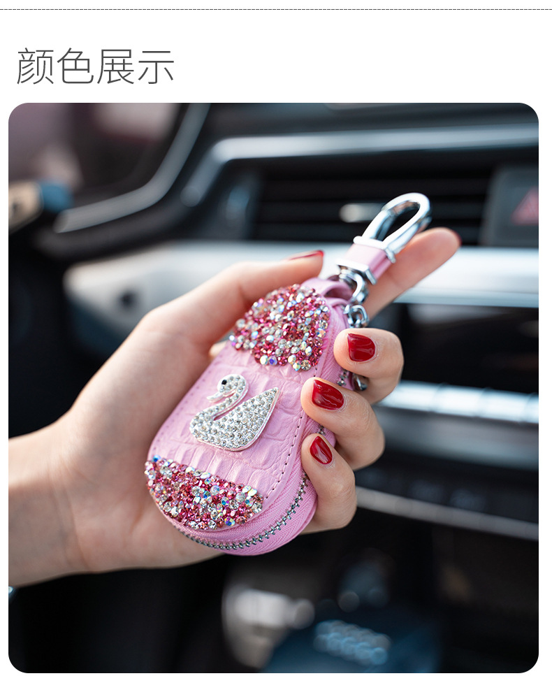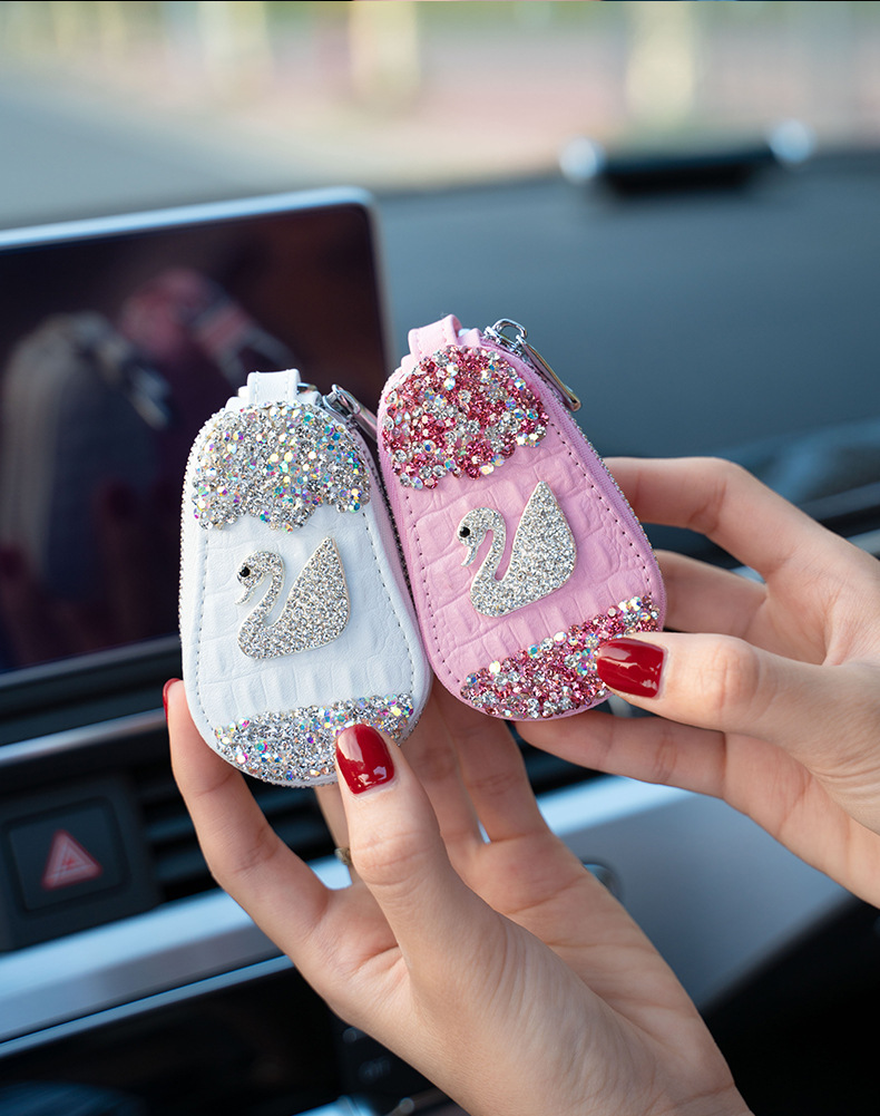 자동차 키 케이스 다이아몬드 상감 귀여운 스완 키 가죽 케이스 펜던트 여성 자동차 키 보호 커버 장식 용품