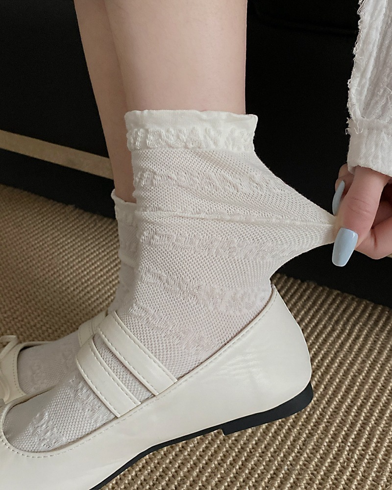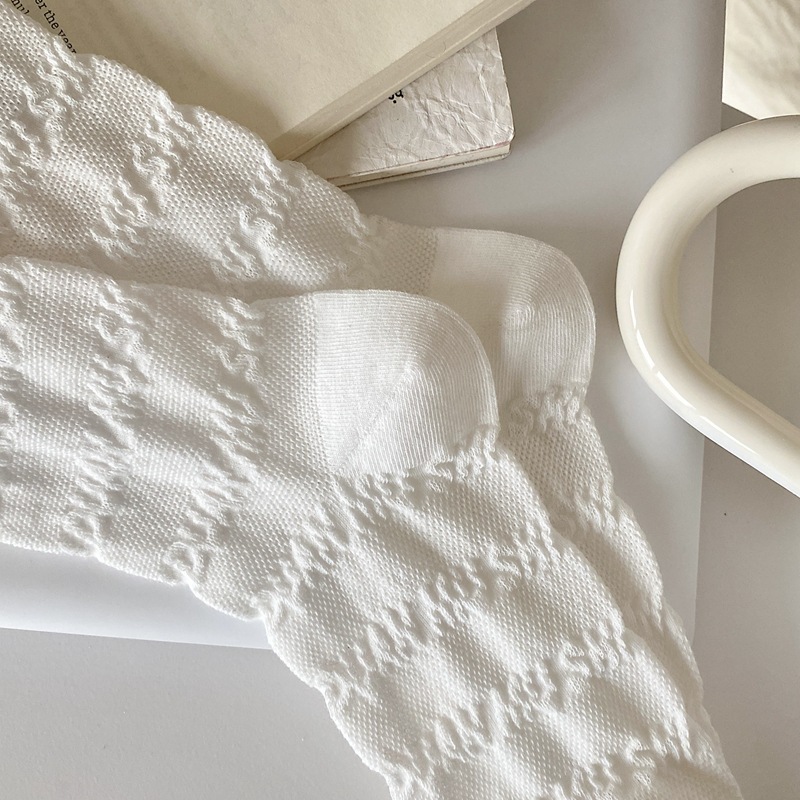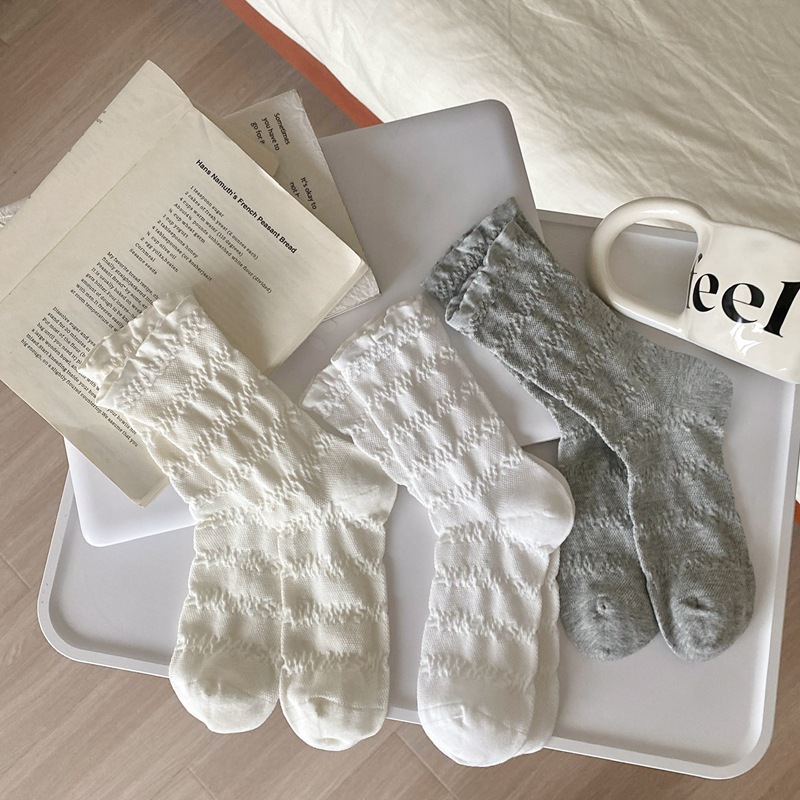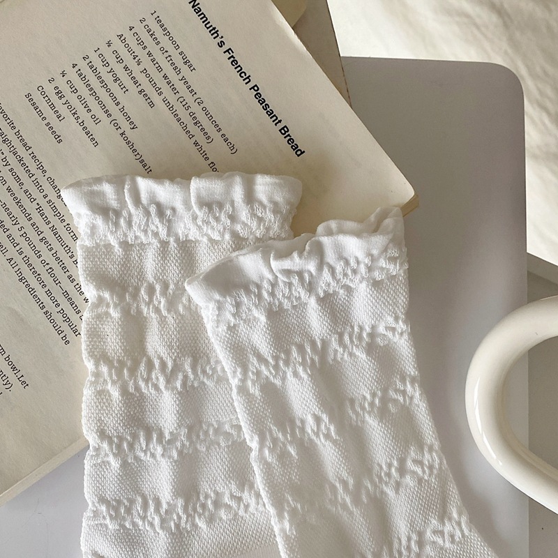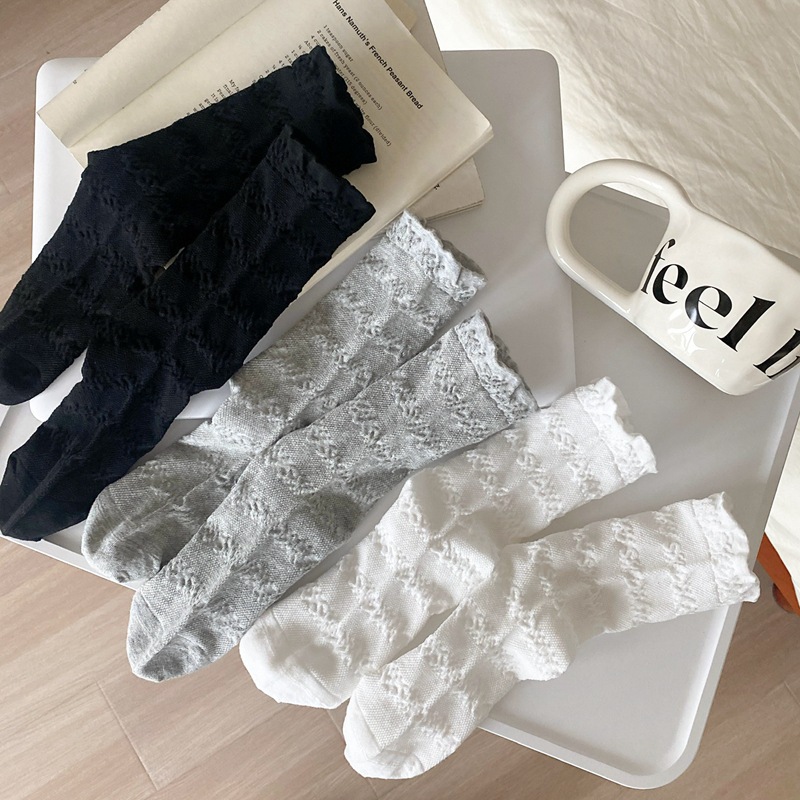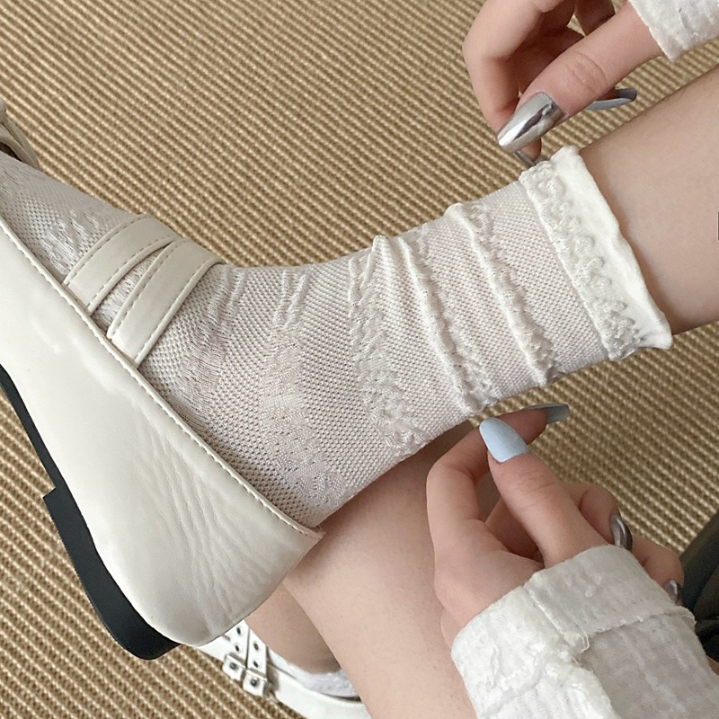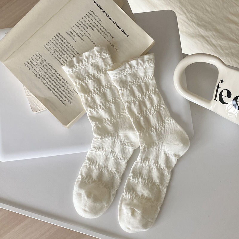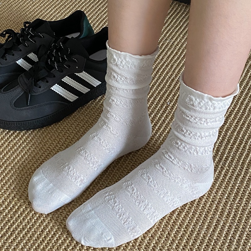 봄과 여름 프랑스 단색 뼈없는 주름 흰색 여성 양말 다재다능한면 중간 튜브 양말 메쉬 얇은 한국 케이크 양말스토어 가기