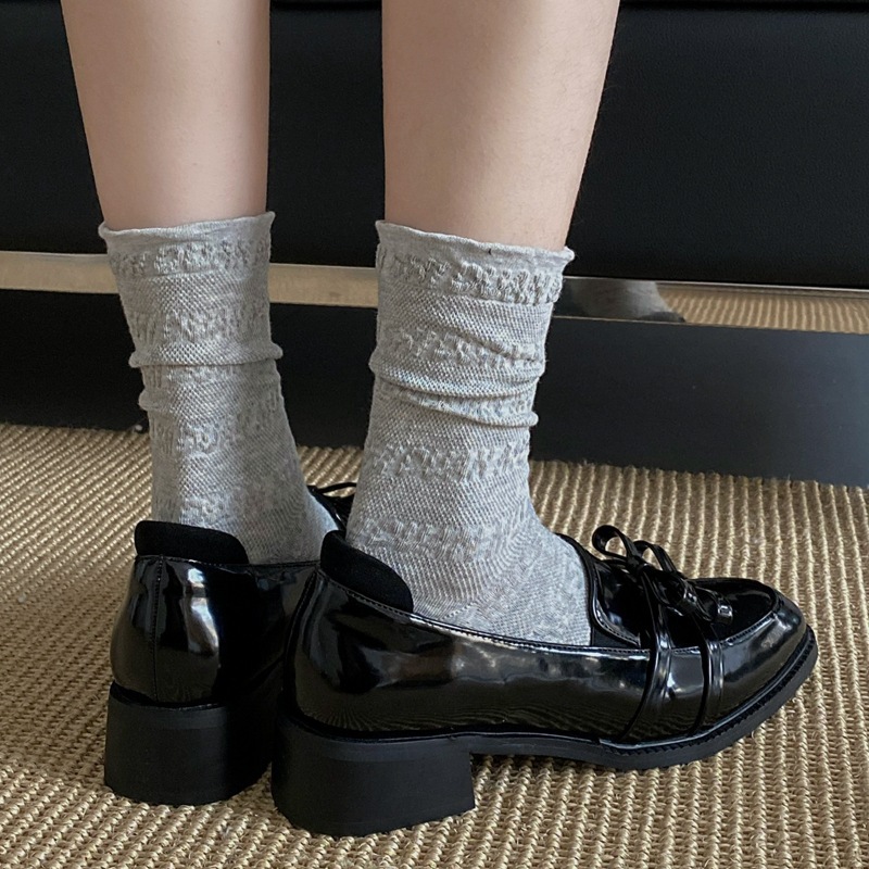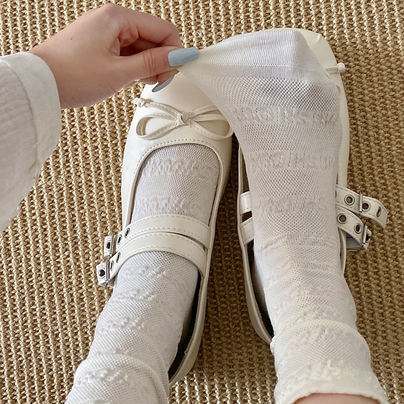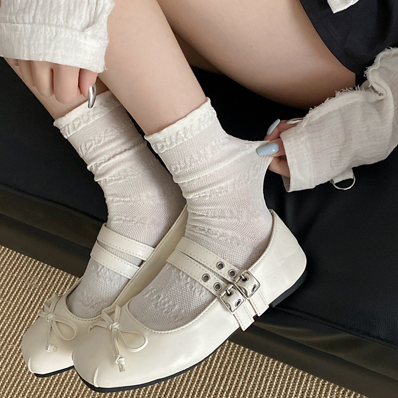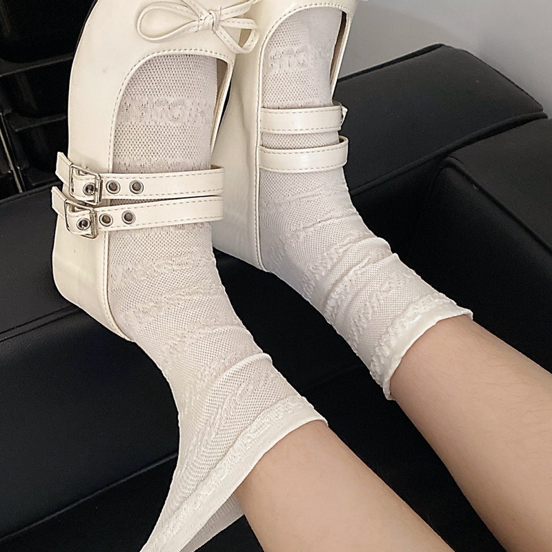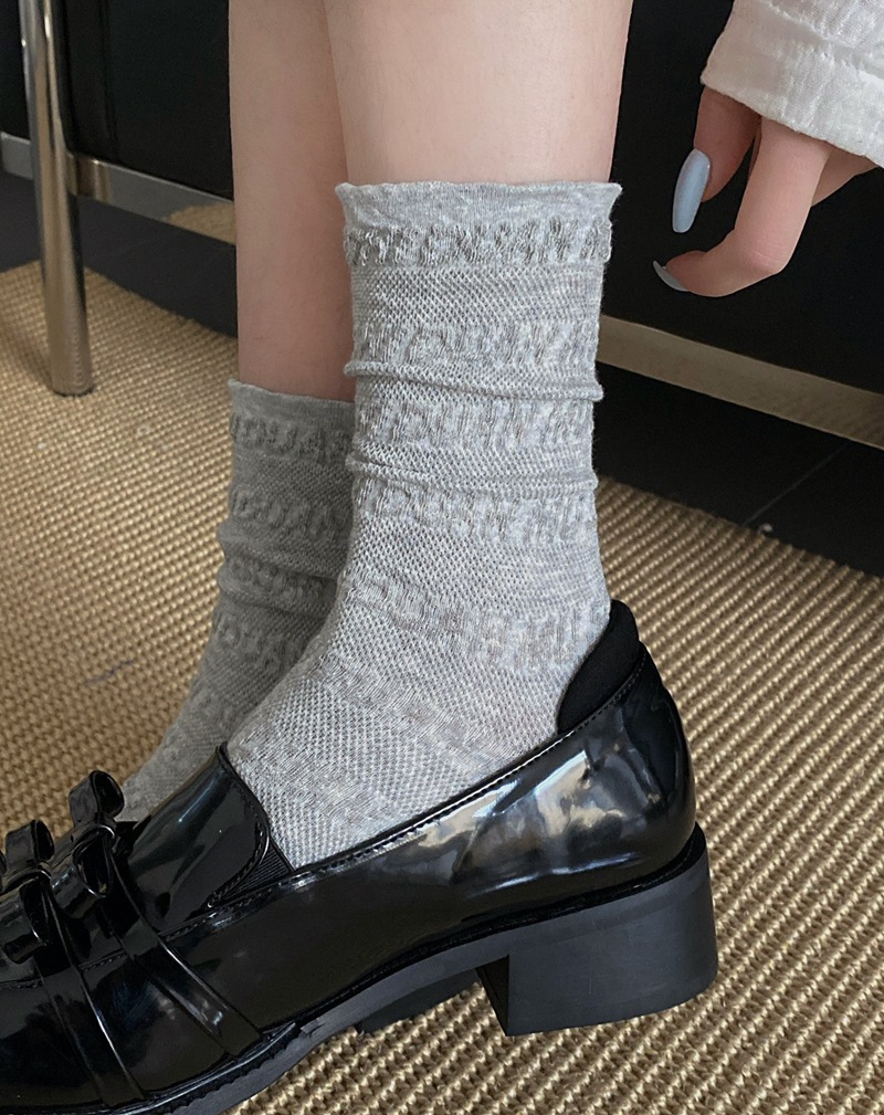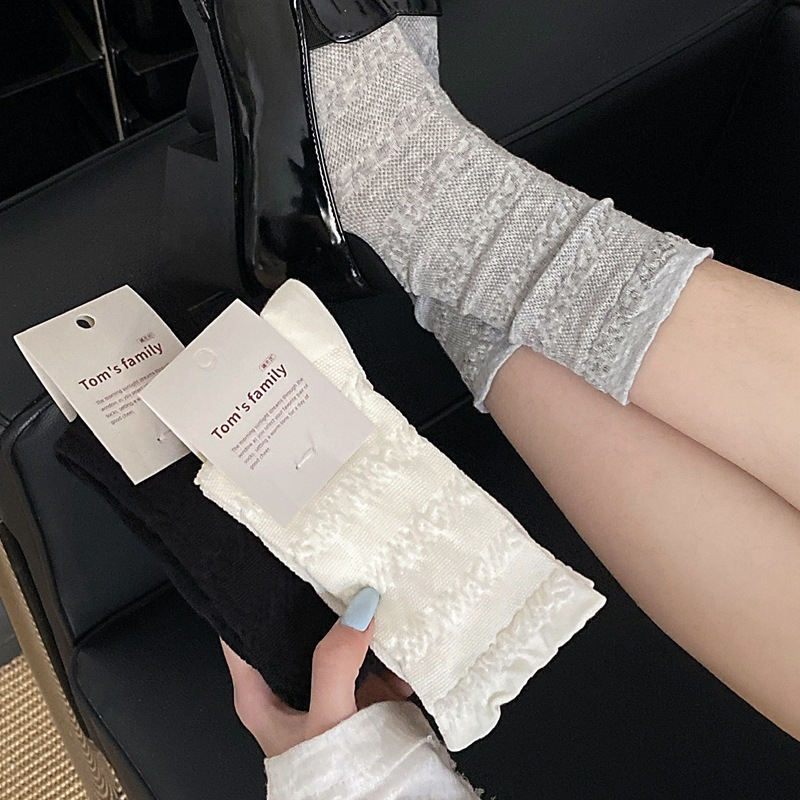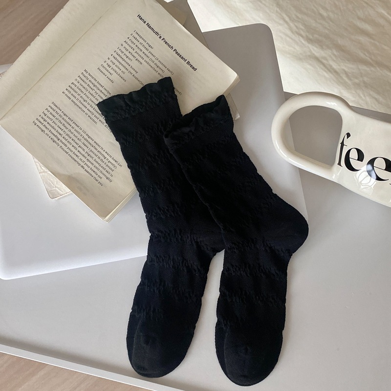 봄과 여름 프랑스 단색 뼈없는 주름 흰색 여성 양말 다재다능한면 중간 튜브 양말 메쉬 얇은 한국 케이크 양말스토어 가기