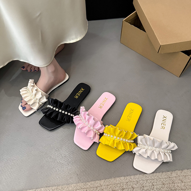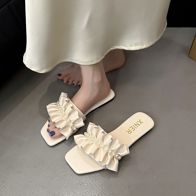 대외 무역 샌들 도매 2025 여름 새로운 광장 머리 외부 단어 비치 신발 진주 주름 낮은 뒤꿈치 슬리퍼 여성 착용스토어 가기