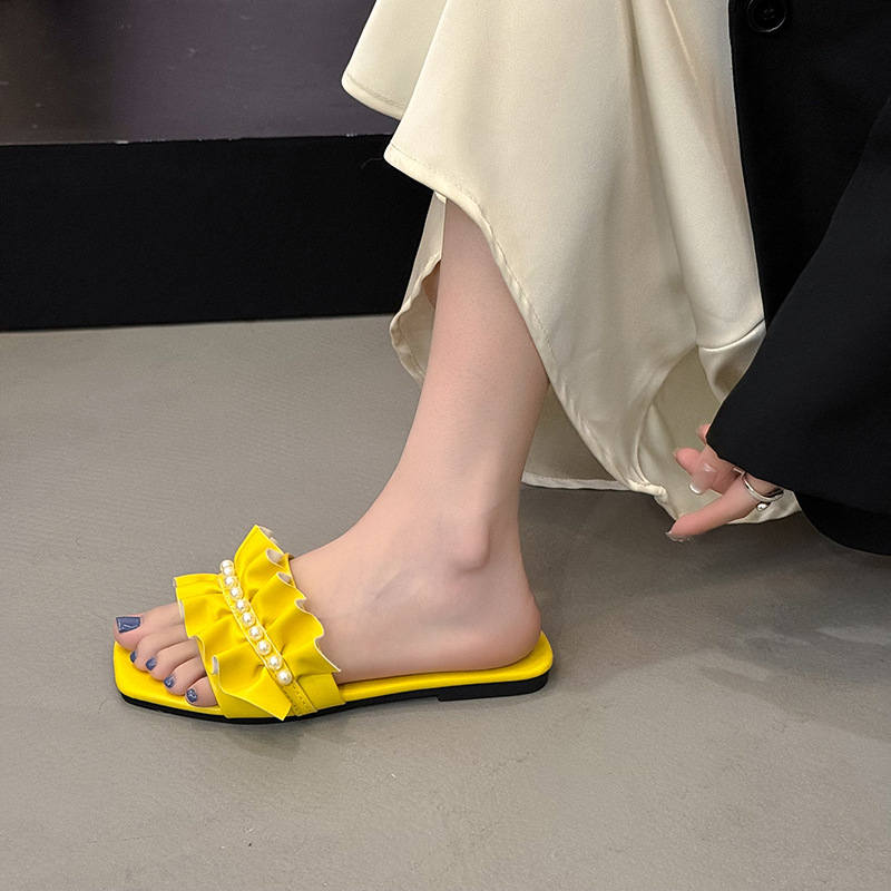 대외 무역 샌들 도매 2025 여름 새로운 광장 머리 외부 단어 비치 신발 진주 주름 낮은 뒤꿈치 슬리퍼 여성 착용