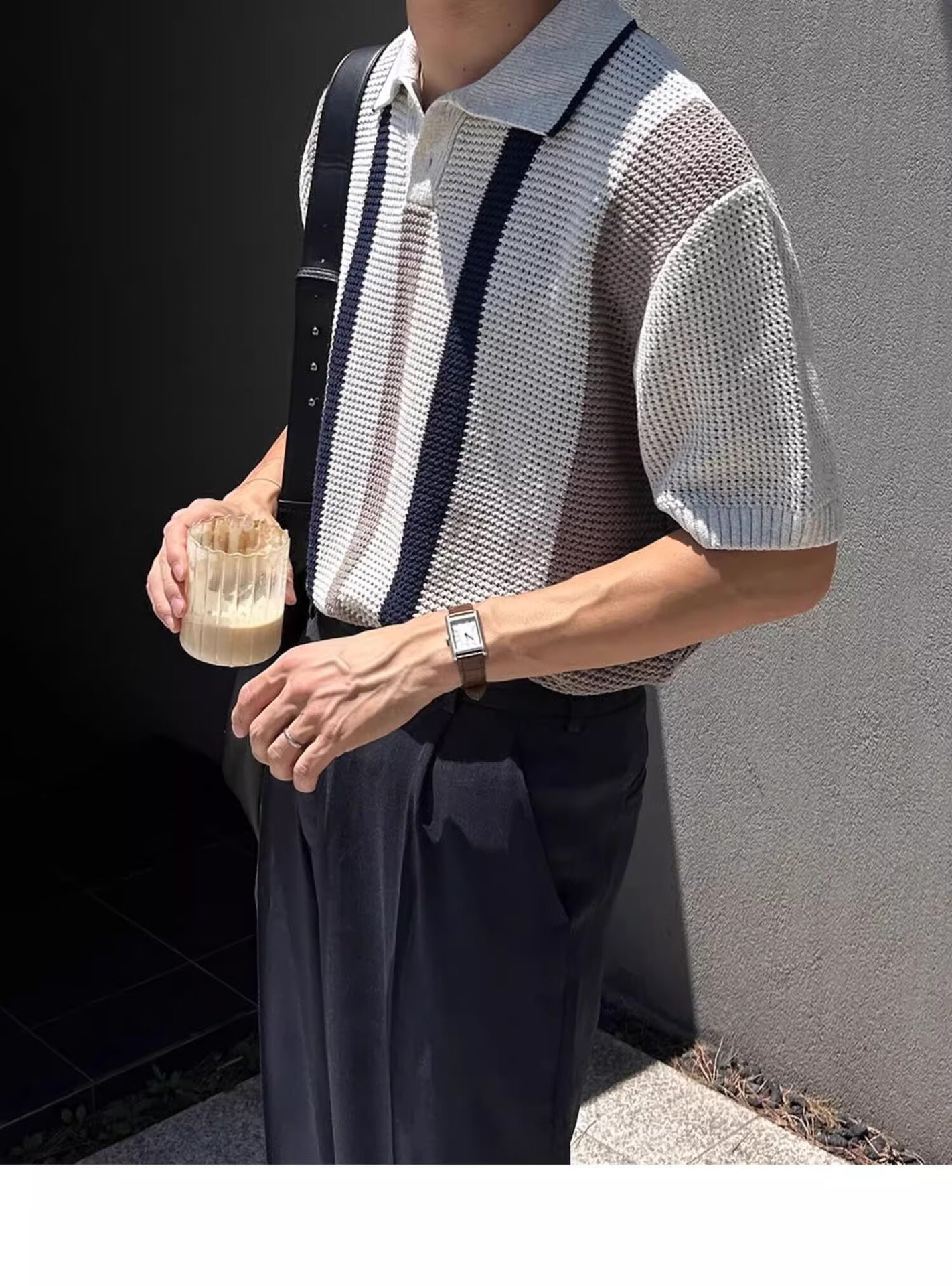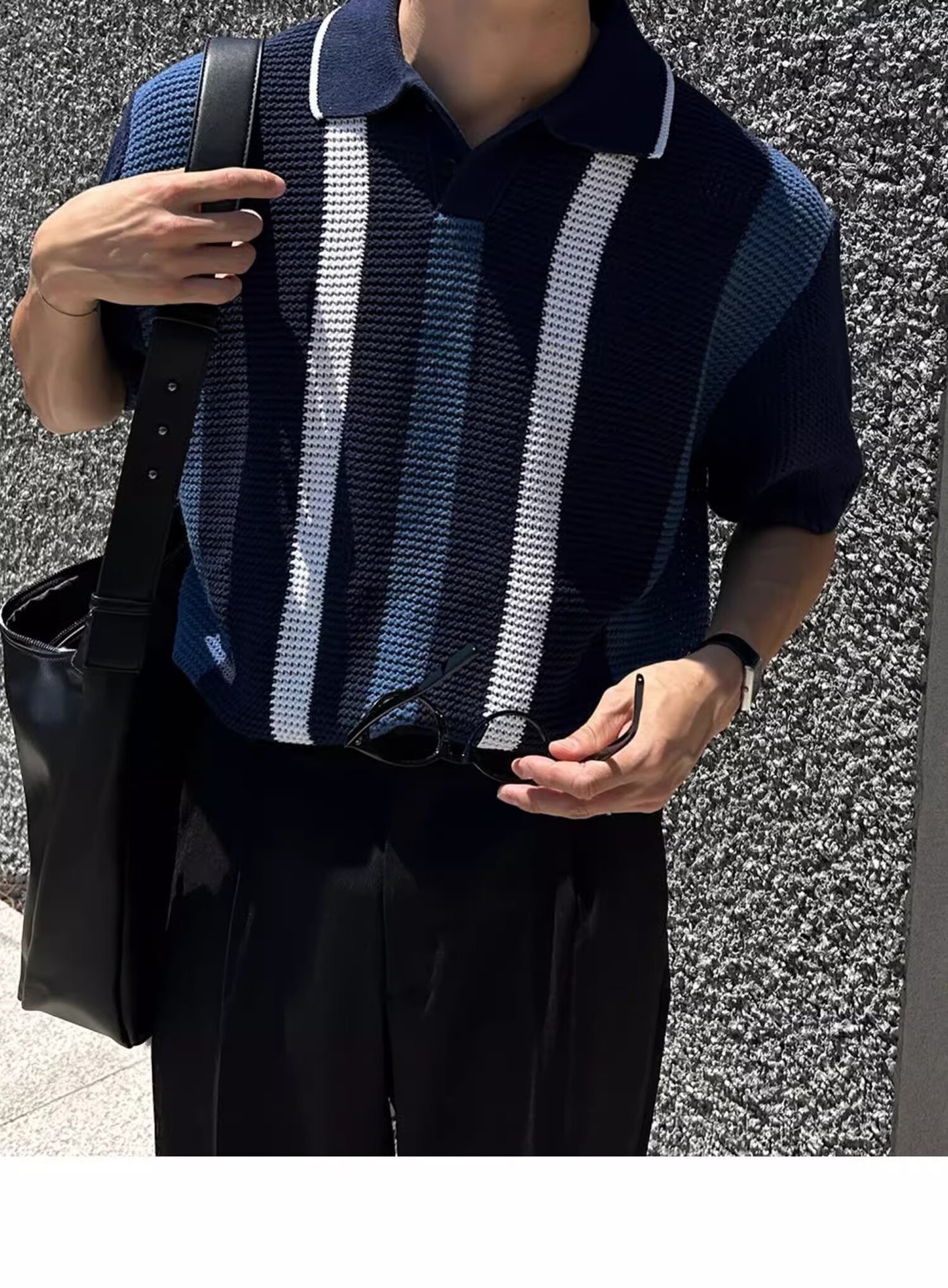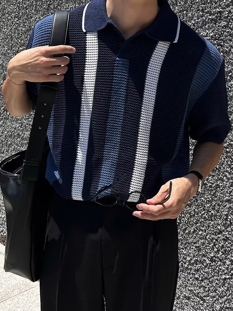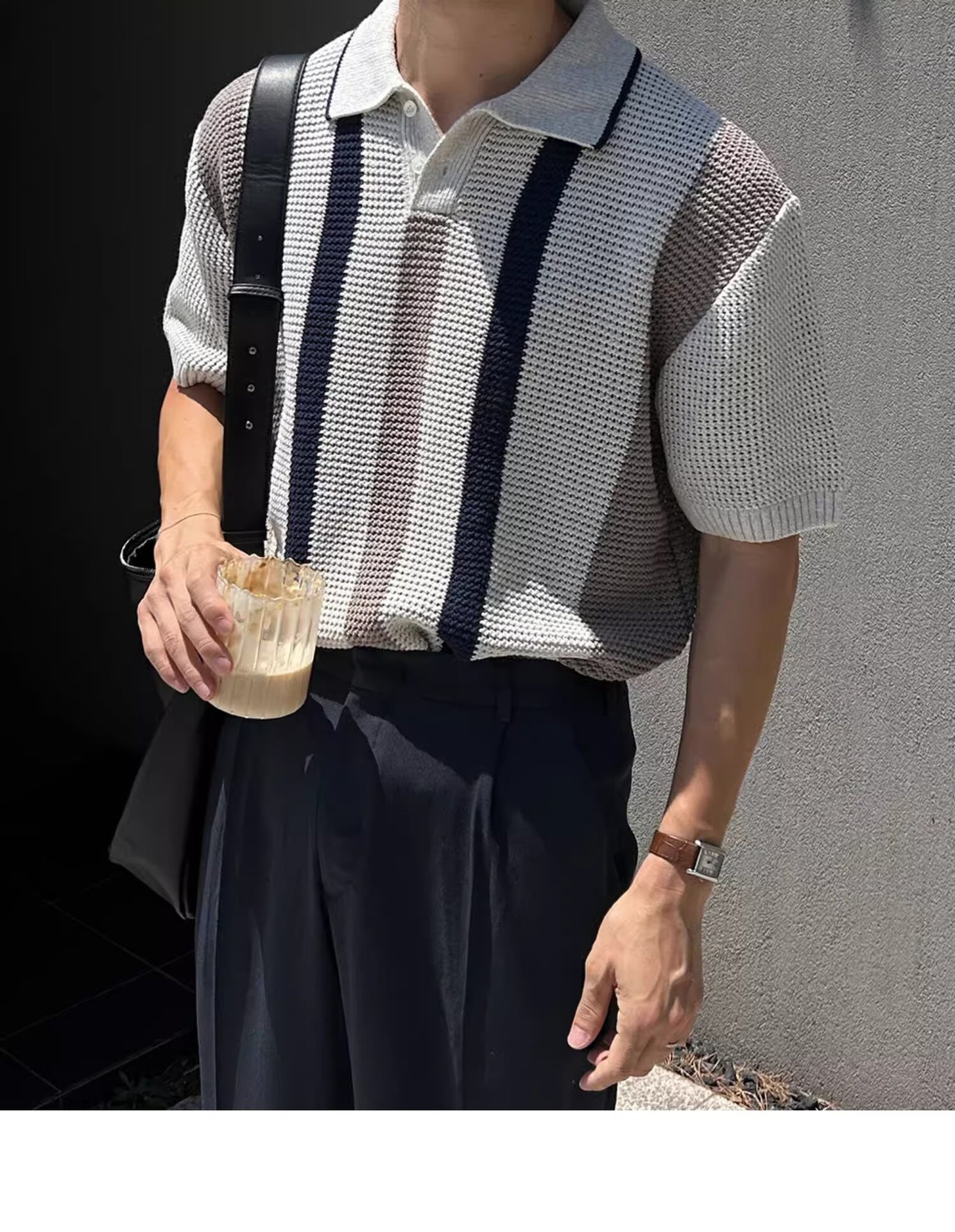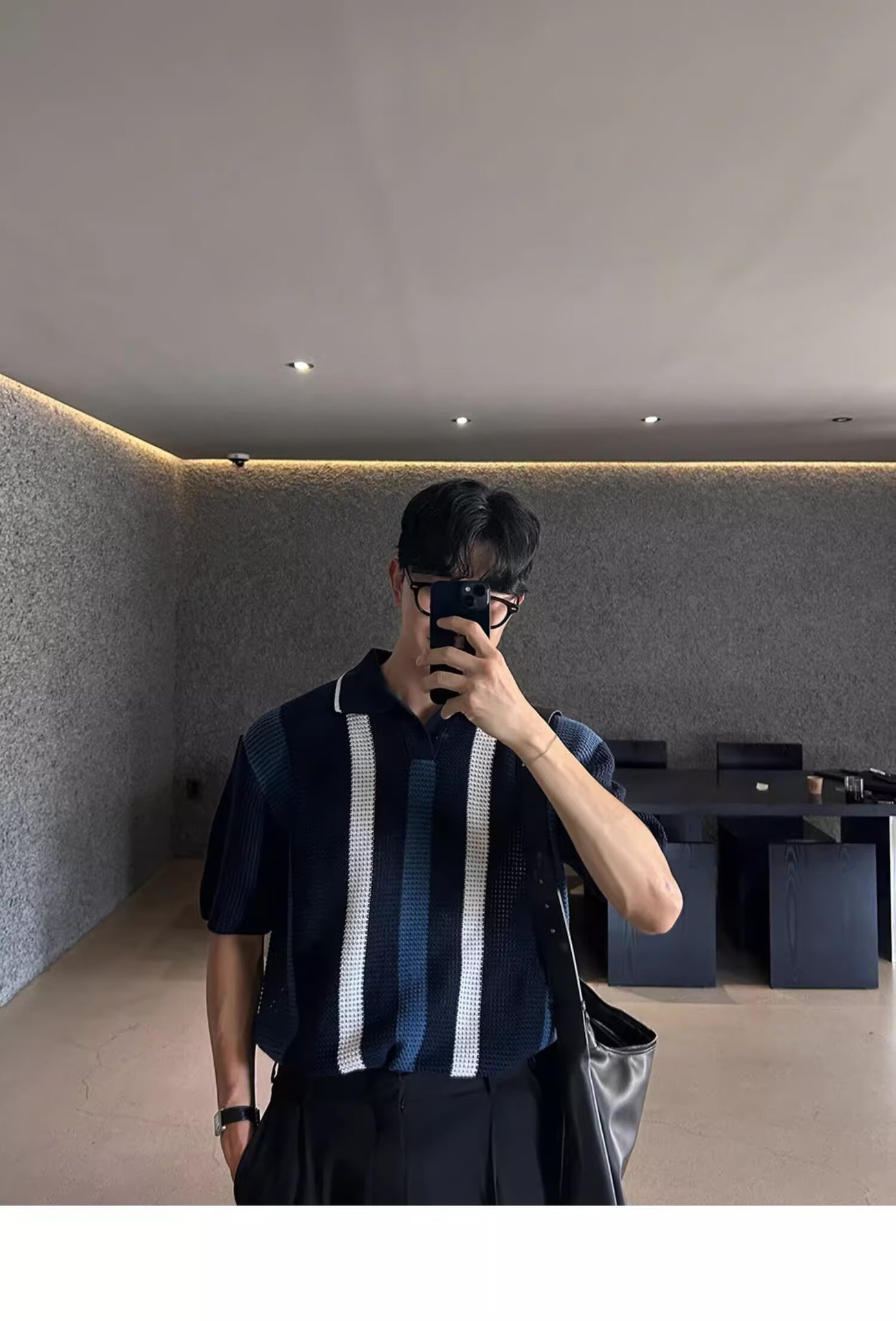 국경 간 여름 줄무늬 랩 폴로 셔츠 디자인 틈새 남자의 느슨한 니트 셔츠 한국 스타일 한국 얇은 티셔츠스토어 가기