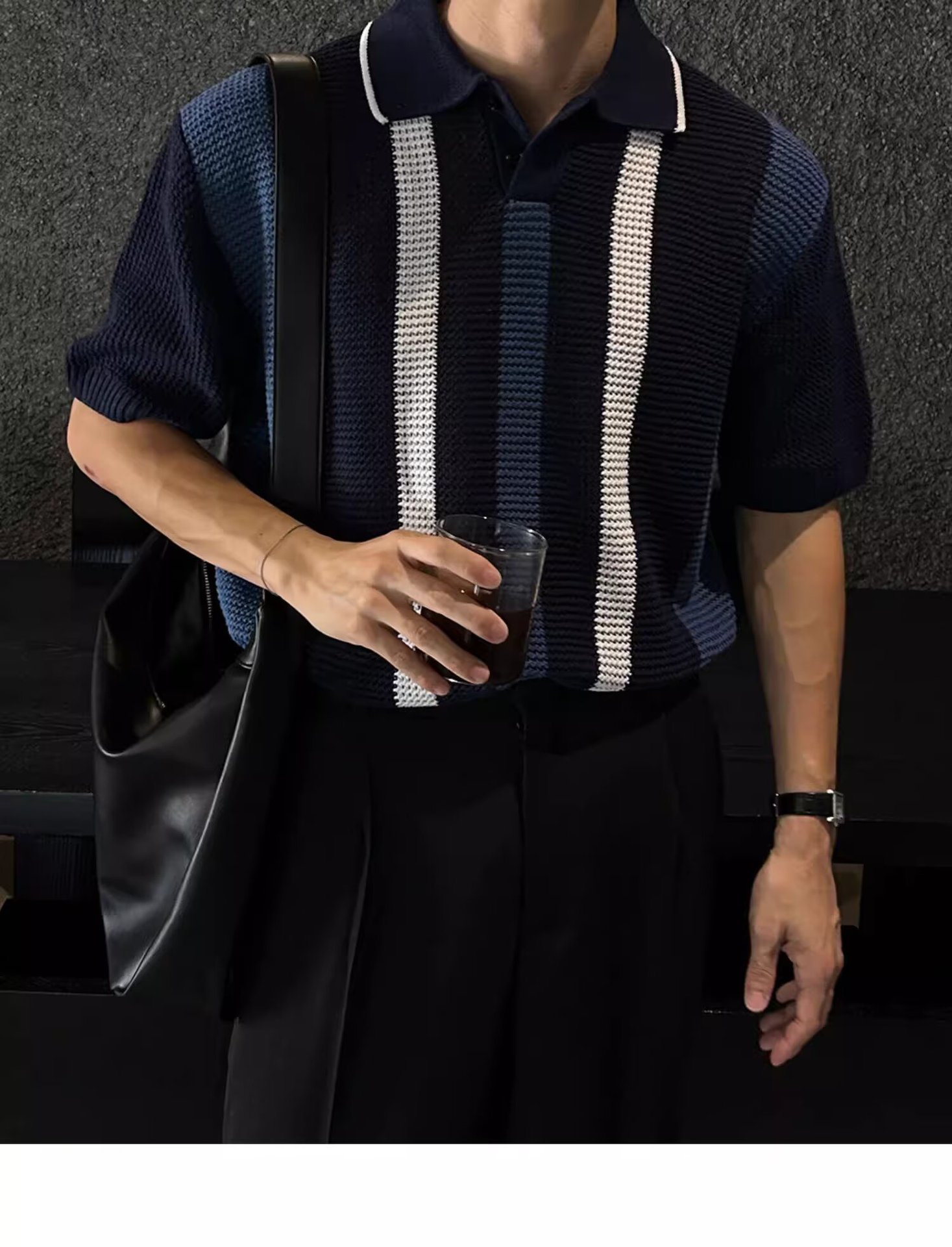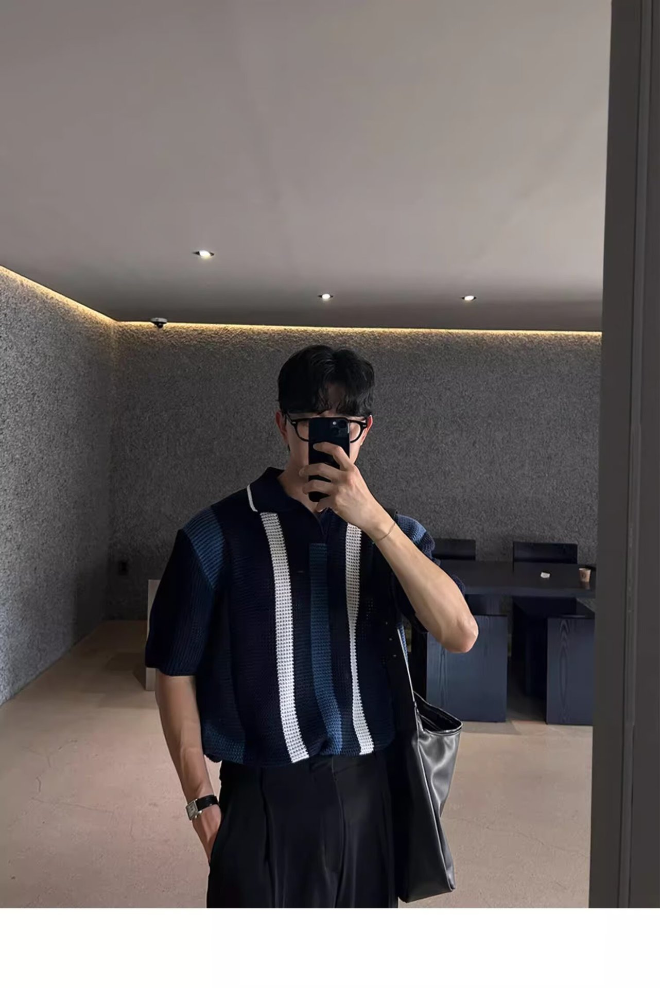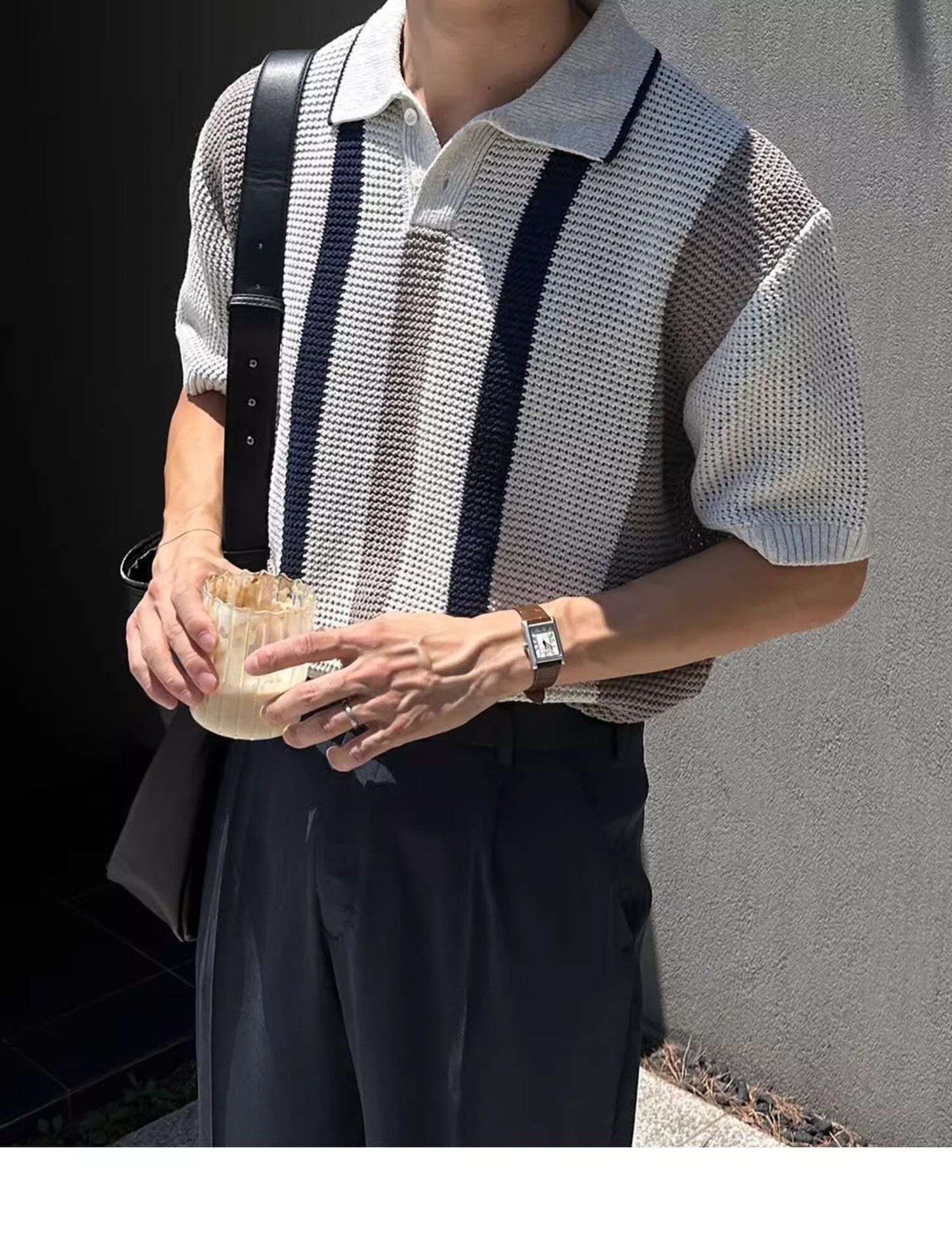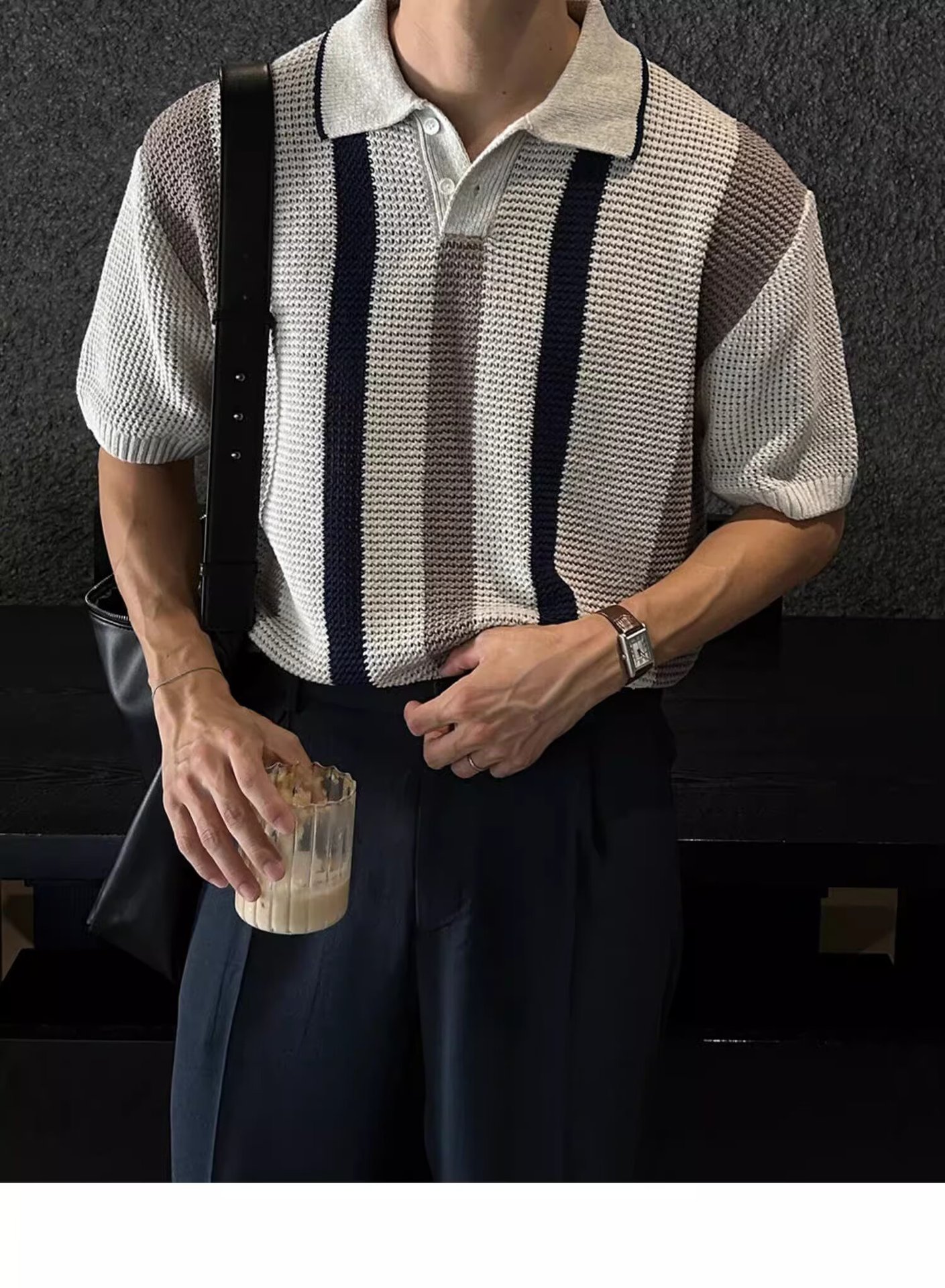 국경 간 여름 줄무늬 랩 폴로 셔츠 디자인 틈새 남자의 느슨한 니트 셔츠 한국 스타일 한국 얇은 티셔츠스토어 가기
