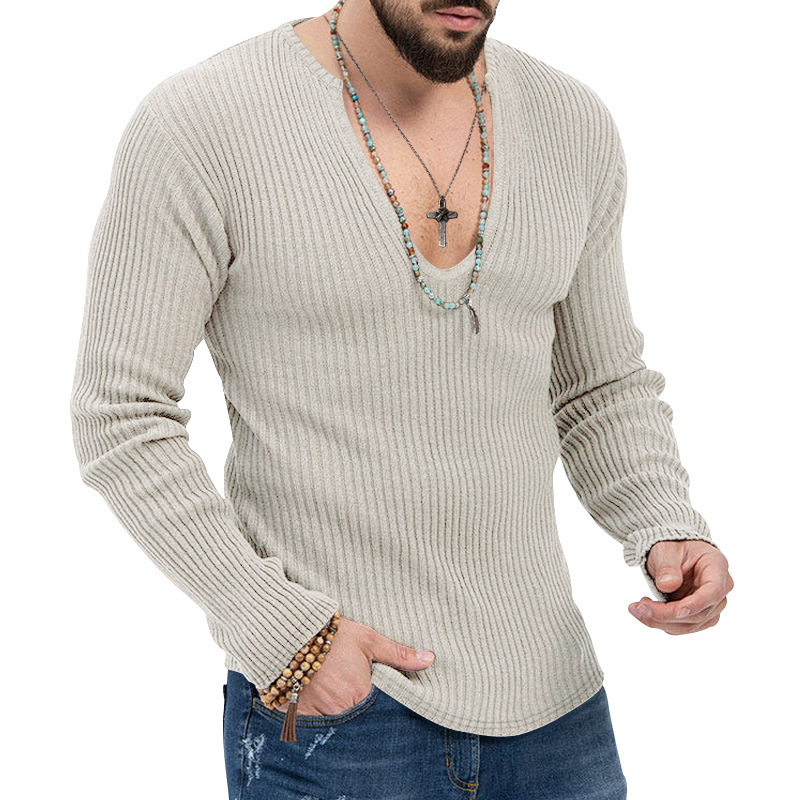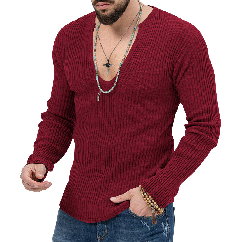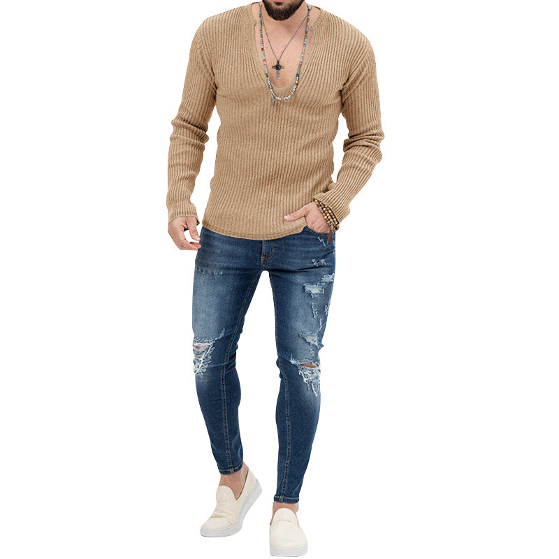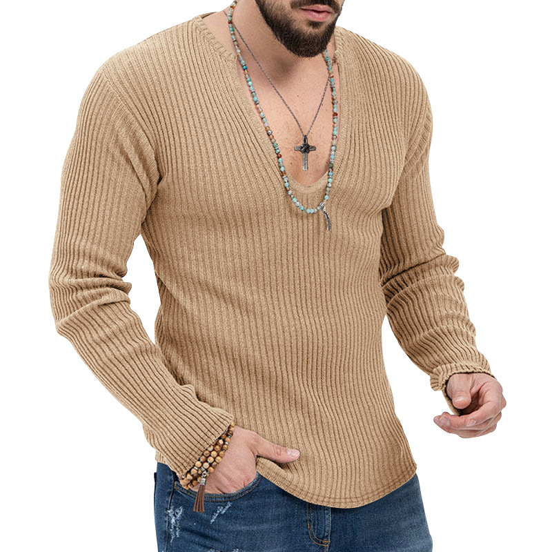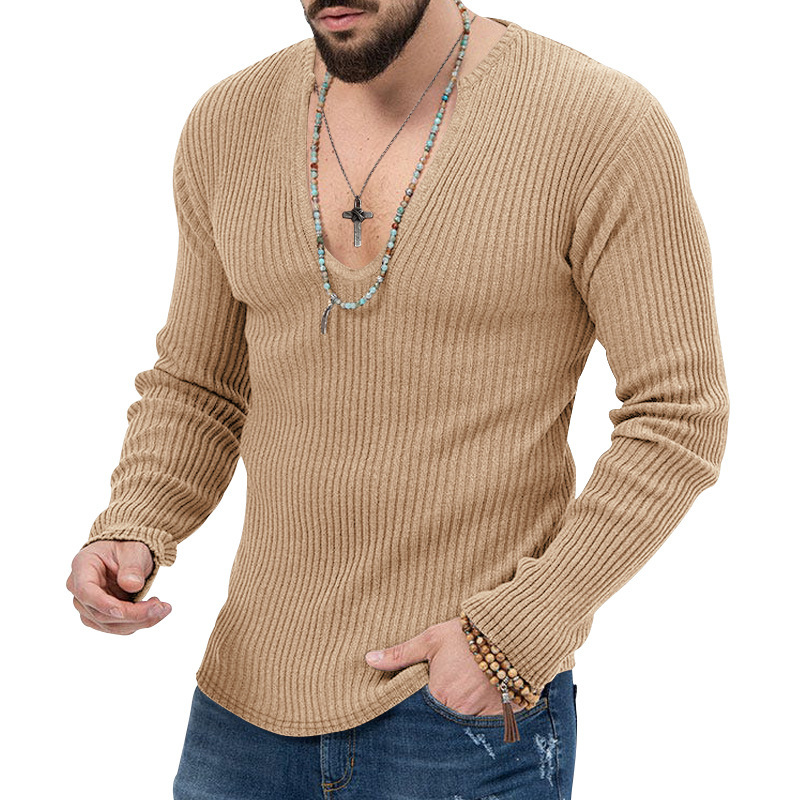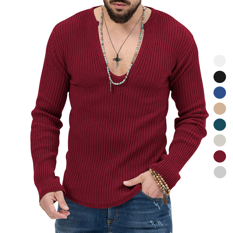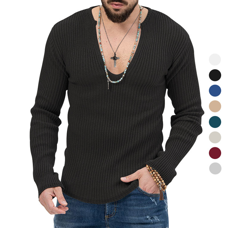 아마존 유럽과 미국의 국경 2025 유럽과 미국의 남성 트렌디 한 봄과 가을 깊은 V 넥 남자의 새로운 단색 니트 긴팔 셔츠