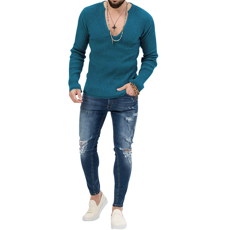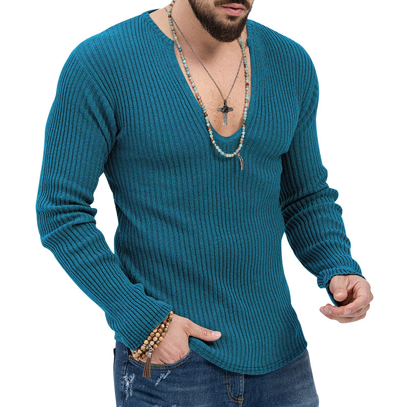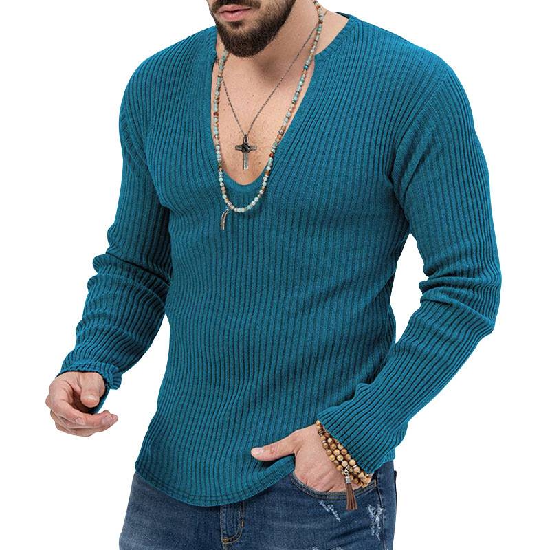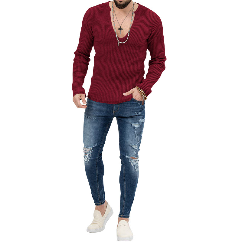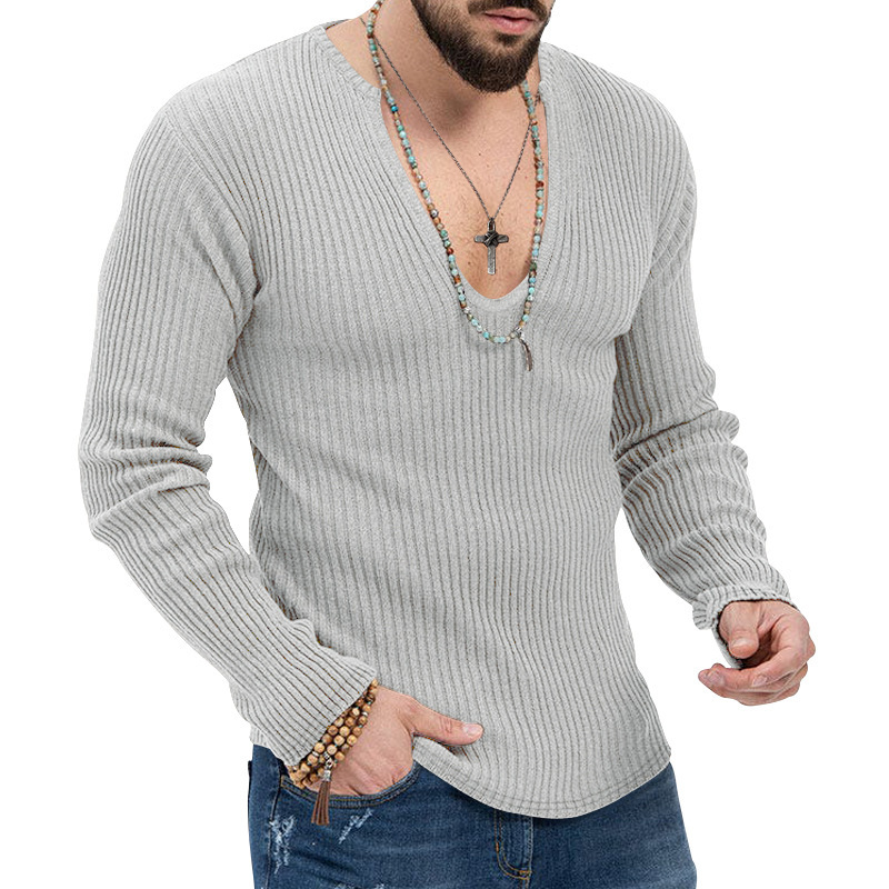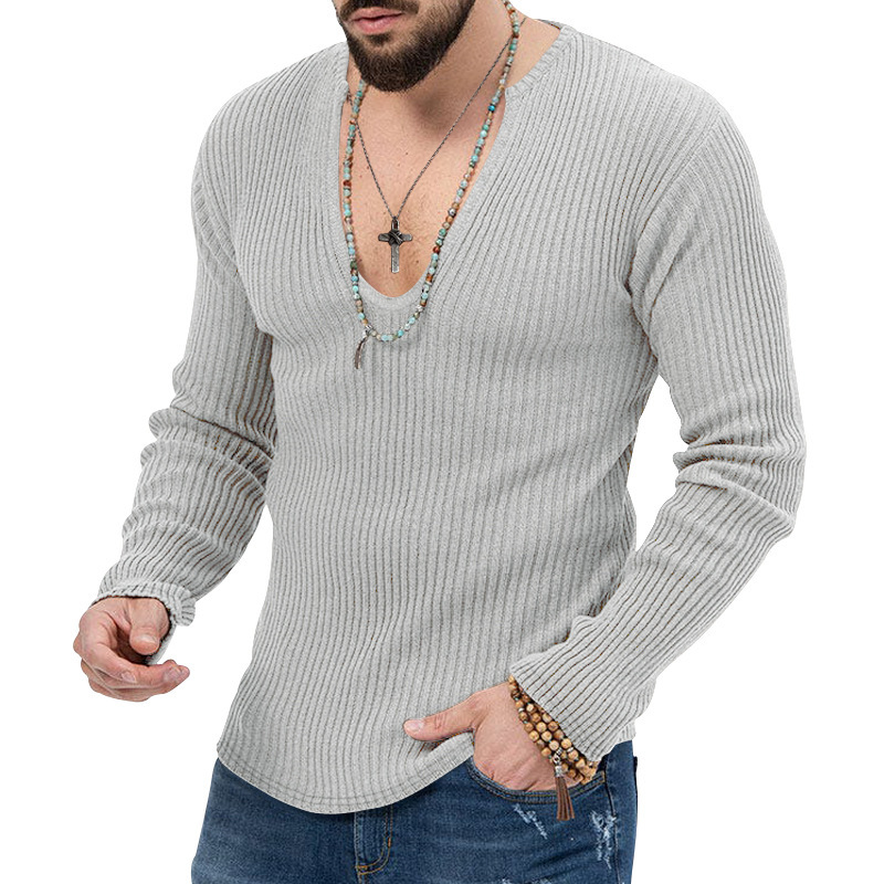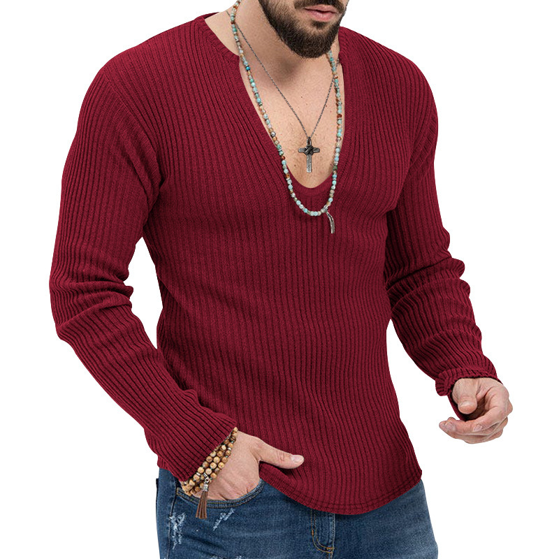 아마존 유럽과 미국의 국경 2025 유럽과 미국의 남성 트렌디 한 봄과 가을 깊은 V 넥 남자의 새로운 단색 니트 긴팔 셔츠