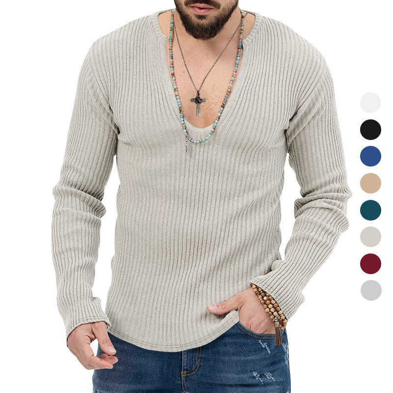 아마존 유럽과 미국의 국경 2025 유럽과 미국의 남성 트렌디 한 봄과 가을 깊은 V 넥 남자의 새로운 단색 니트 긴팔 셔츠스토어 가기