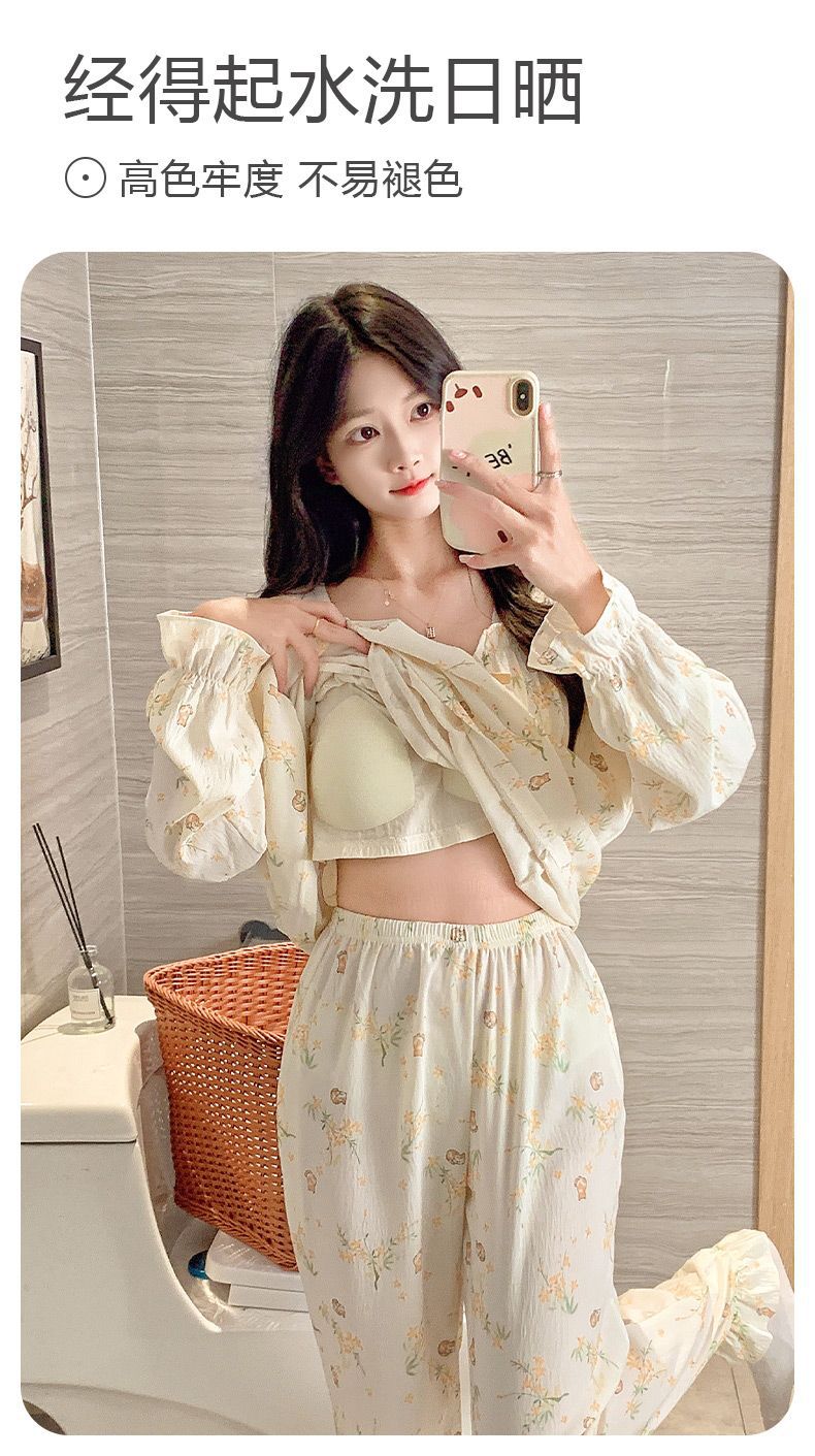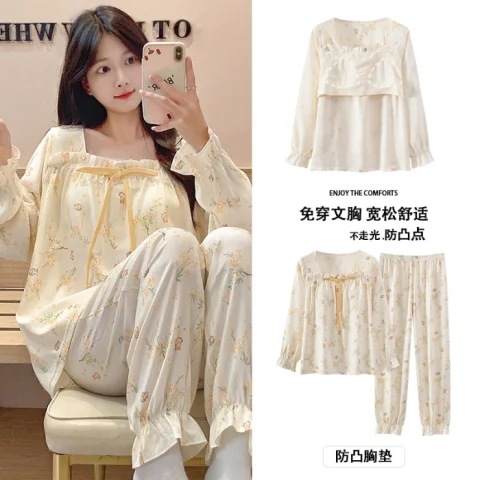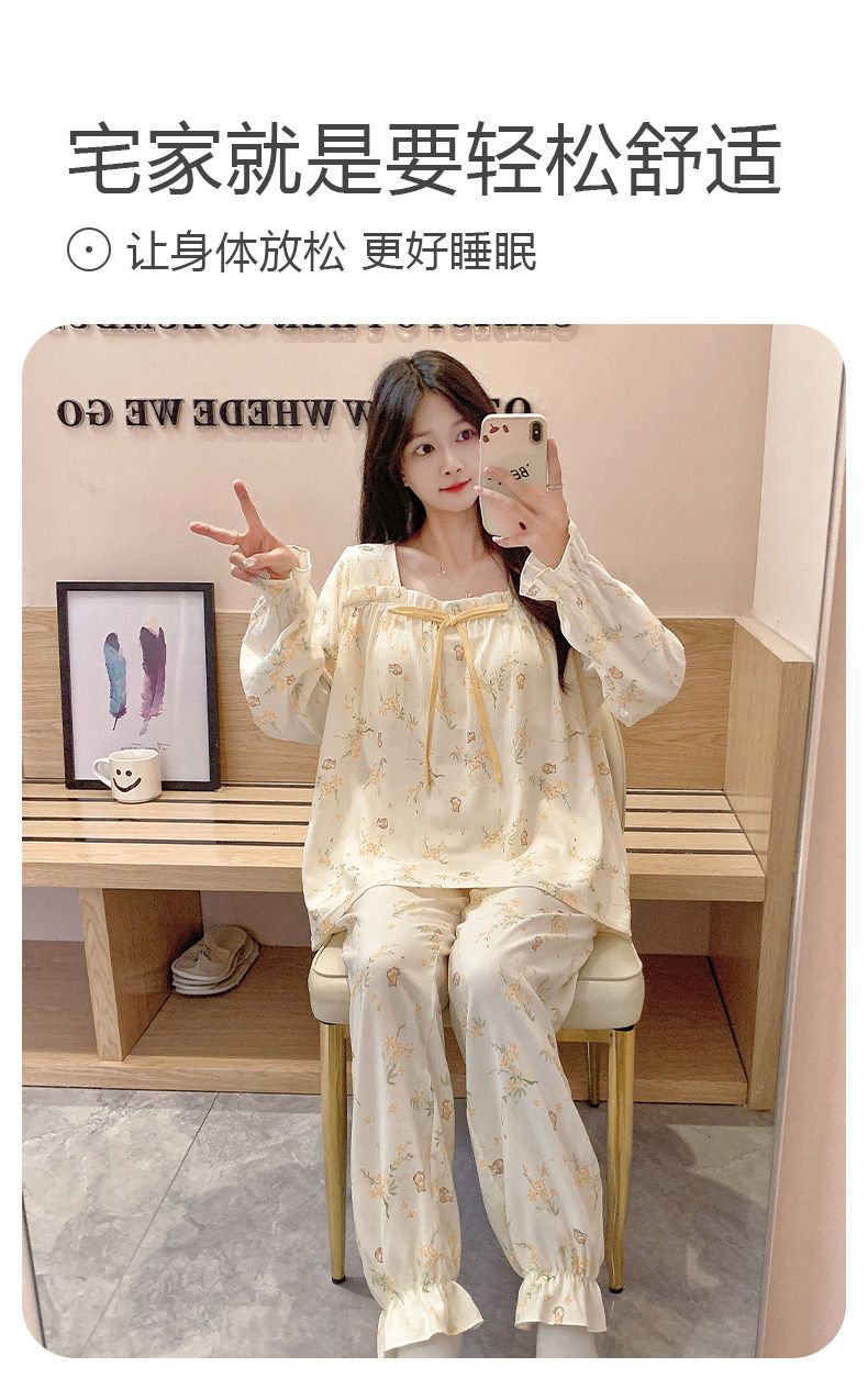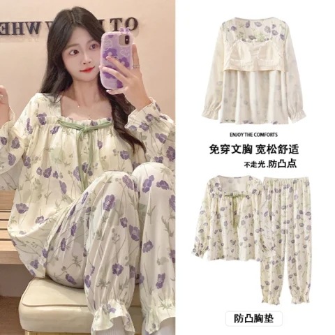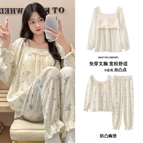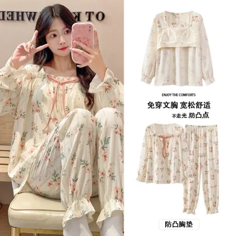 가슴 패드와 여성 잠옷 봄과 가을 새로운 구름 면 달콤한 공주 스타일 홈 옷 외부 착용 긴 소매 세트 머리스토어 가기