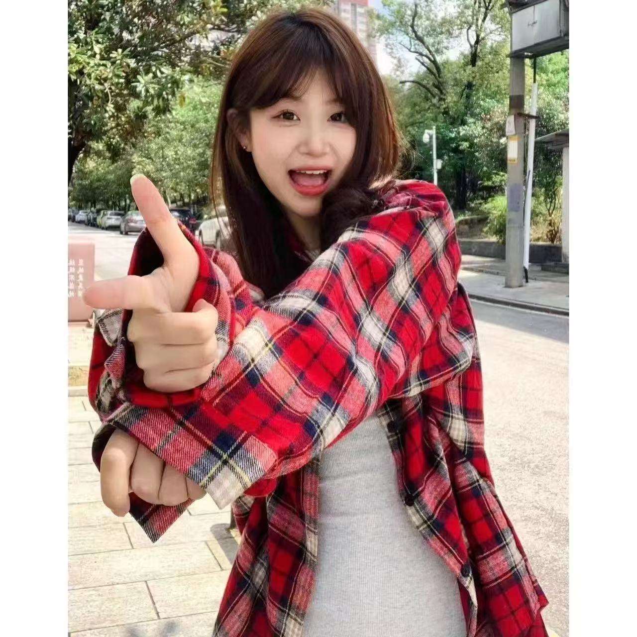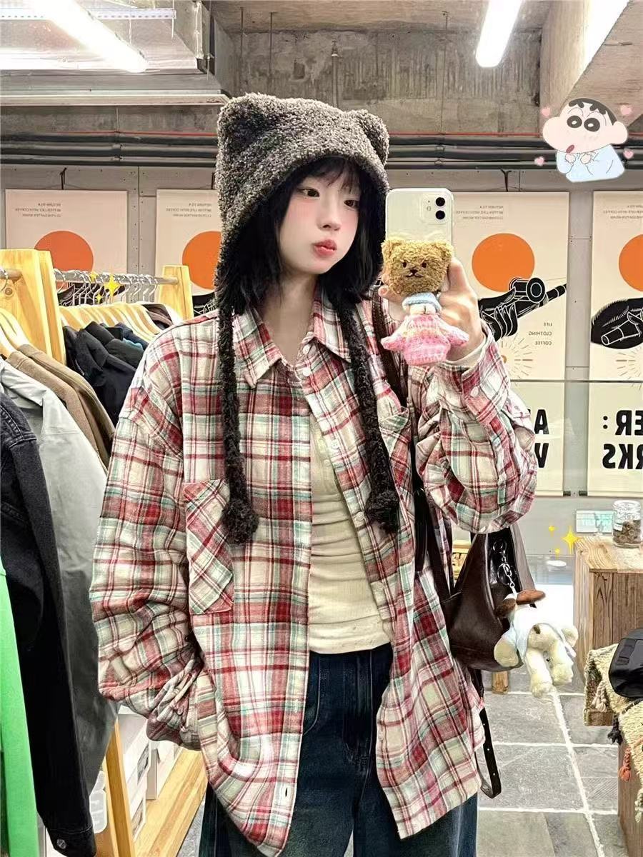 • K08 레드 그리드#코튼 체크 무늬 셔츠