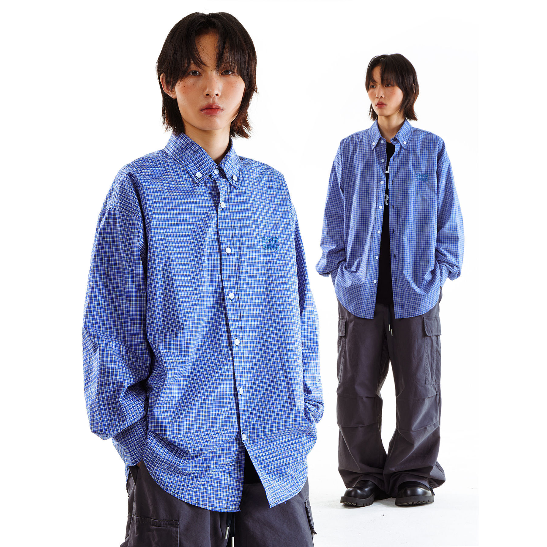 • C01 블루 그리드#코튼 체크 무늬 셔츠