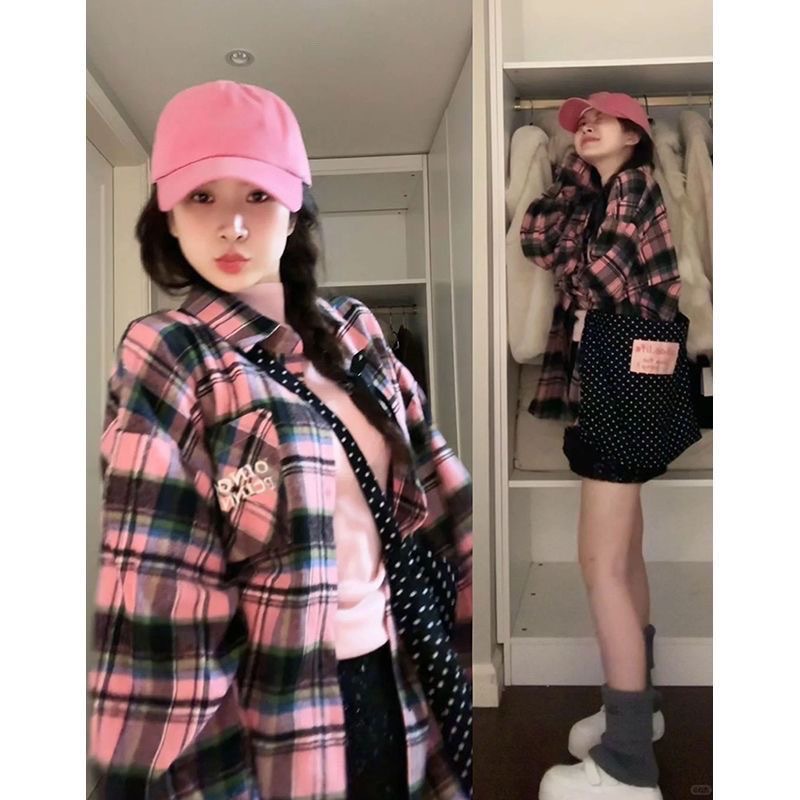 • YC62 핑크#코튼 체크 무늬 셔츠