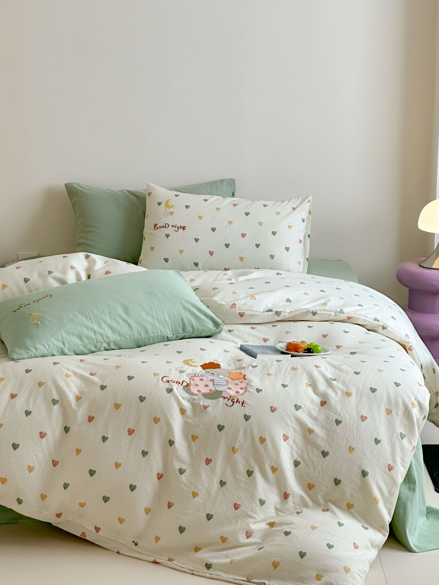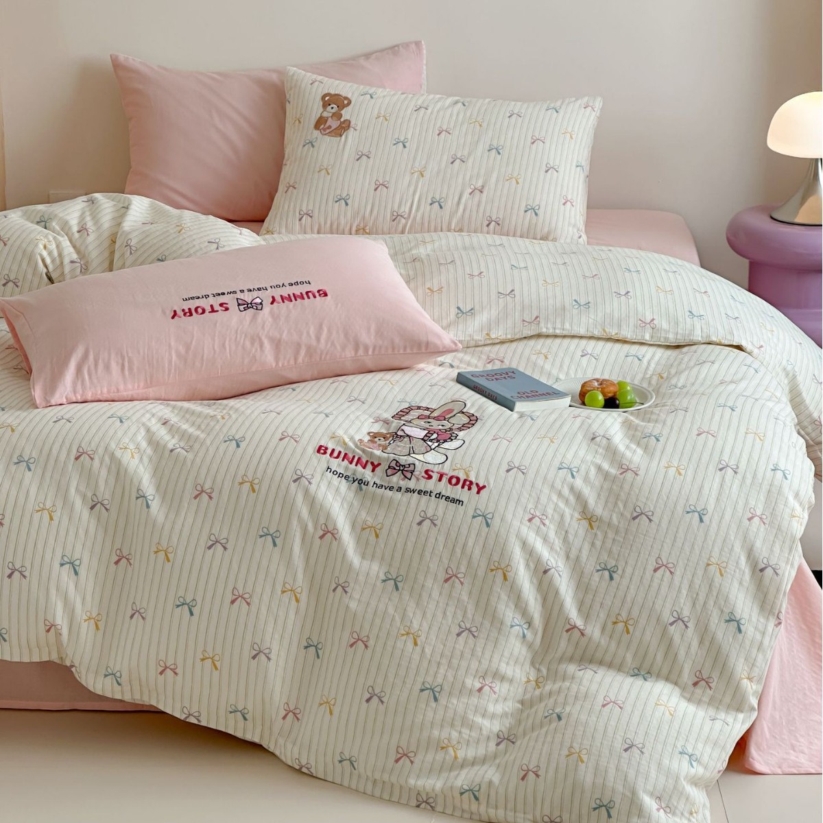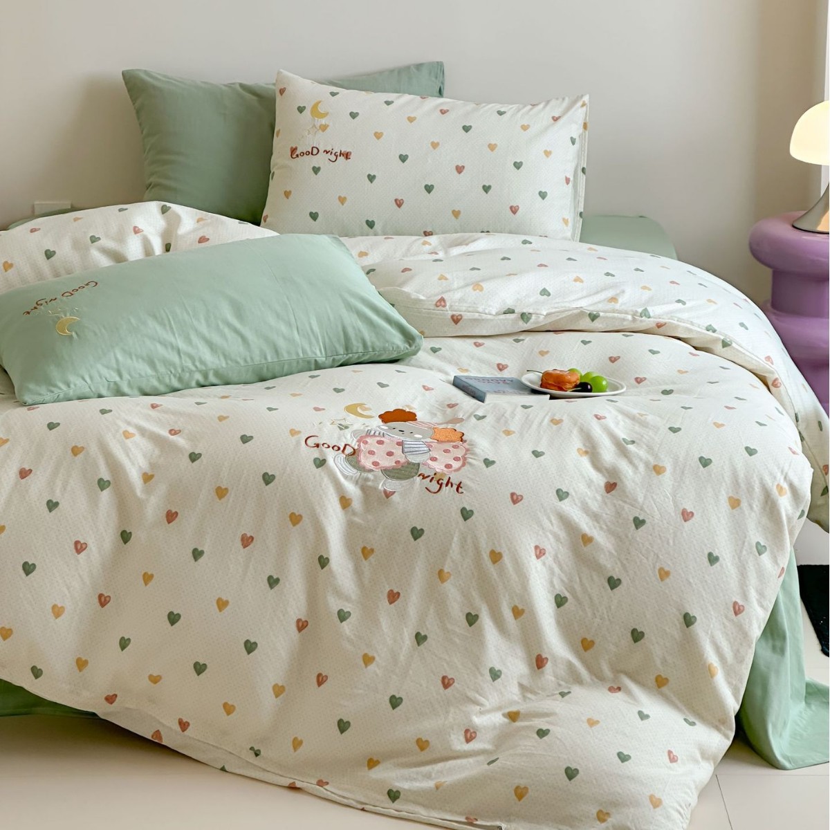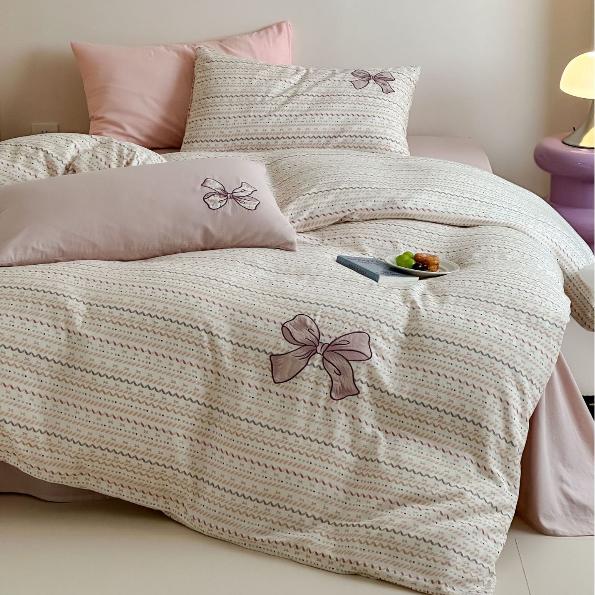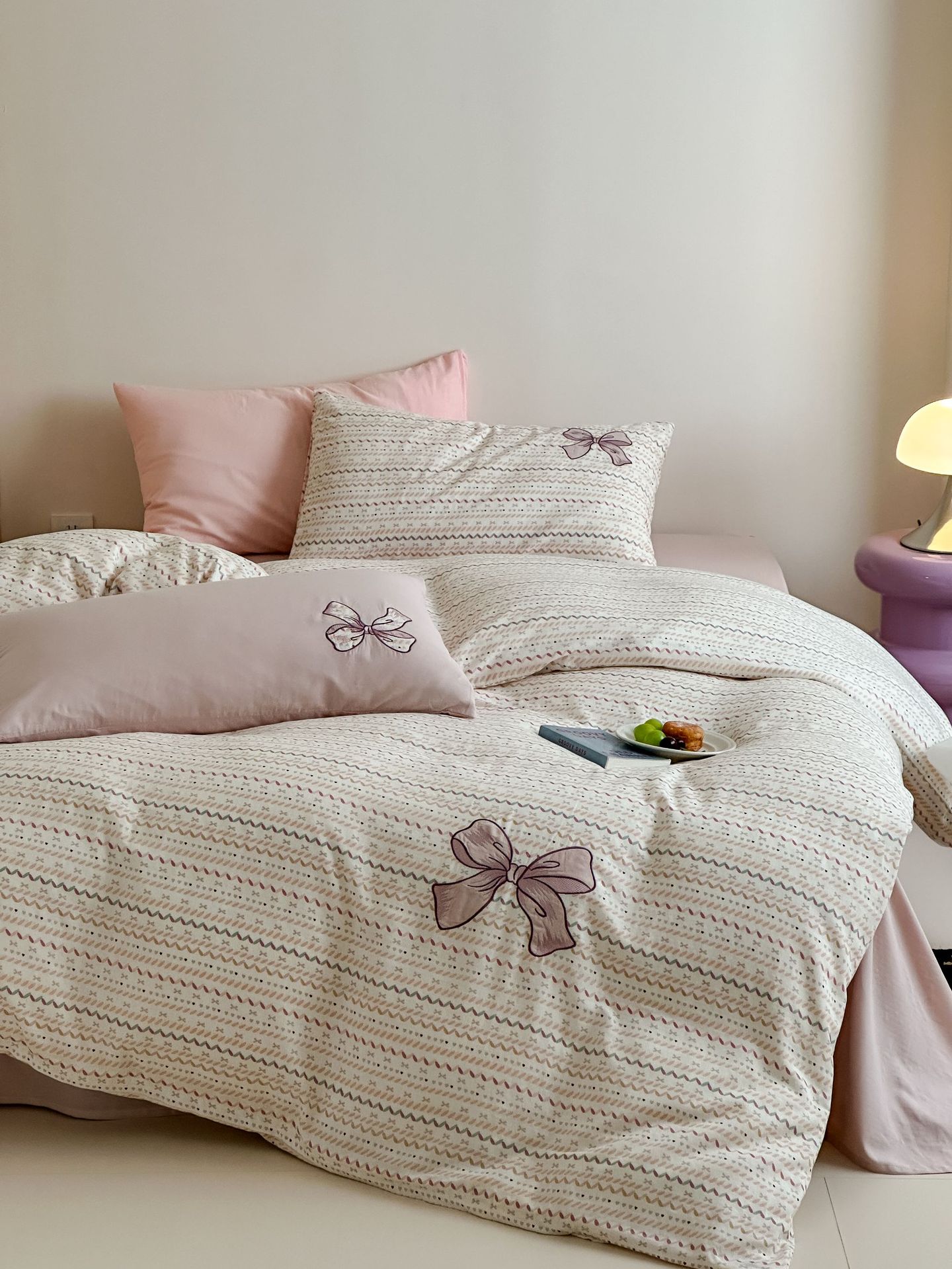 작은 신선한 면 더블 레이어 원사 4 세트 활 자수 코튼 퀼트 커버 기숙사 3 피스 침구