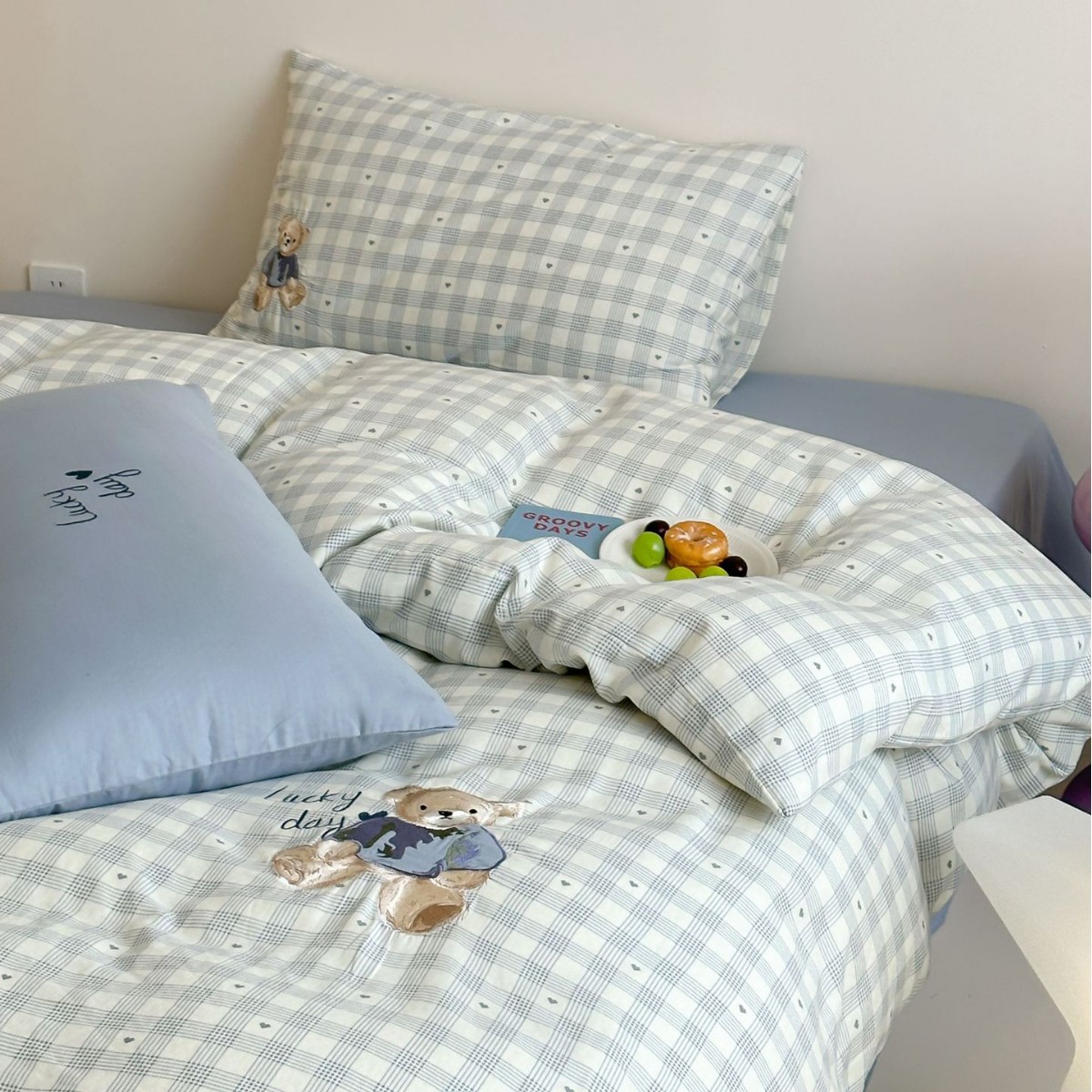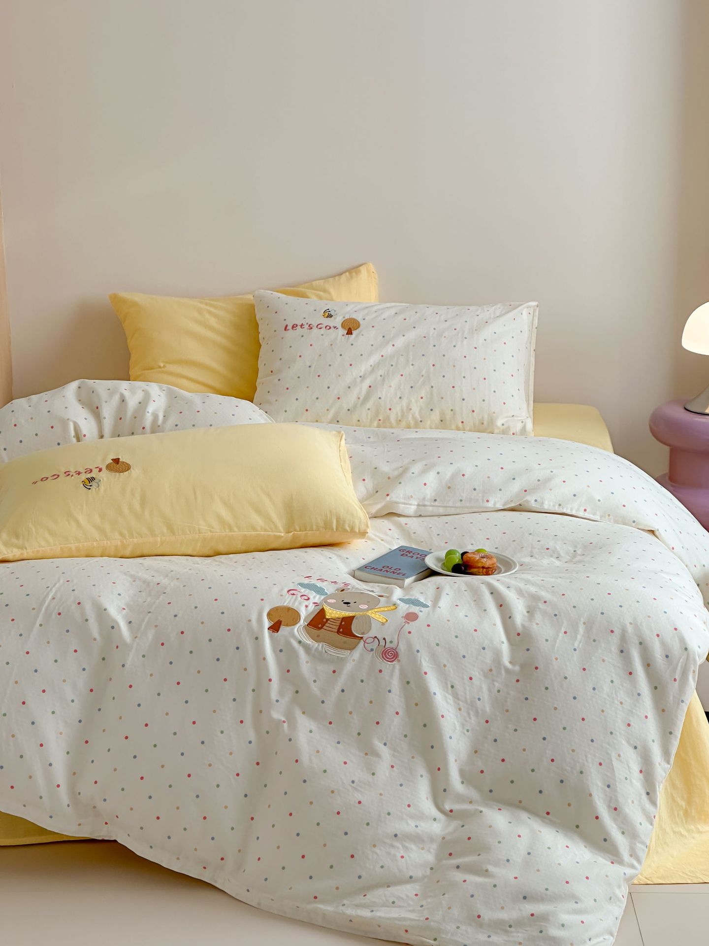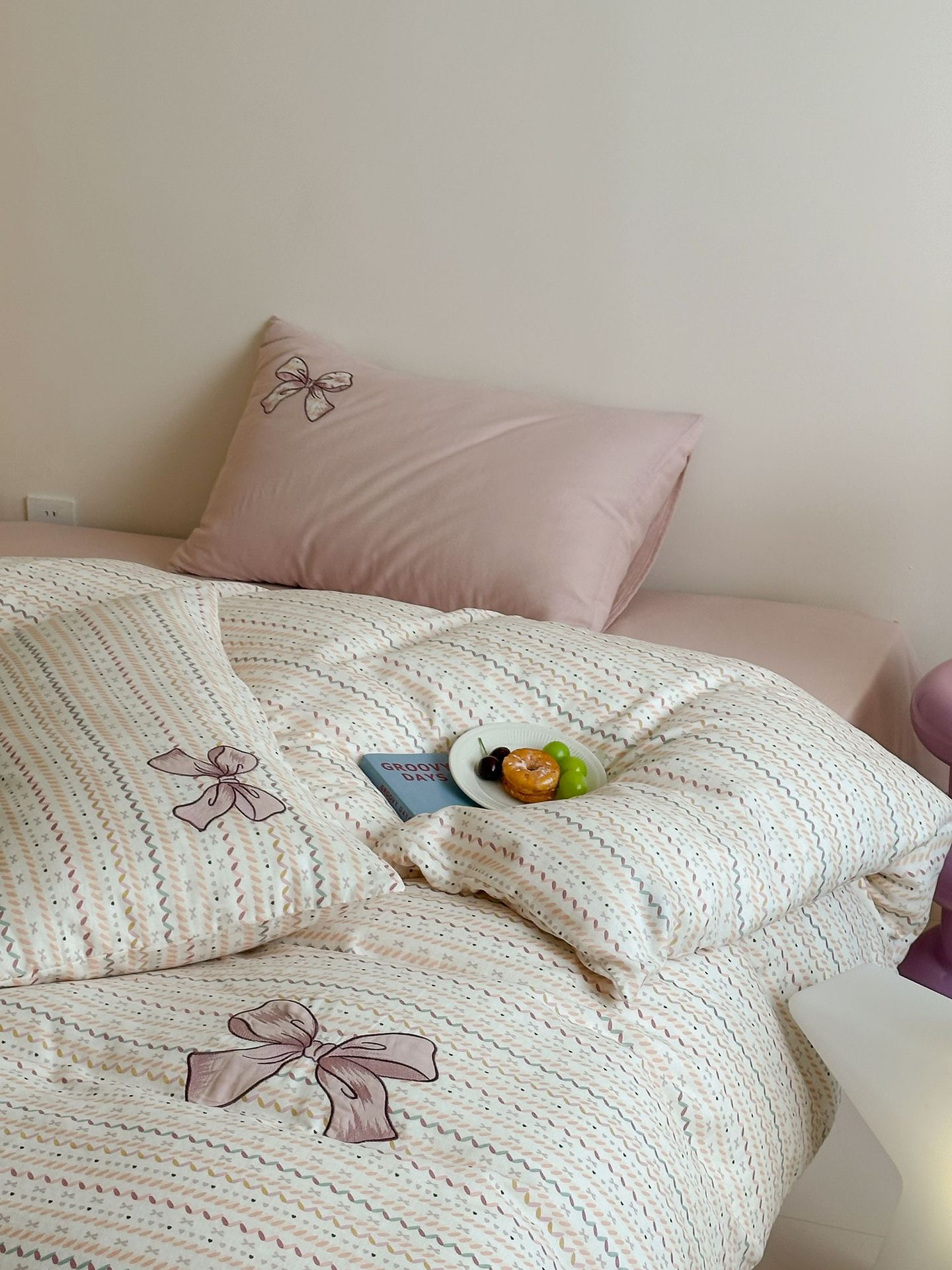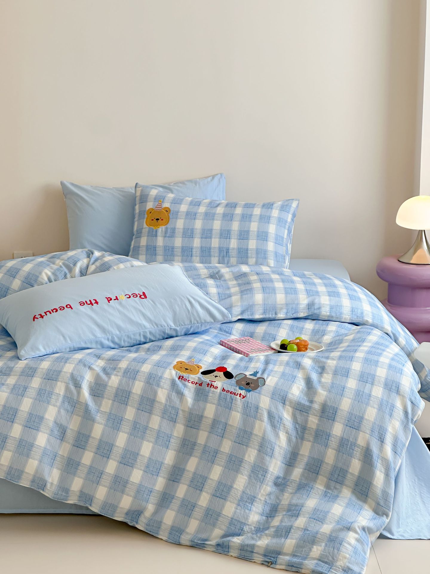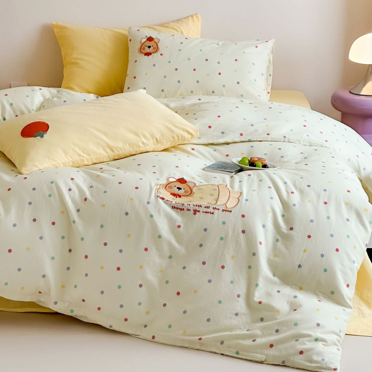 작은 신선한 면 더블 레이어 원사 4 세트 활 자수 코튼 퀼트 커버 기숙사 3 피스 침구