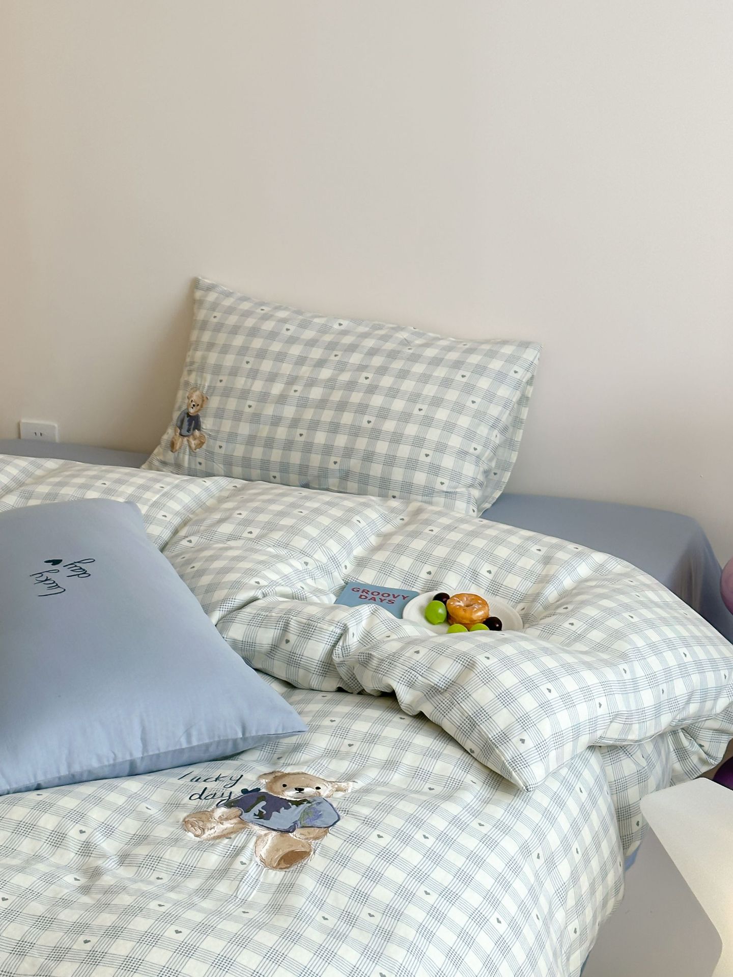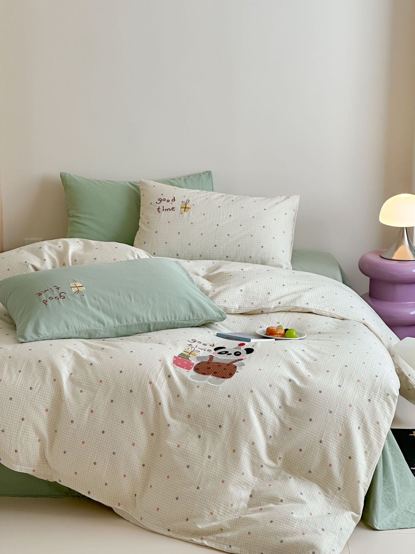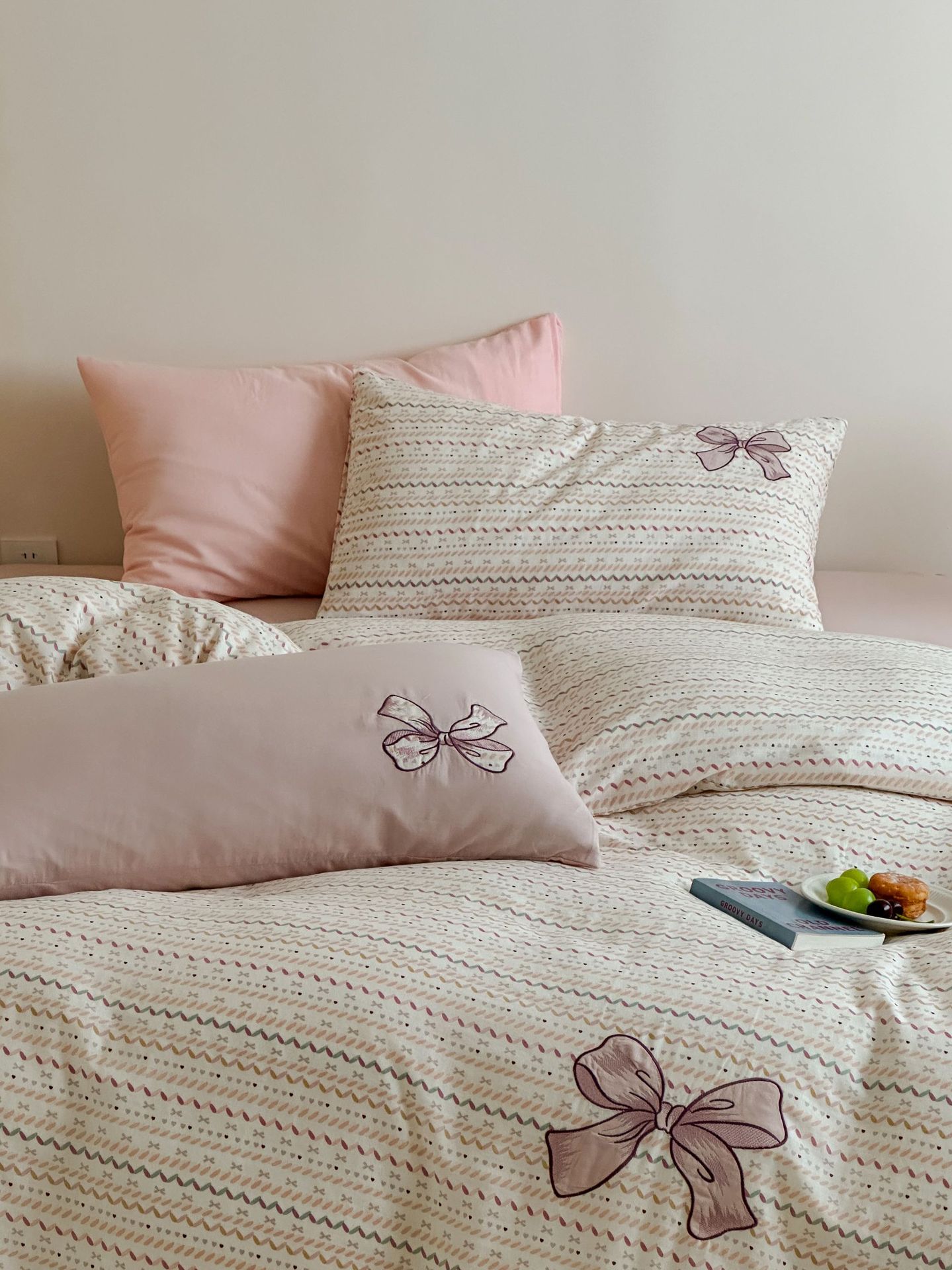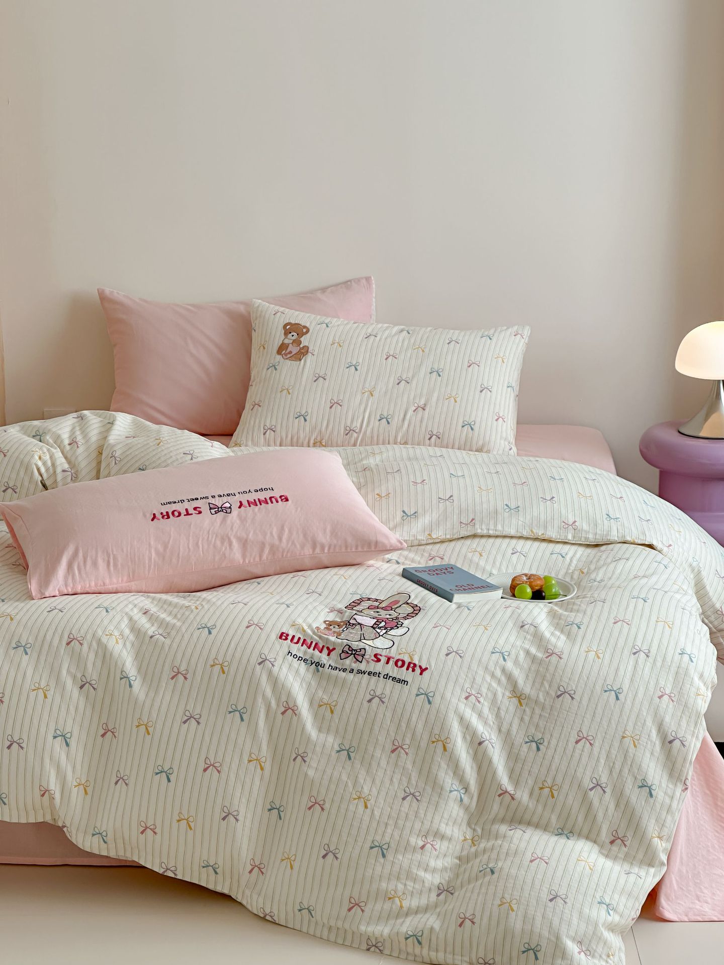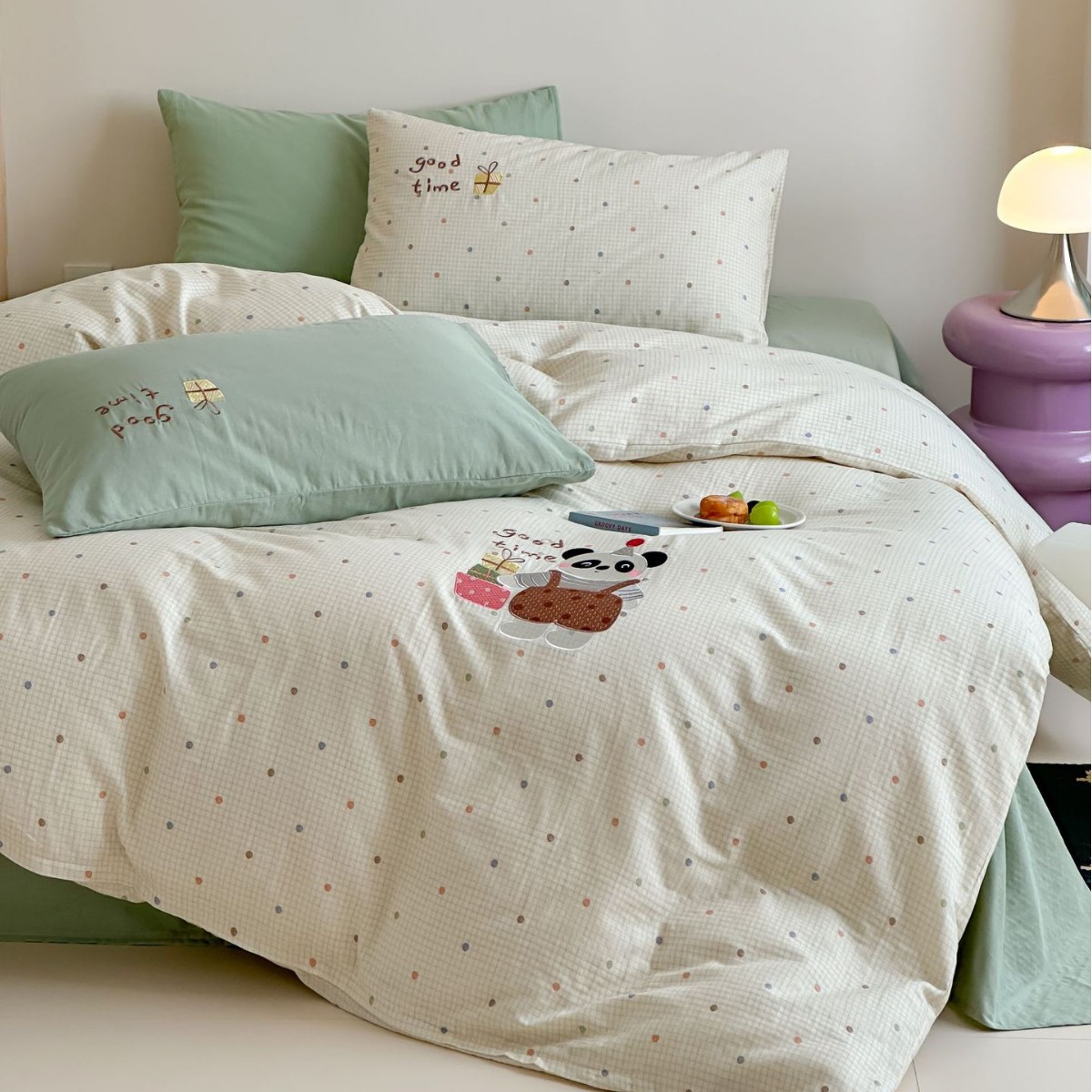 작은 신선한 면 더블 레이어 원사 4 세트 활 자수 코튼 퀼트 커버 기숙사 3 피스 침구